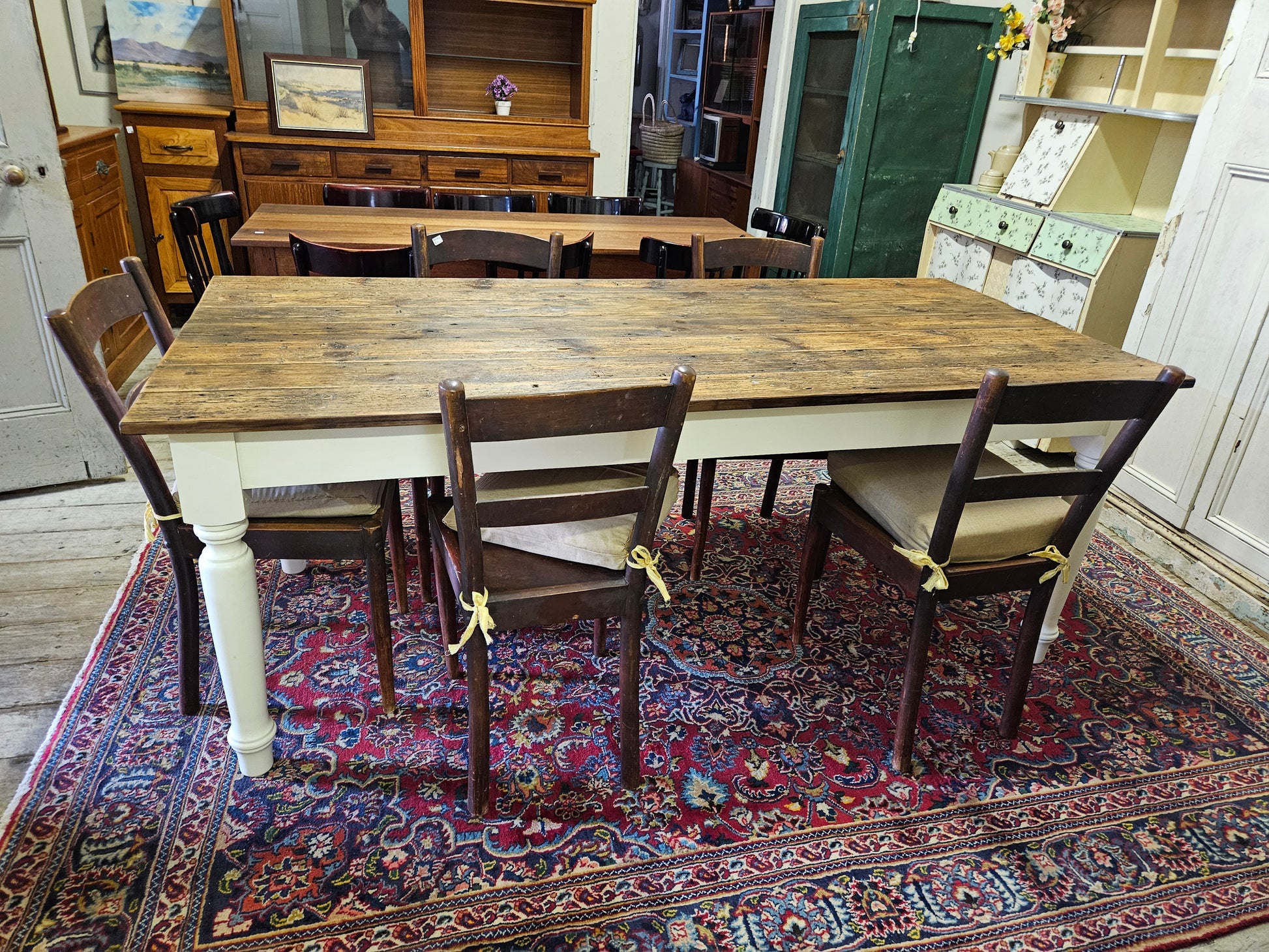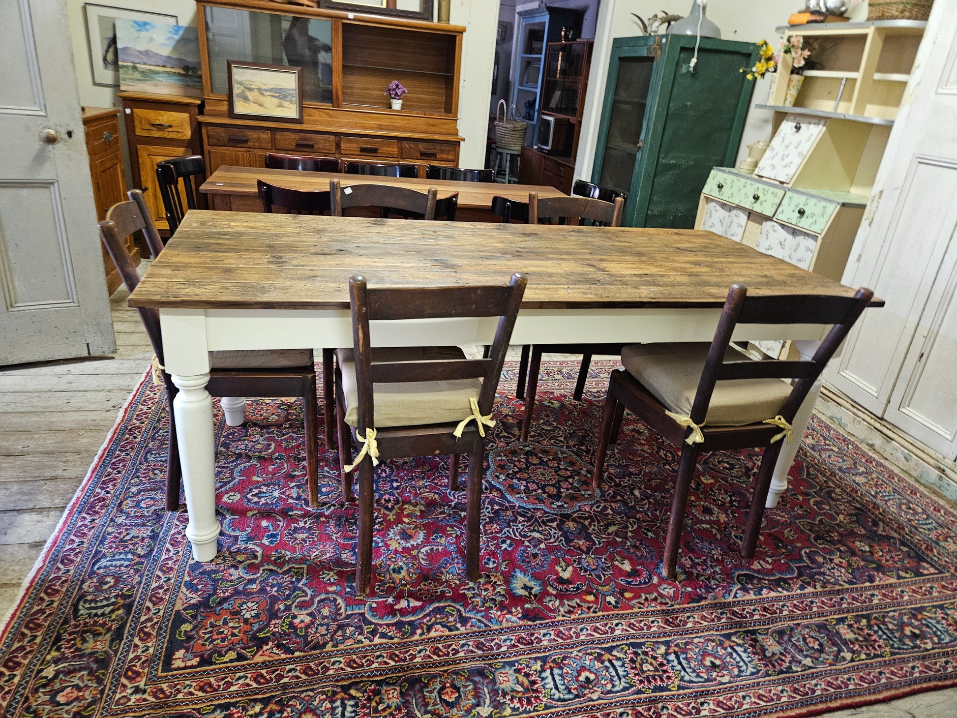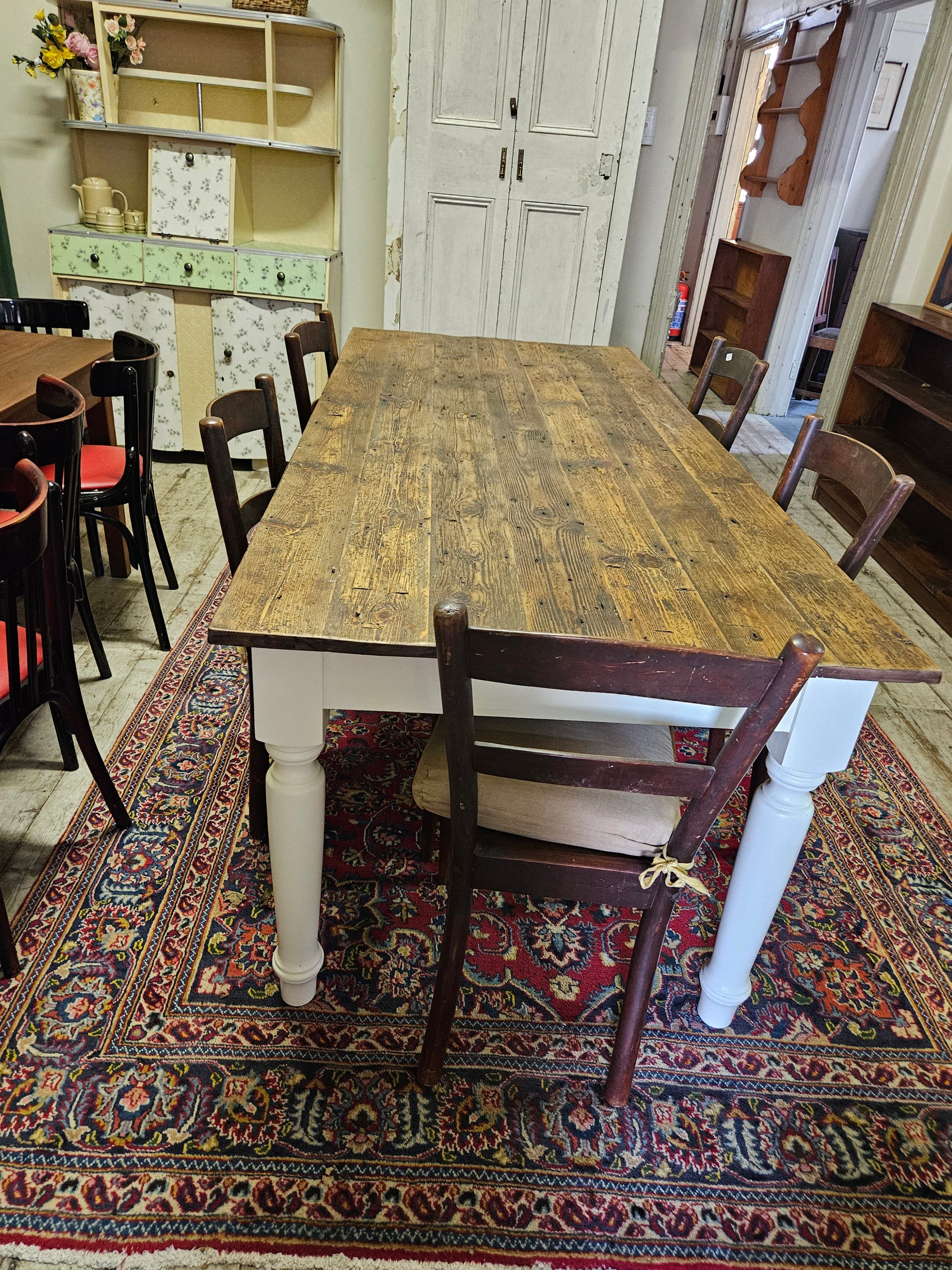 8 seater dining room table. Old oregan top with beautiful patina and painted, turned legs.