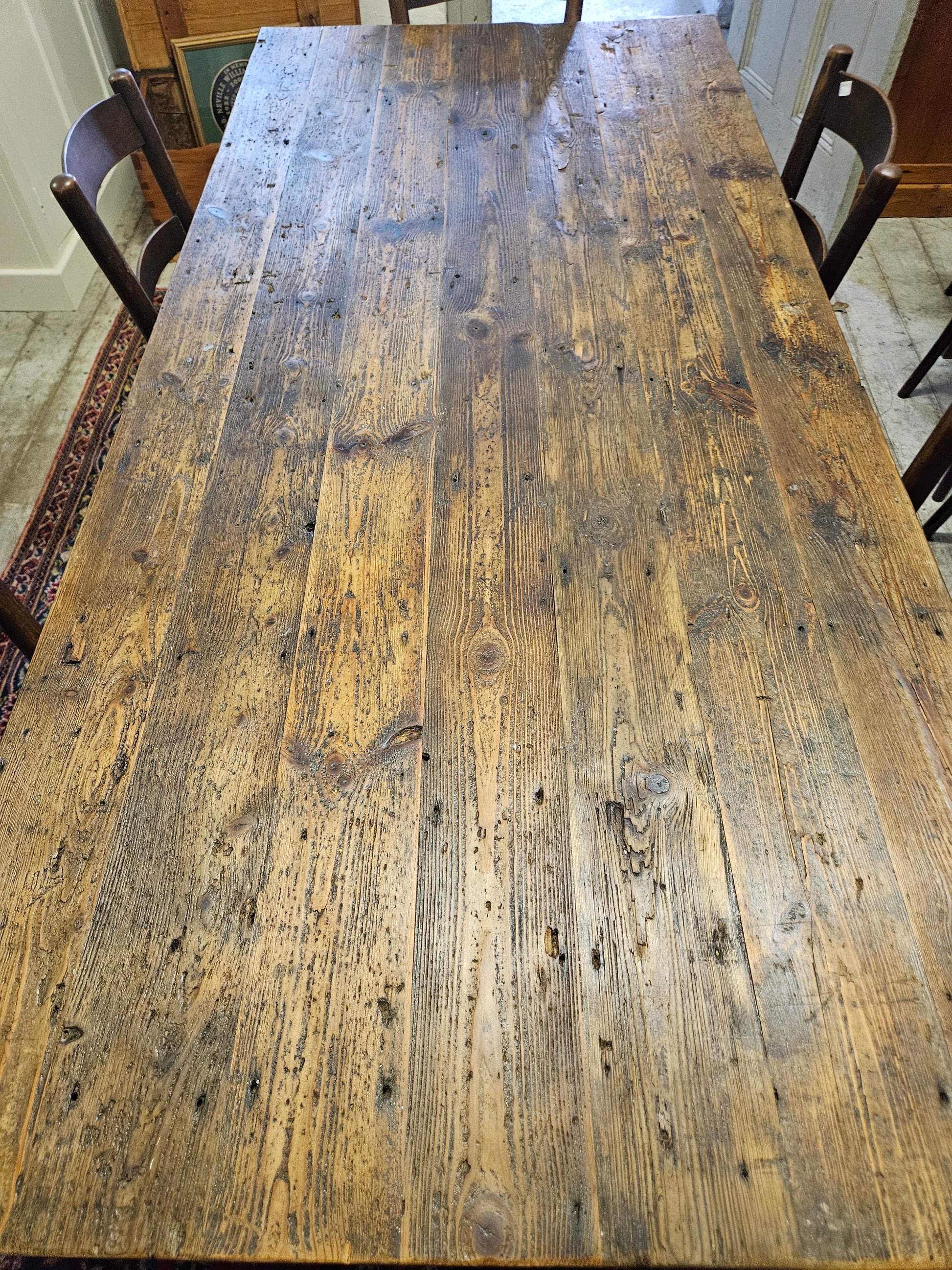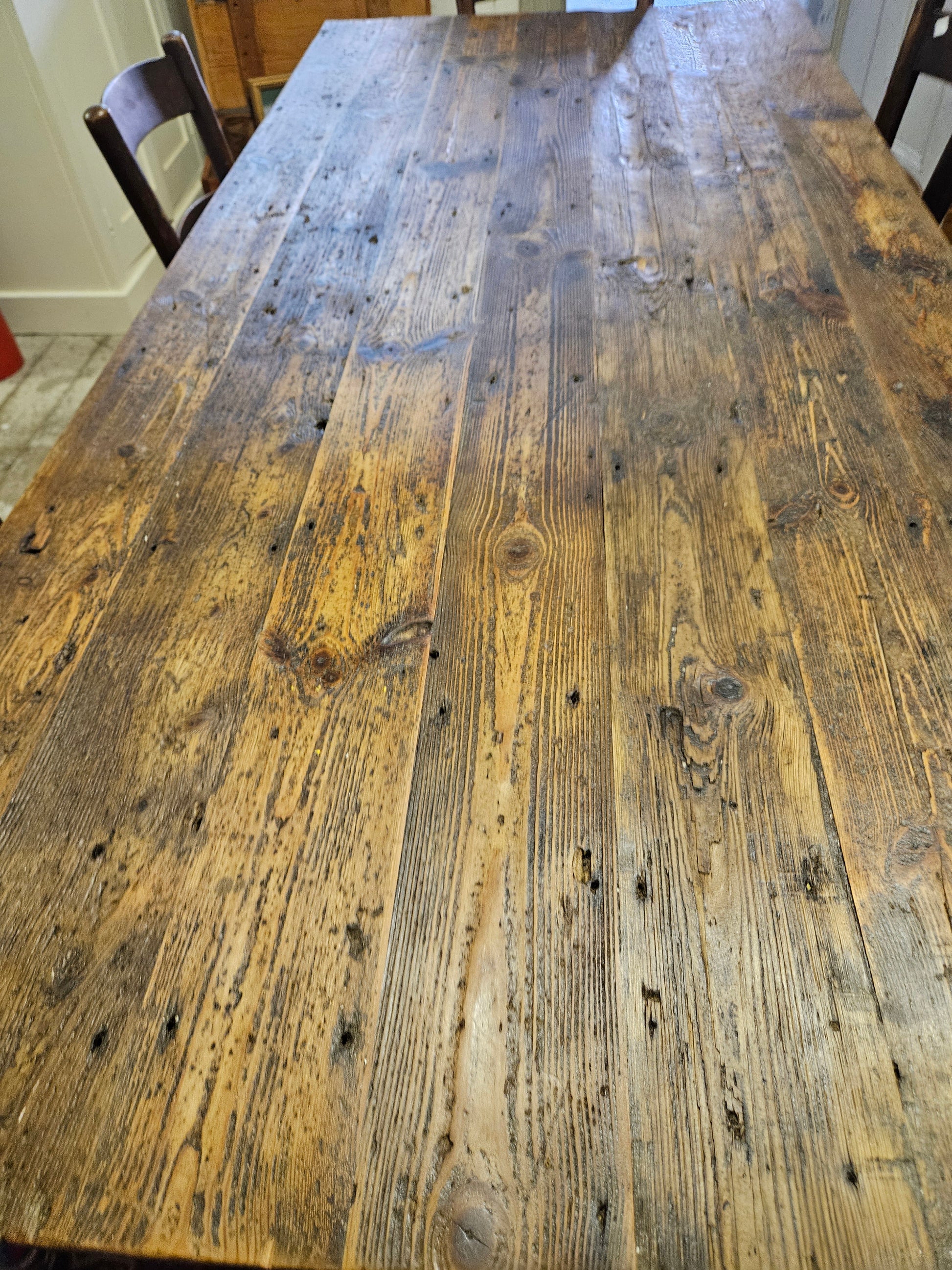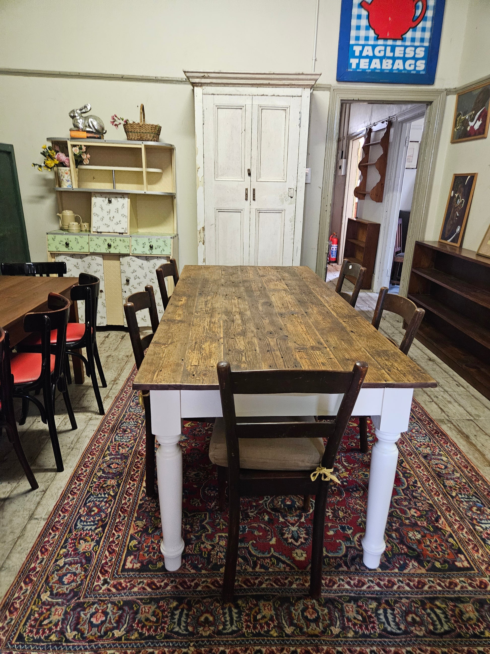 8 seater dining room table. Old oregan top with beautiful patina and painted, turned legs.