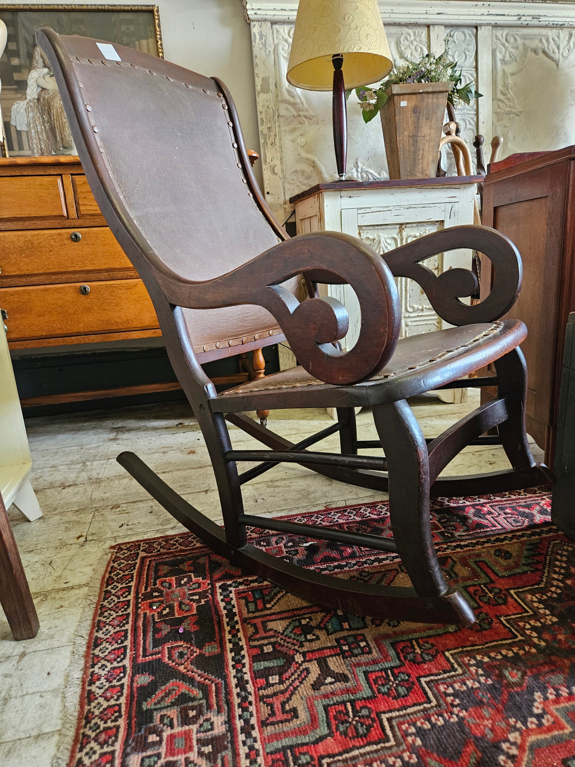 Early 1900, Stunning antique rocking chair with leather seat and back. Very sturdy and comfortable. Beautiful condition, very well made.