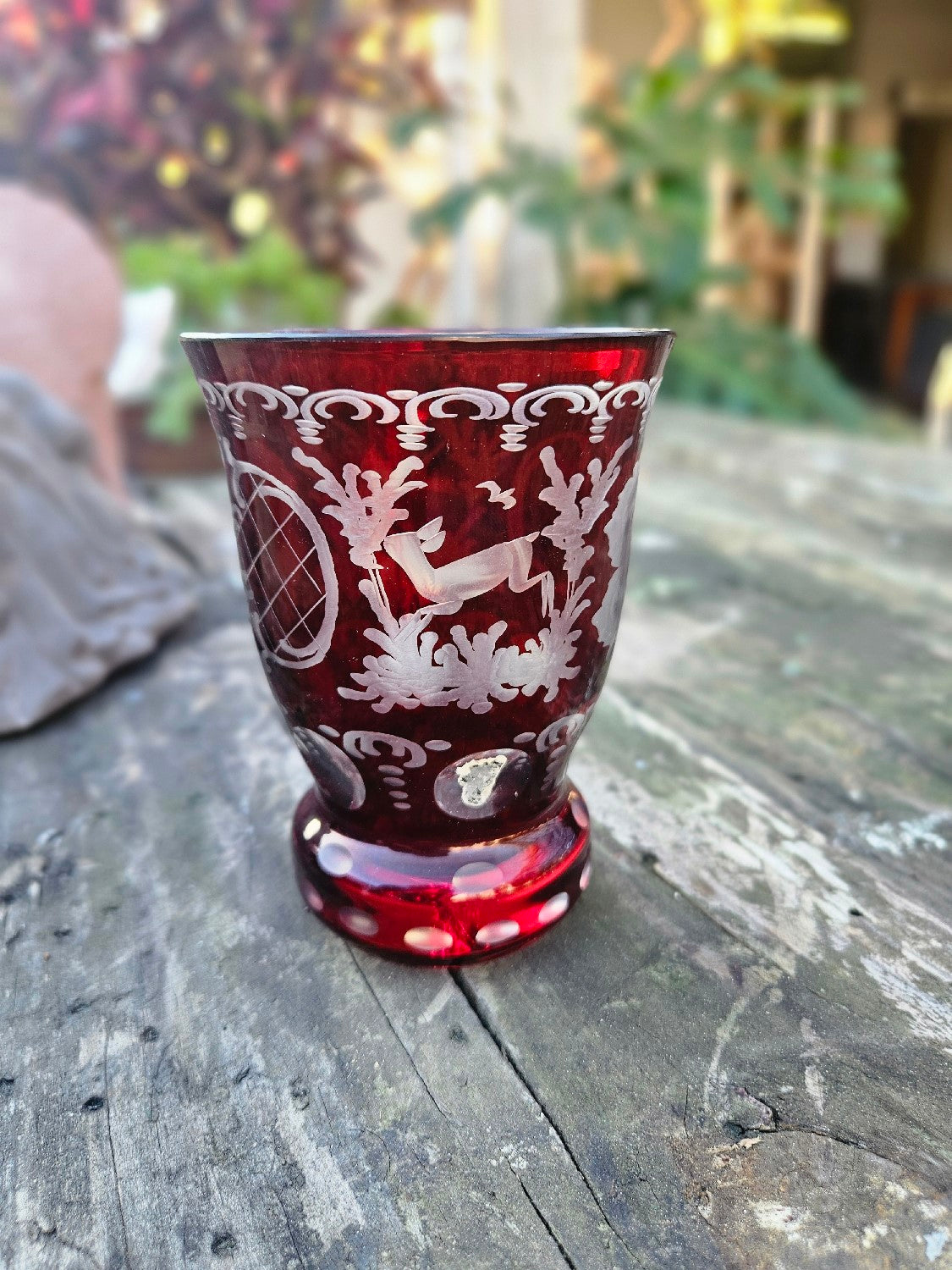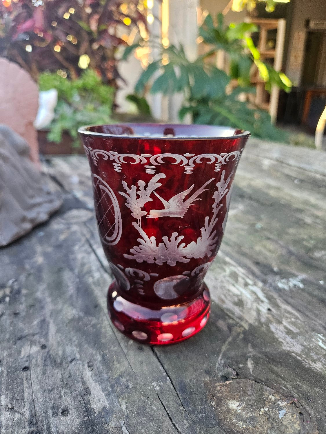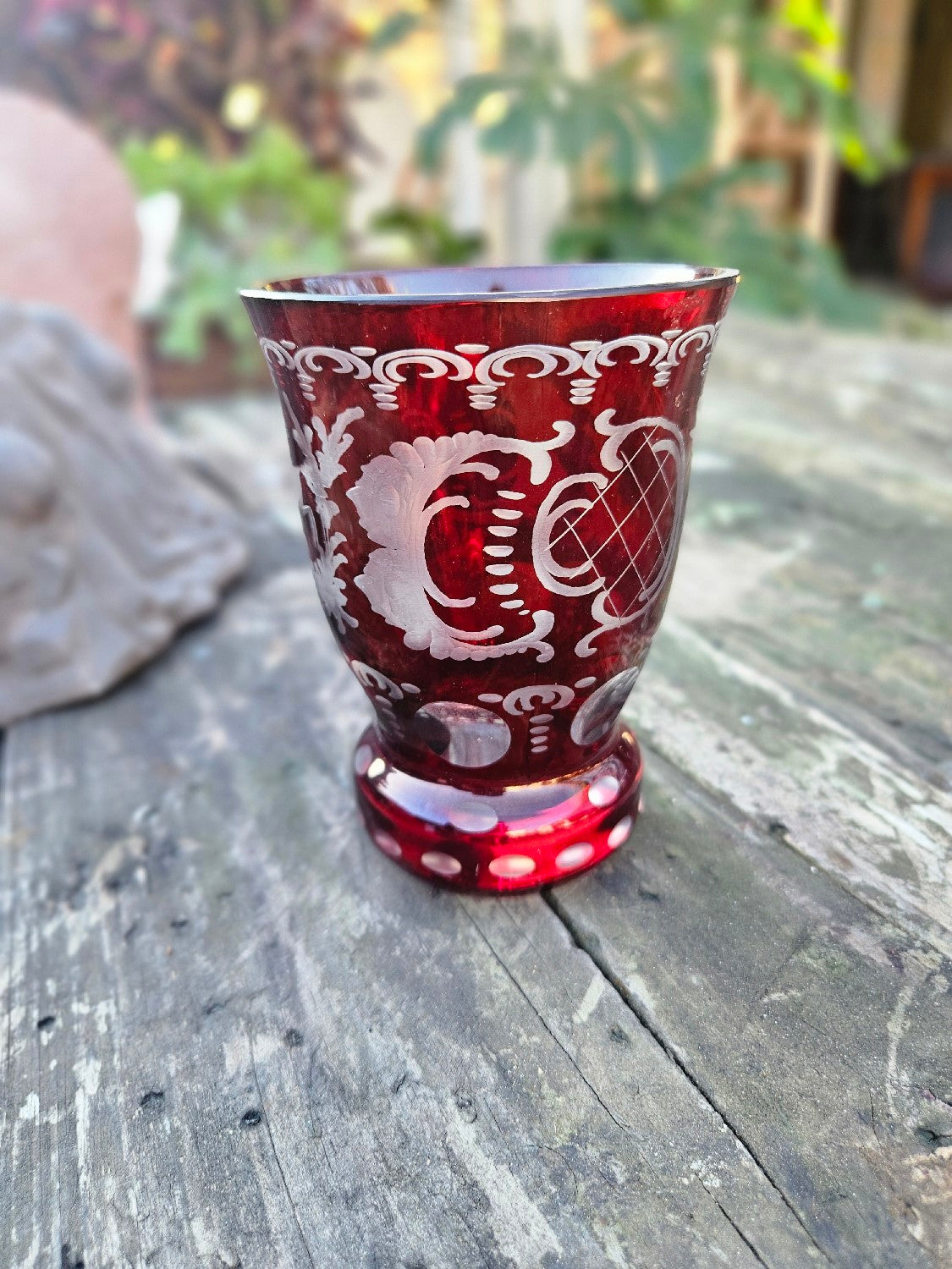 Antique Ruby Red Bohemian glass "cut to clear" vase or tumbler
