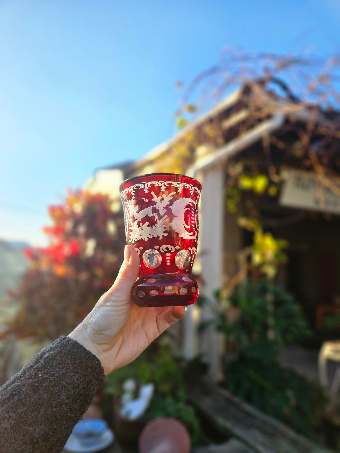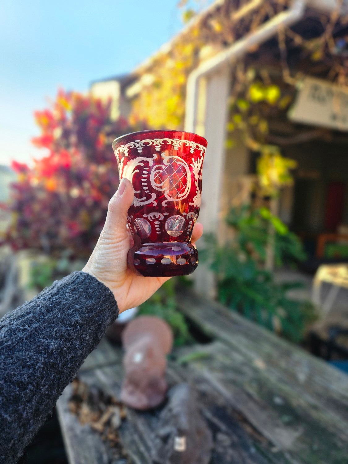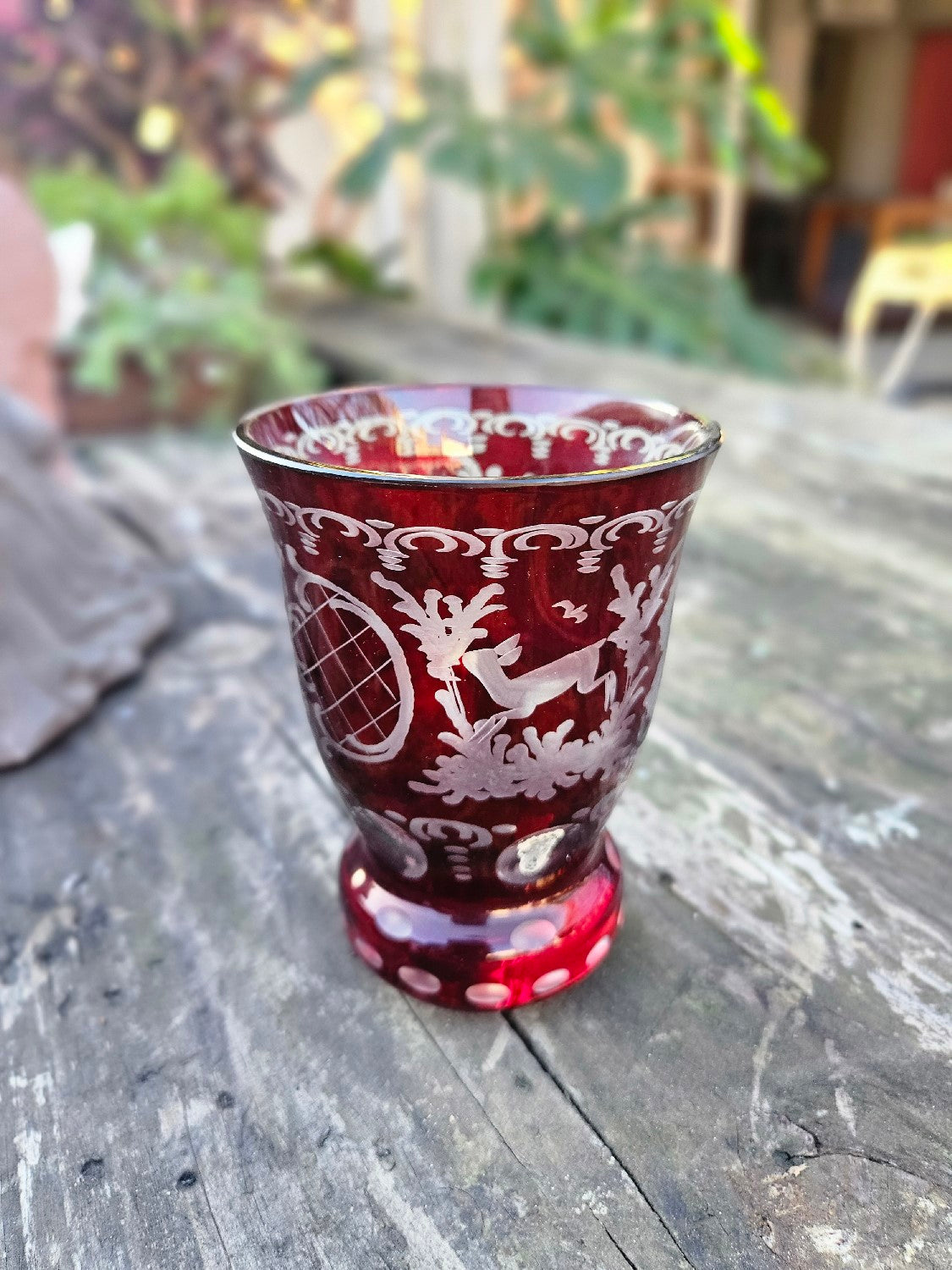 Antique Ruby Red Bohemian glass "cut to clear" vase or tumbler