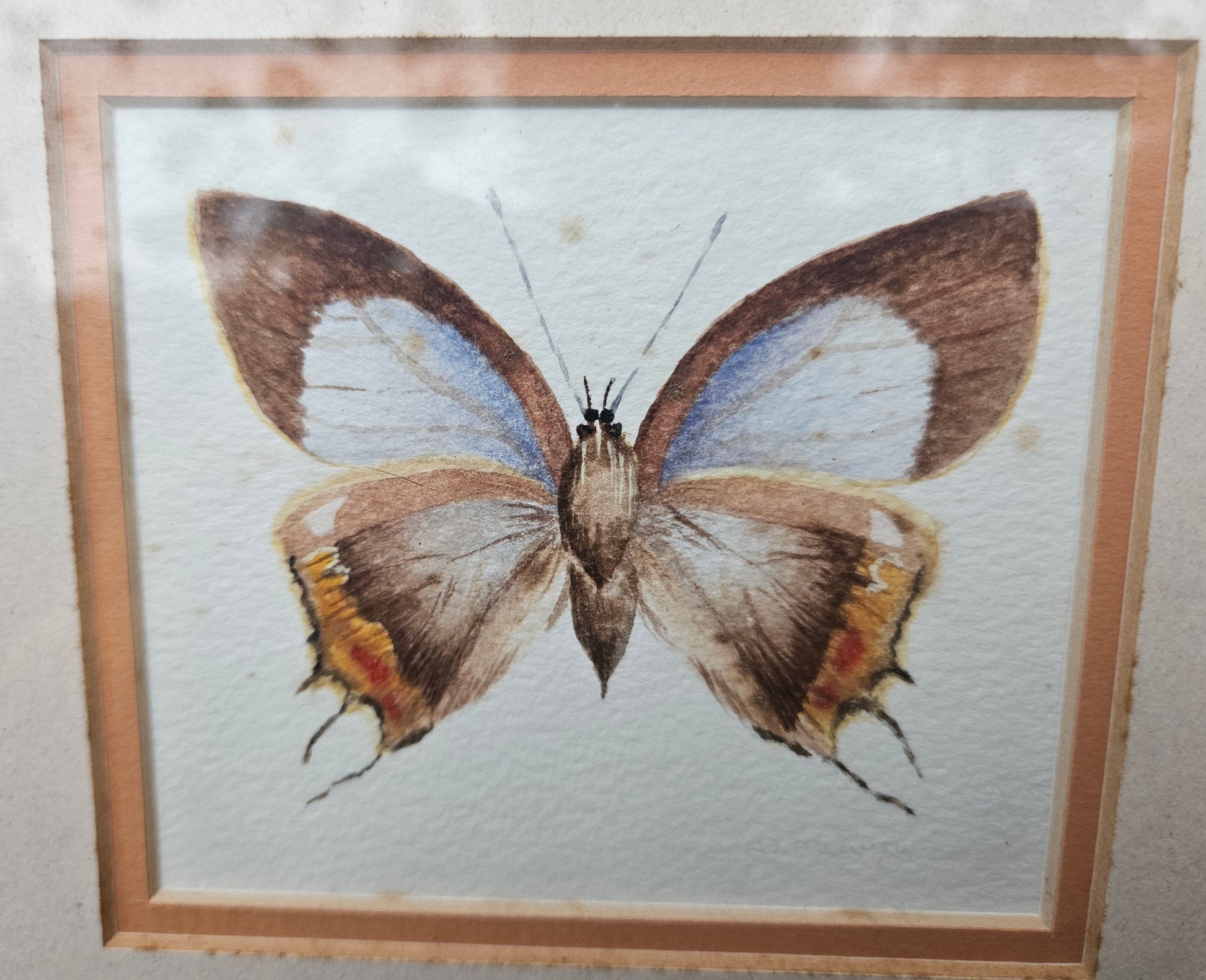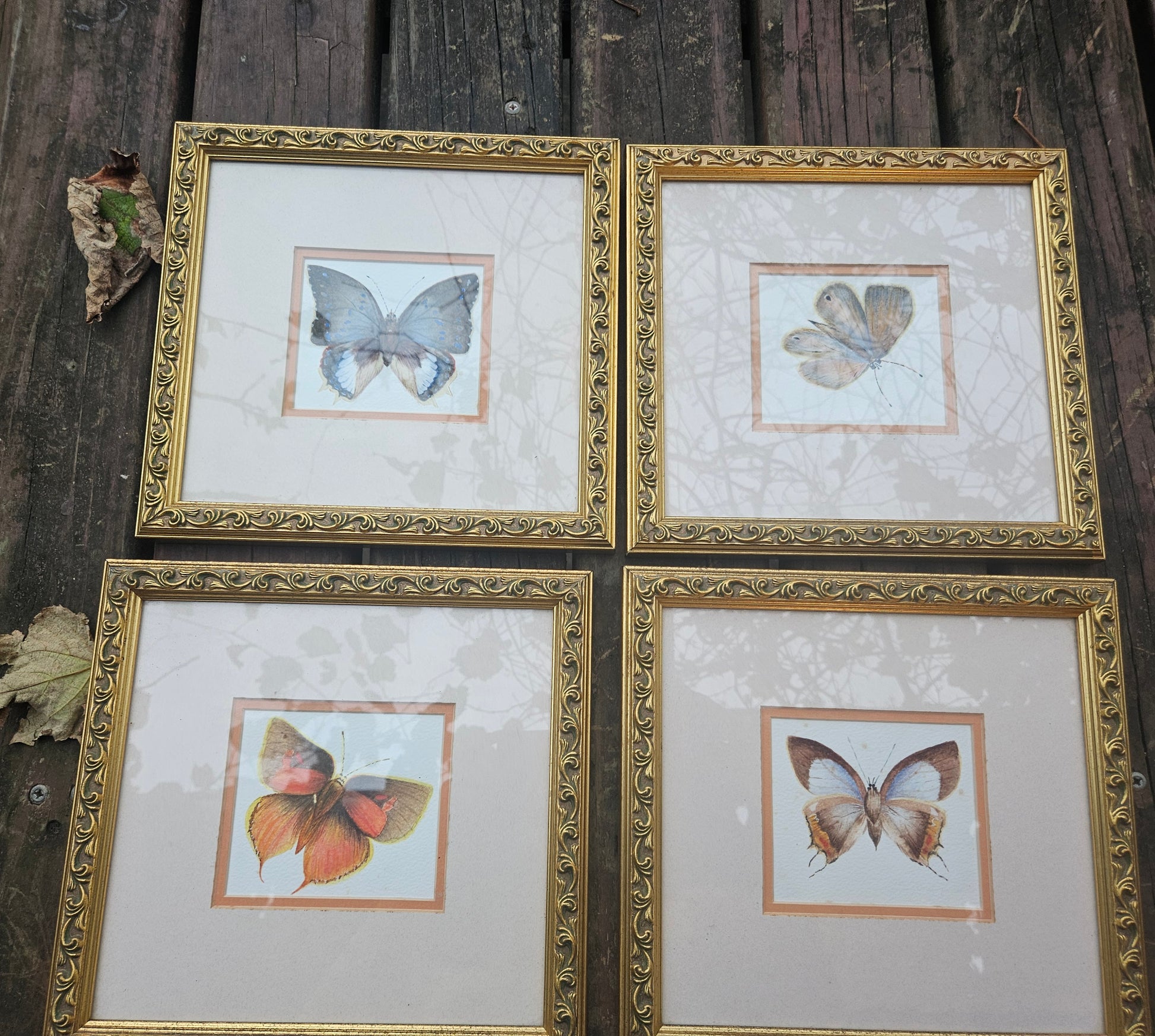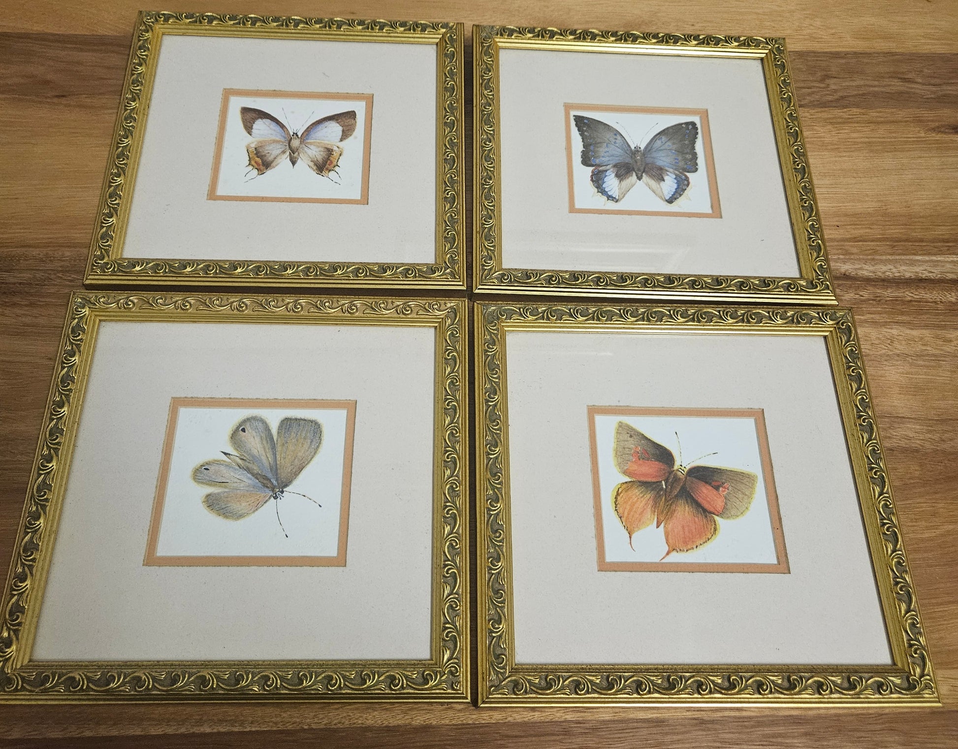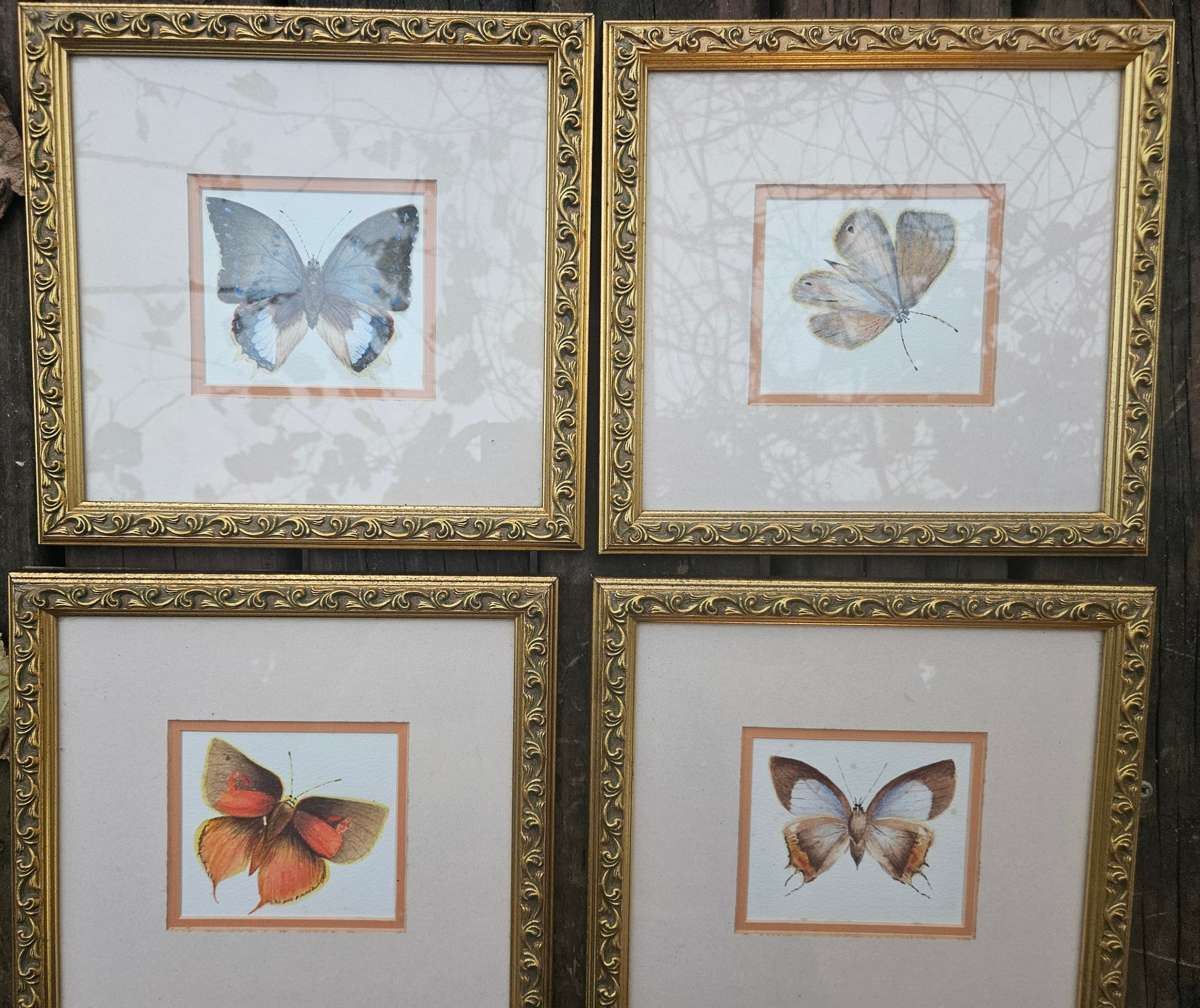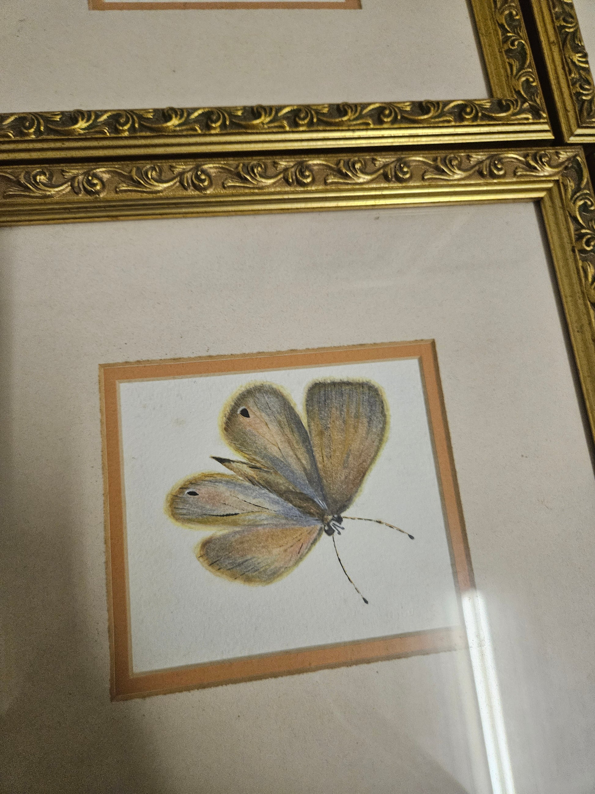 Set of 4 framed butterfly pictures. Look like original watercolour paintings and can see a very feint artist's name on each picture (but just can't make it out).