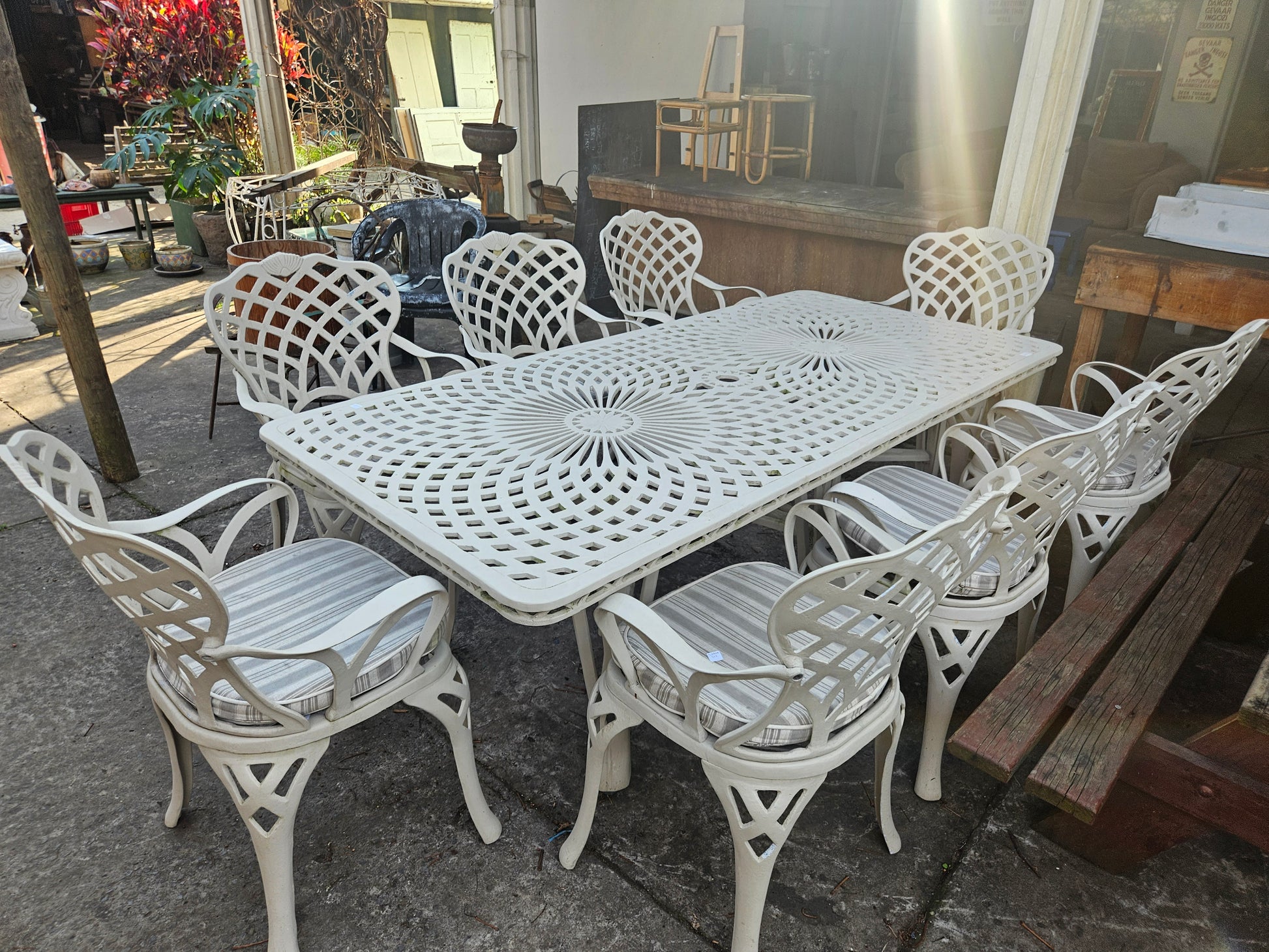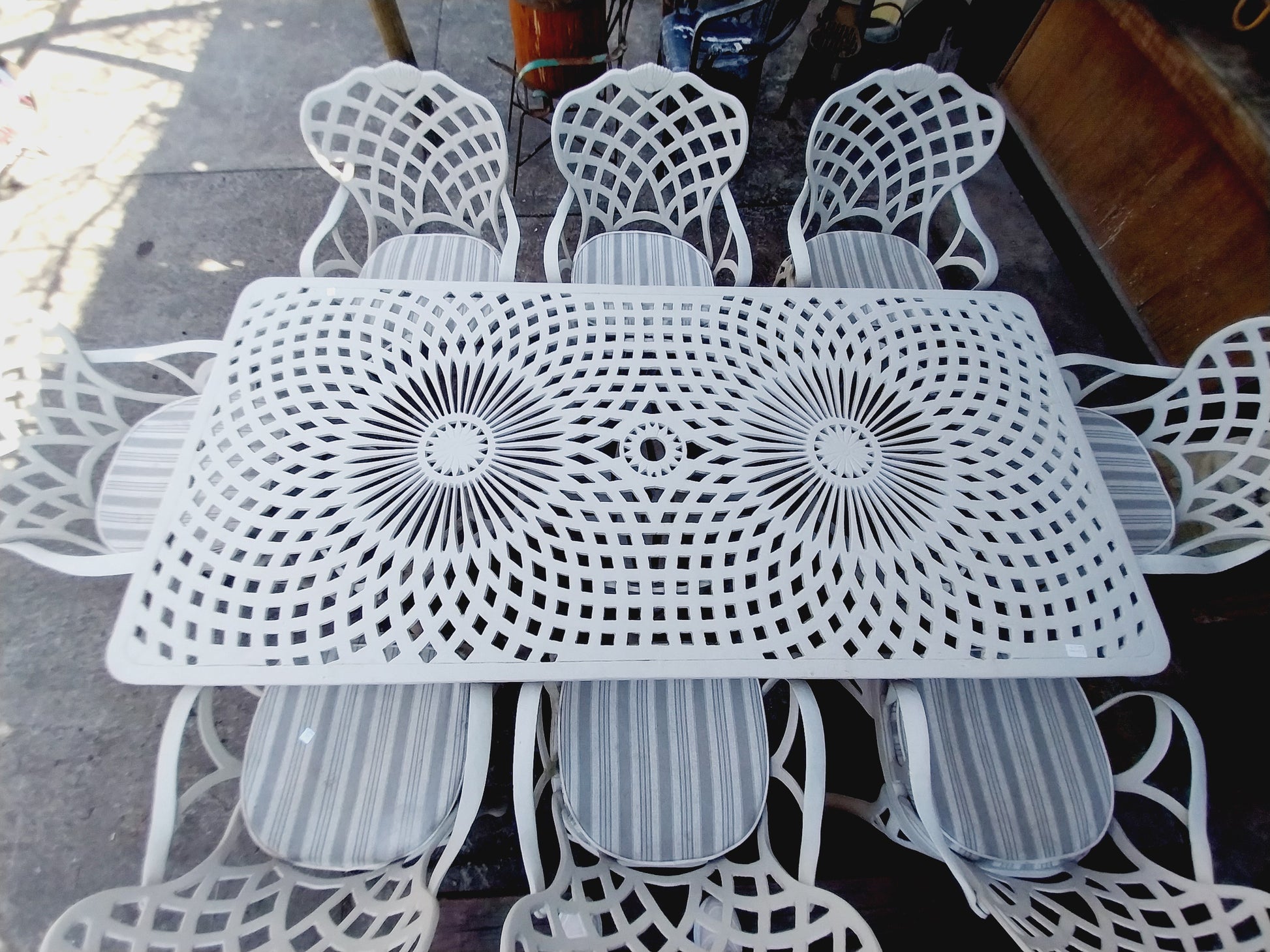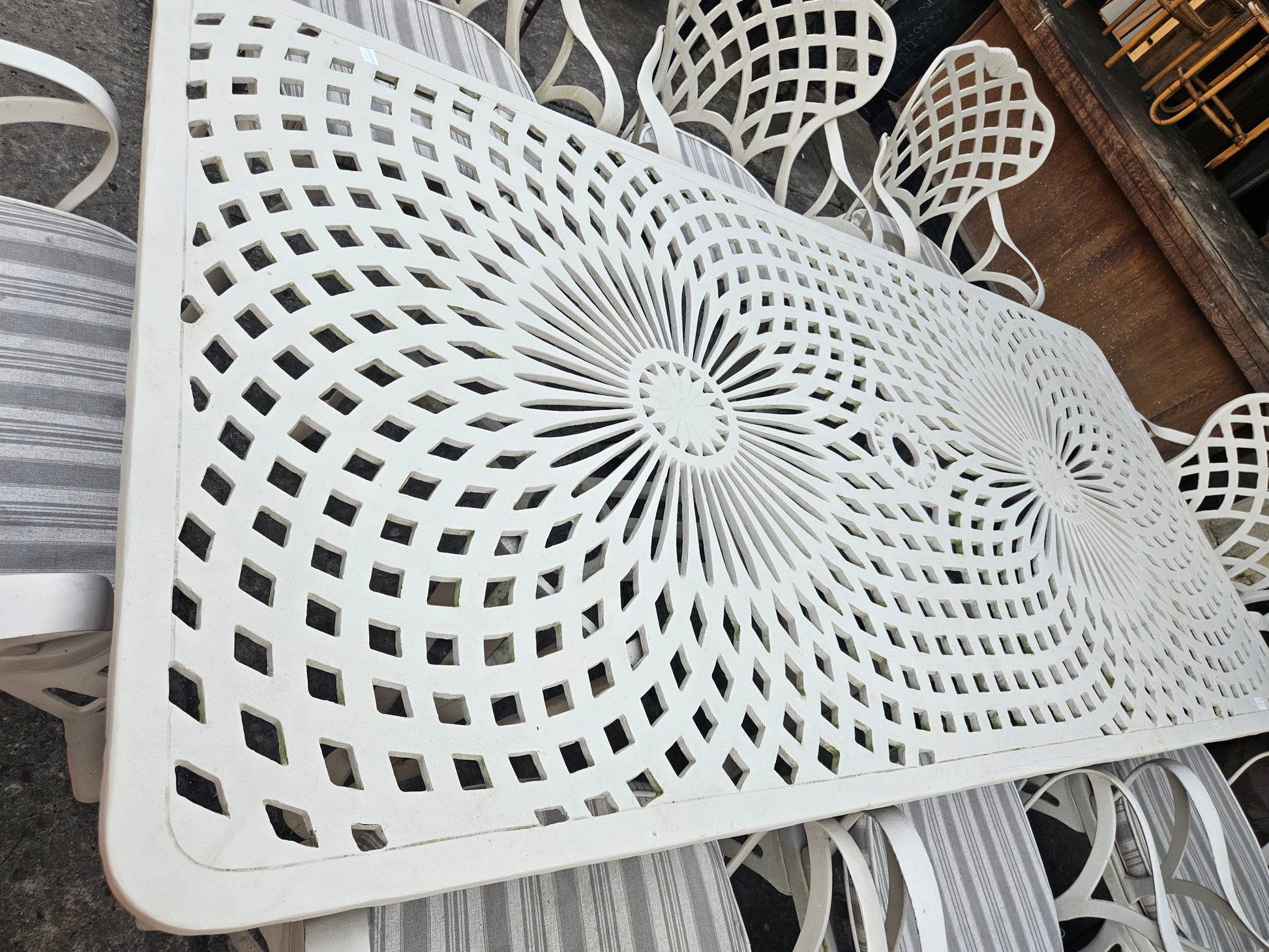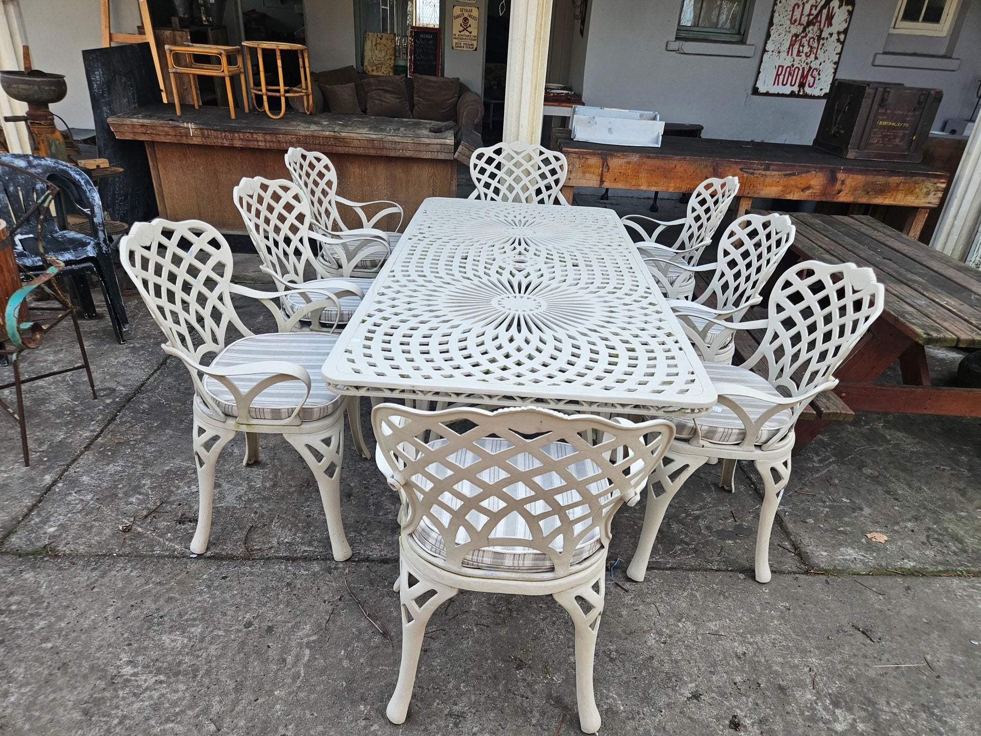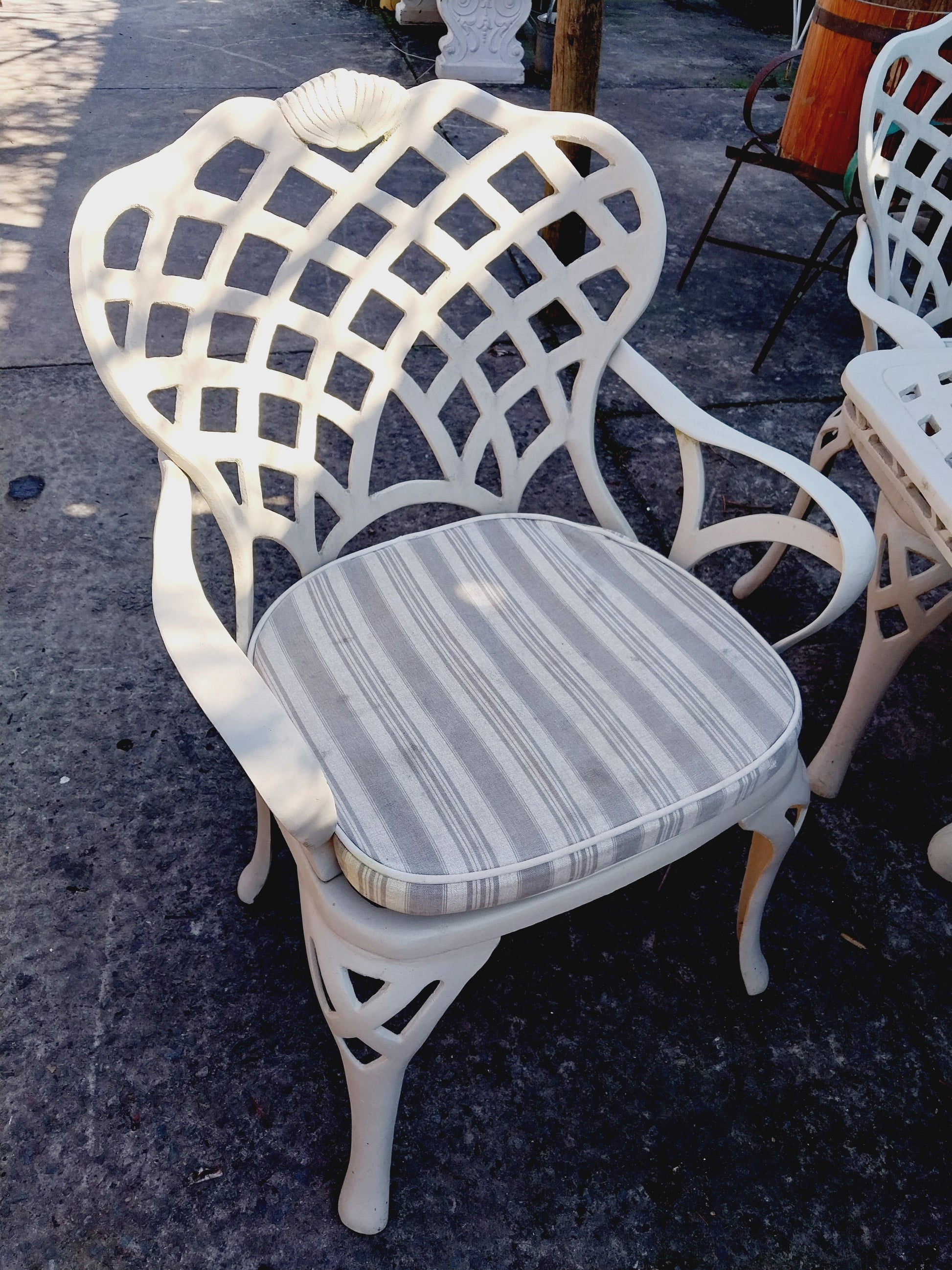 Exquisite Cast aluminium patio set in near perfect condition. Creamy off-white in colour and complete with striped Grey cushions.