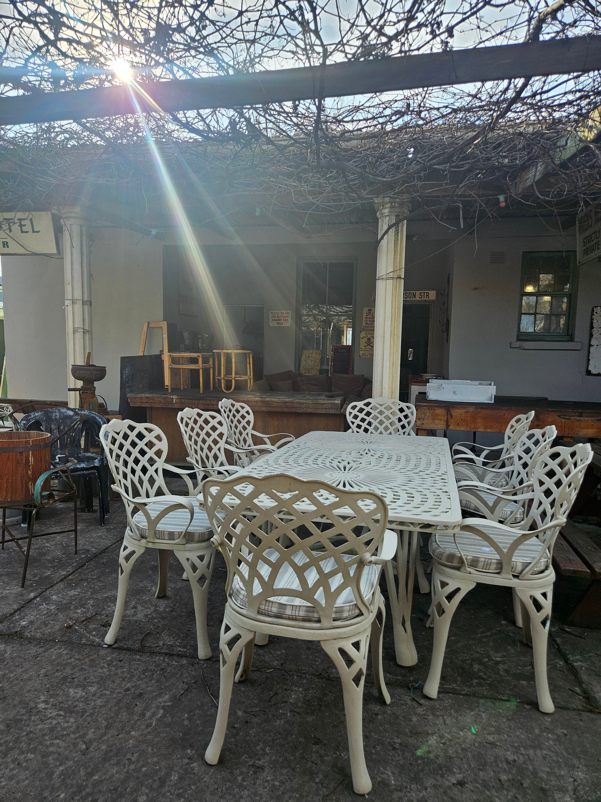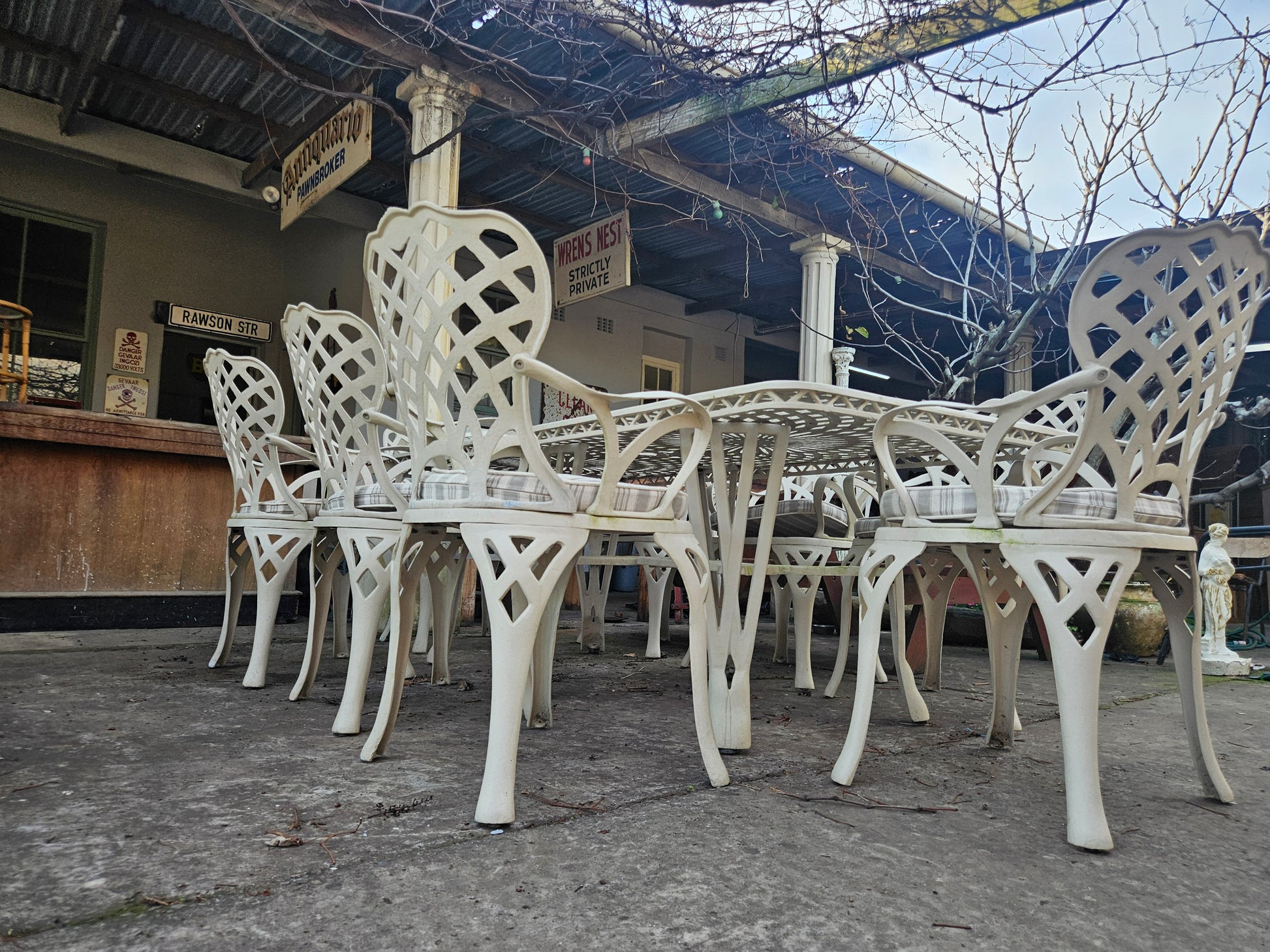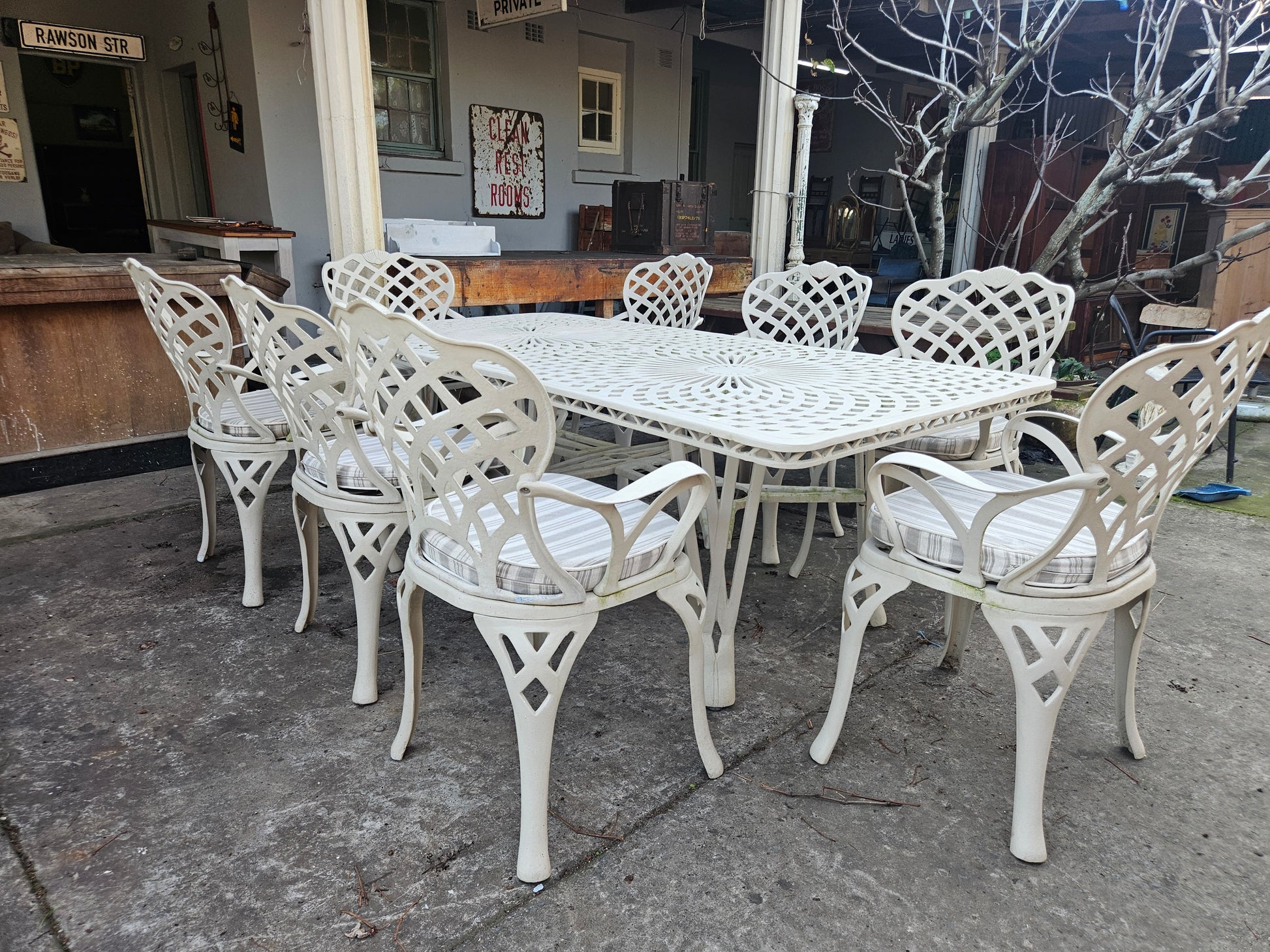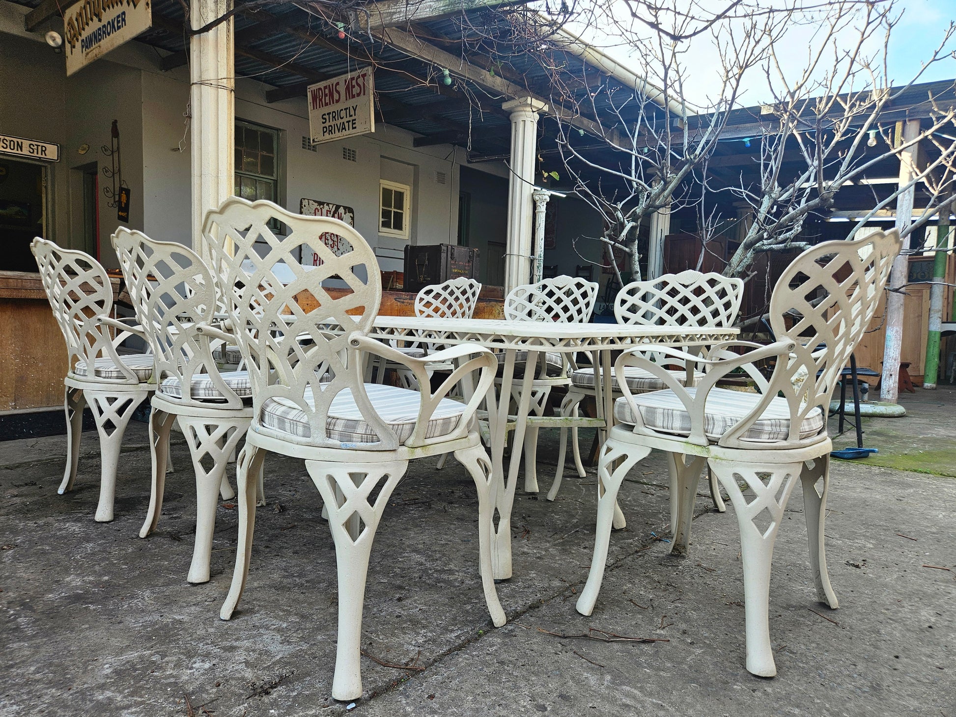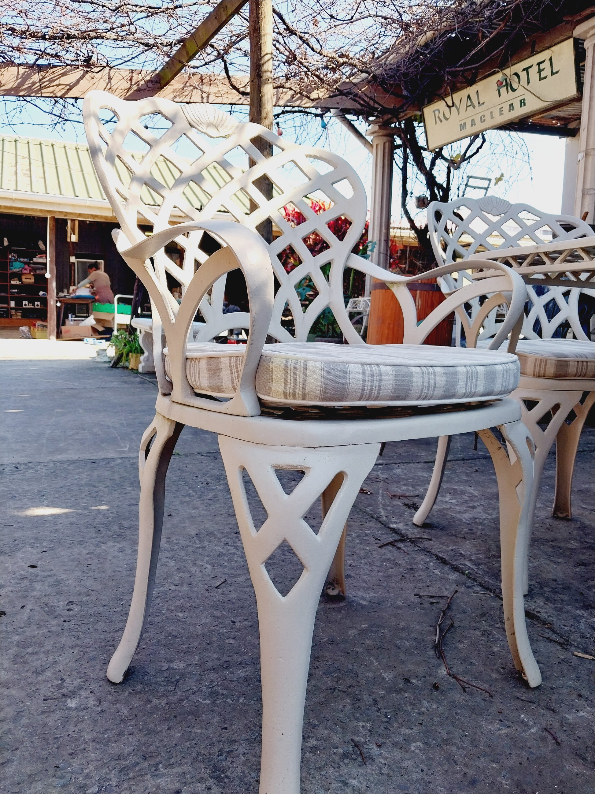 Exquisite Cast aluminium patio set in near perfect condition. Creamy off-white in colour and complete with striped Grey cushions.