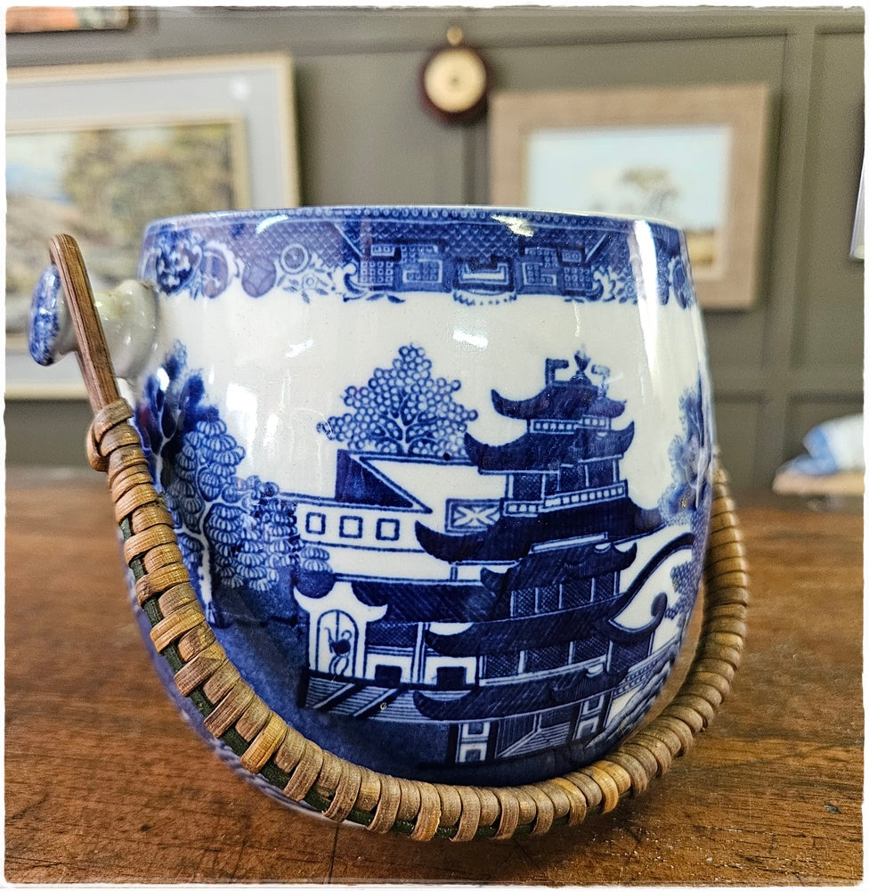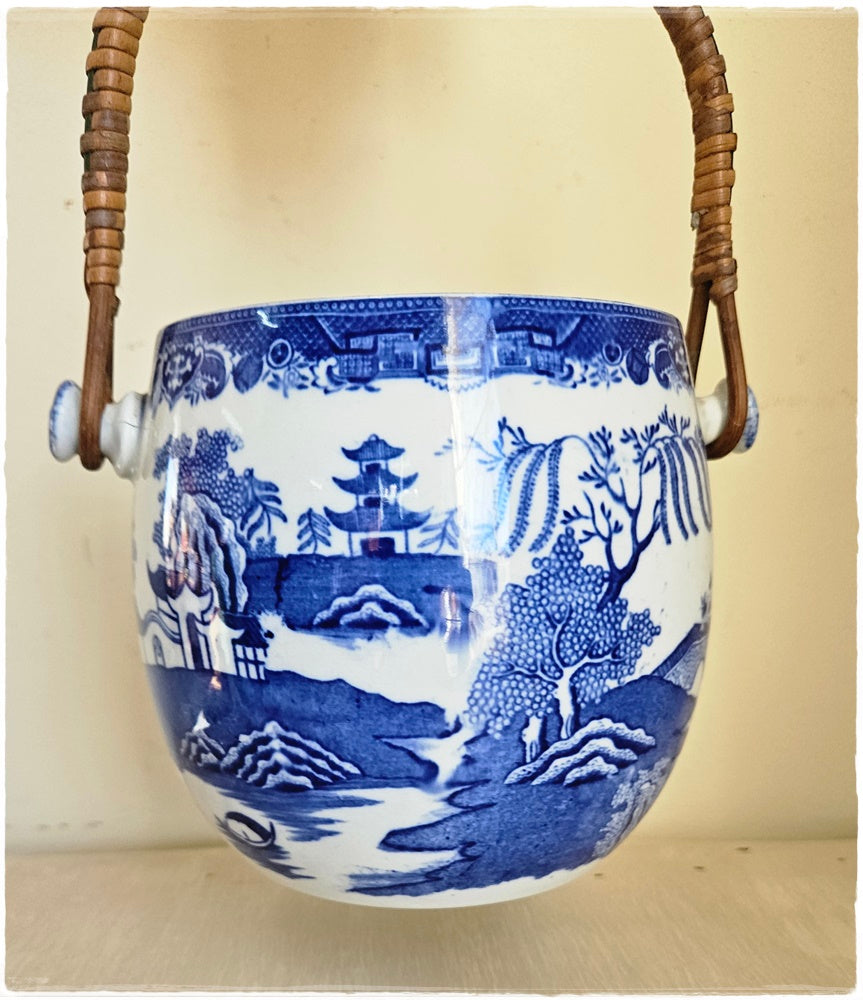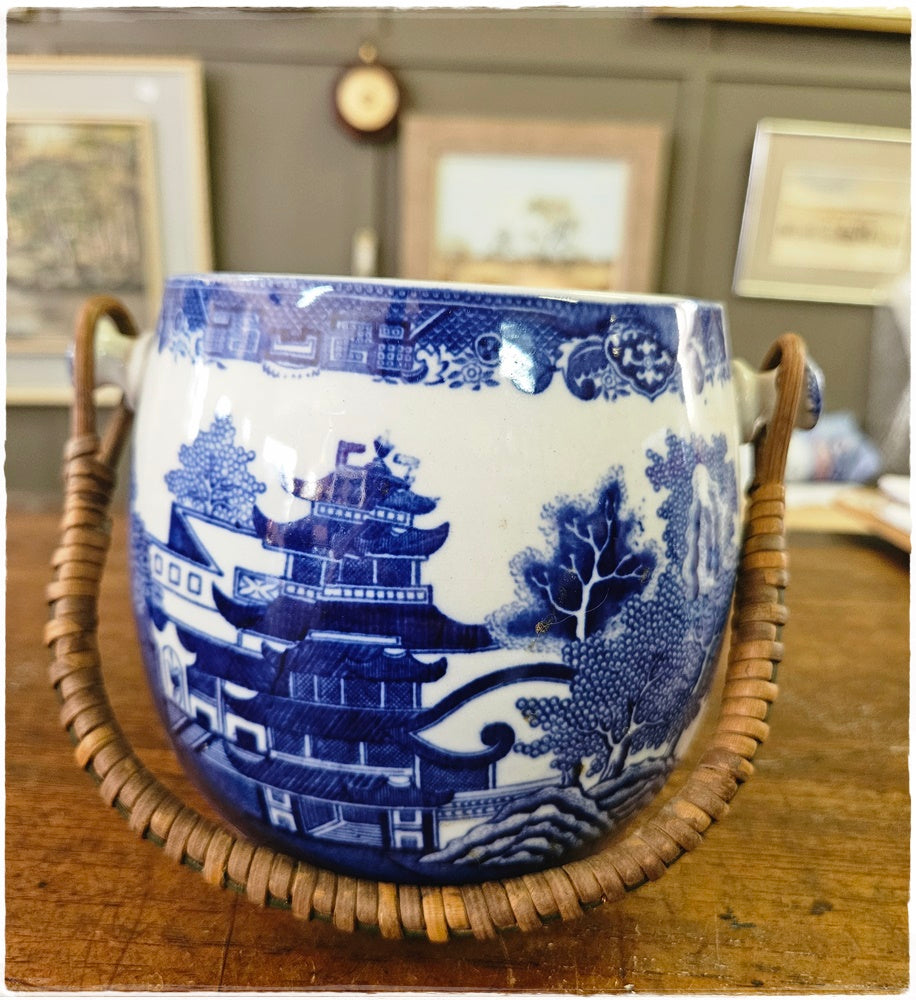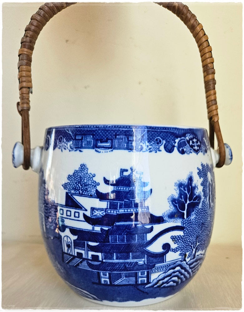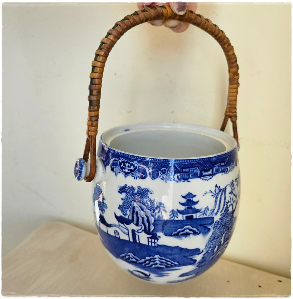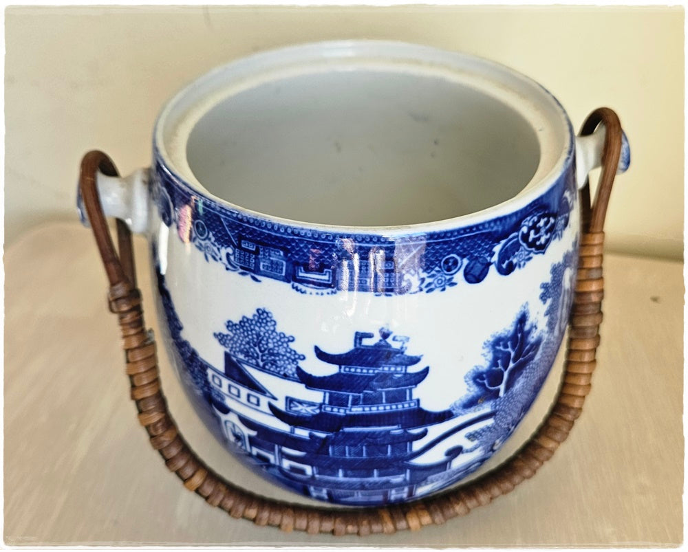 Ceramic biscuit barrel, missing its lid. Has a bamboo handle.