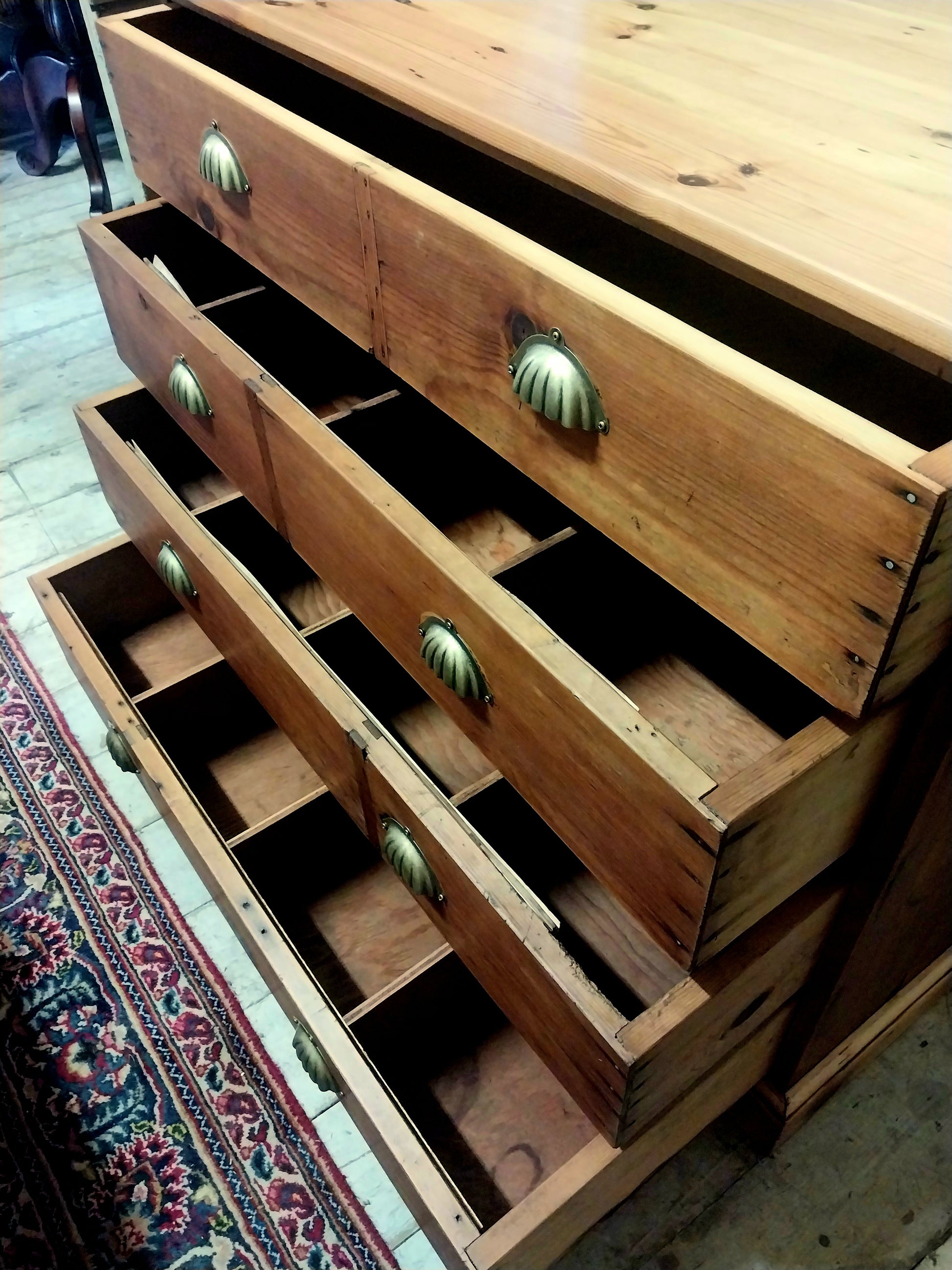 A very deep, refurbished chest of drawers. All drawers except top one have compartments.