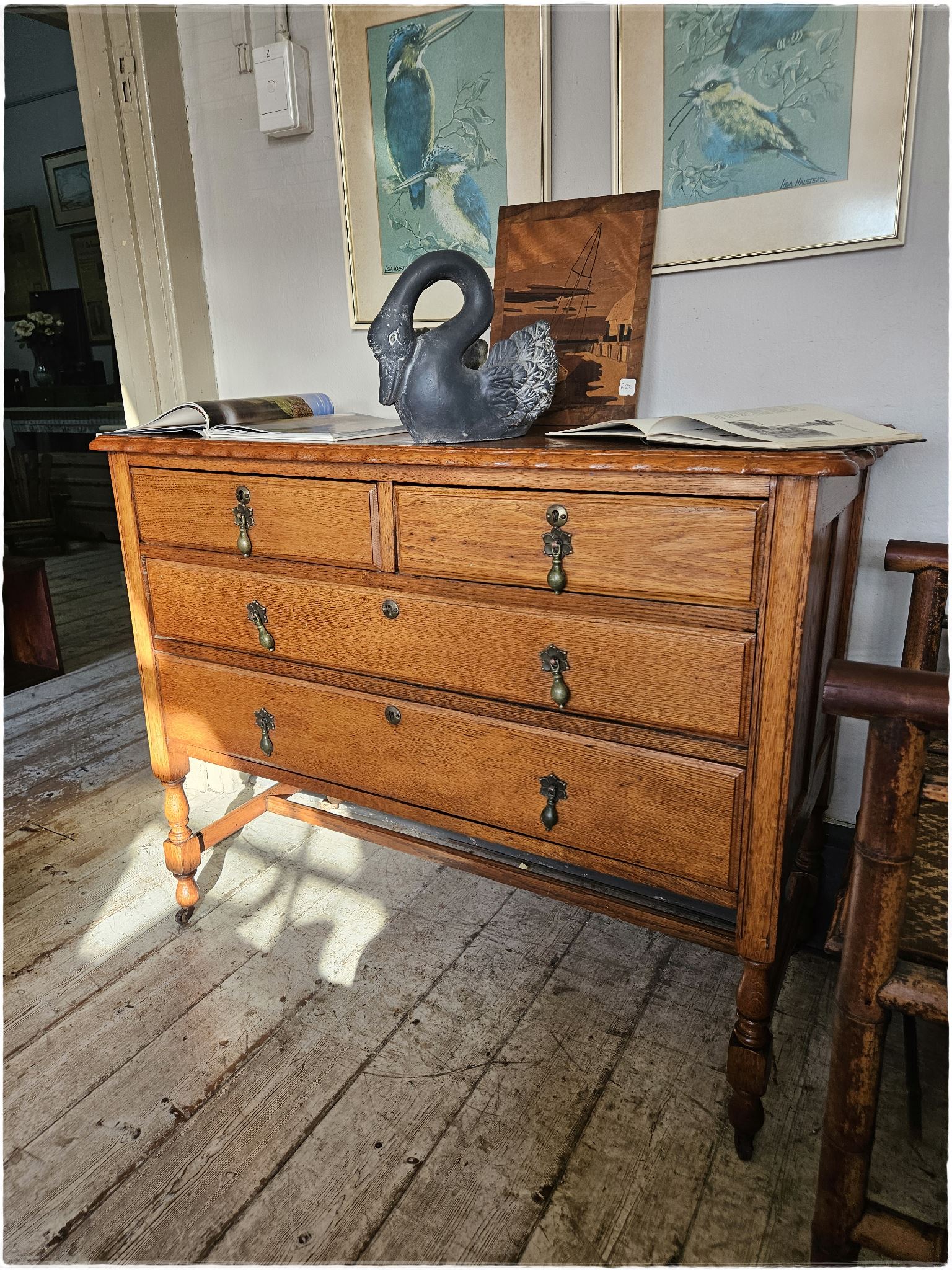 Oak chest of drawers with pretty scalloped edge top and 4 drawers.