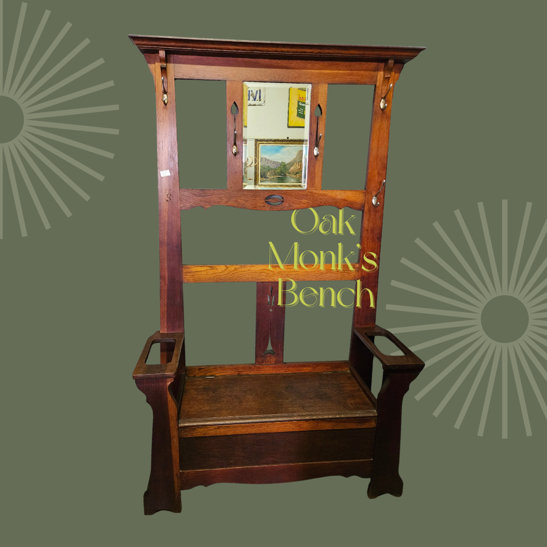 Oak monk's bench. Hooks are not original and missing one. Bench lifts up. Awesome entrance hall piece that can hold walking sticks, umbrellas, hats and jackets.