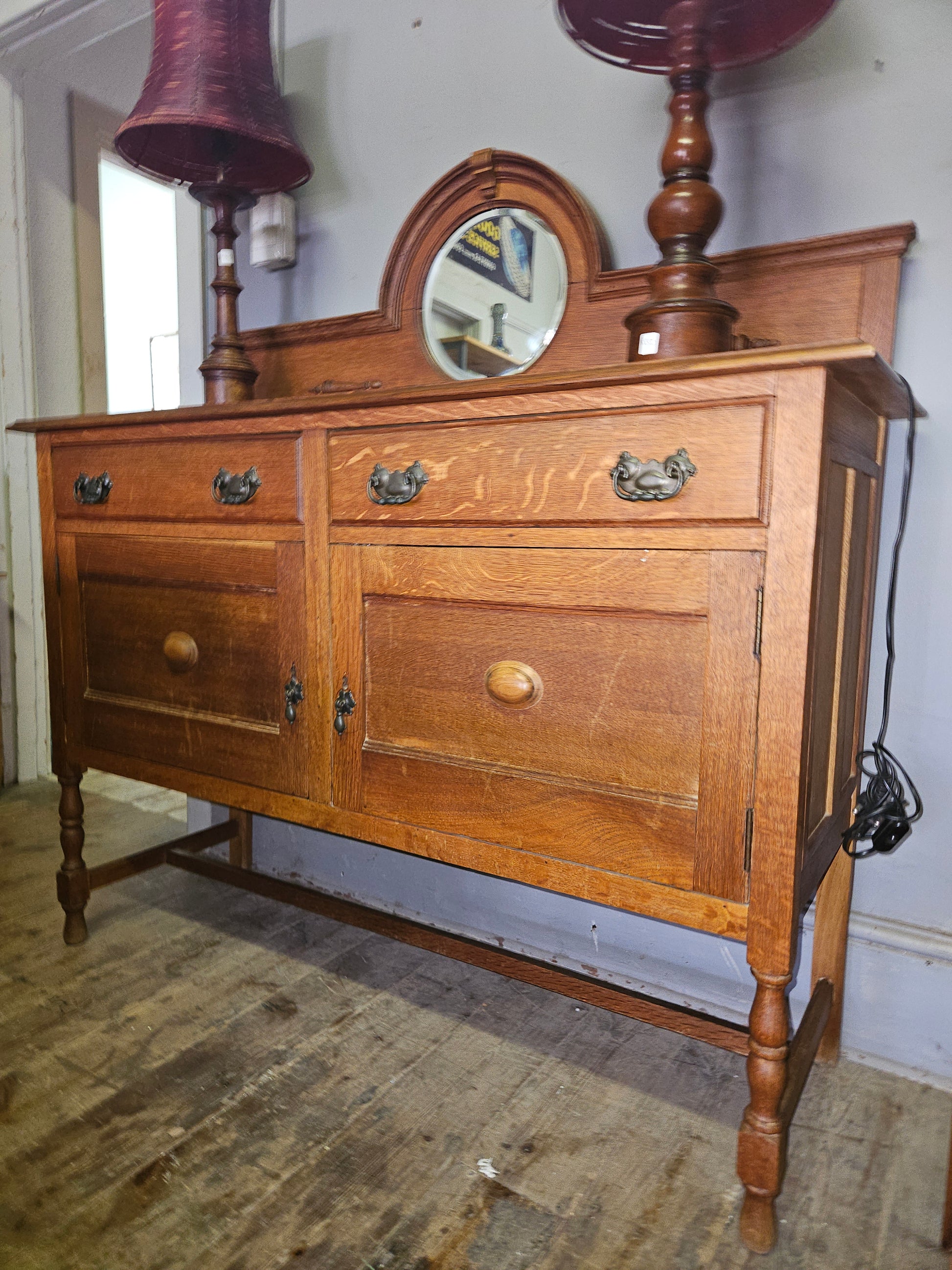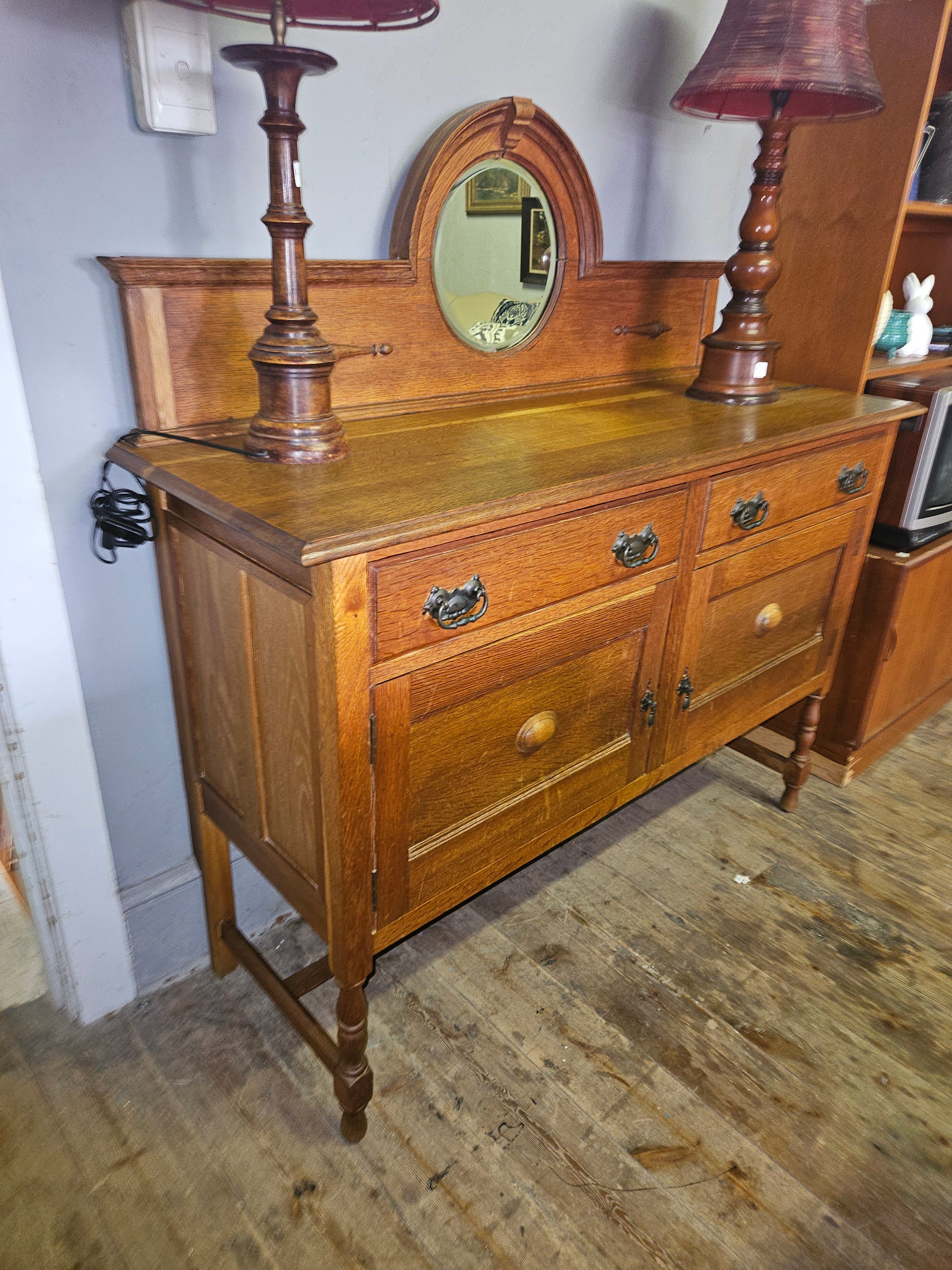 Oak sideboard with mirror, two drawers and doors.