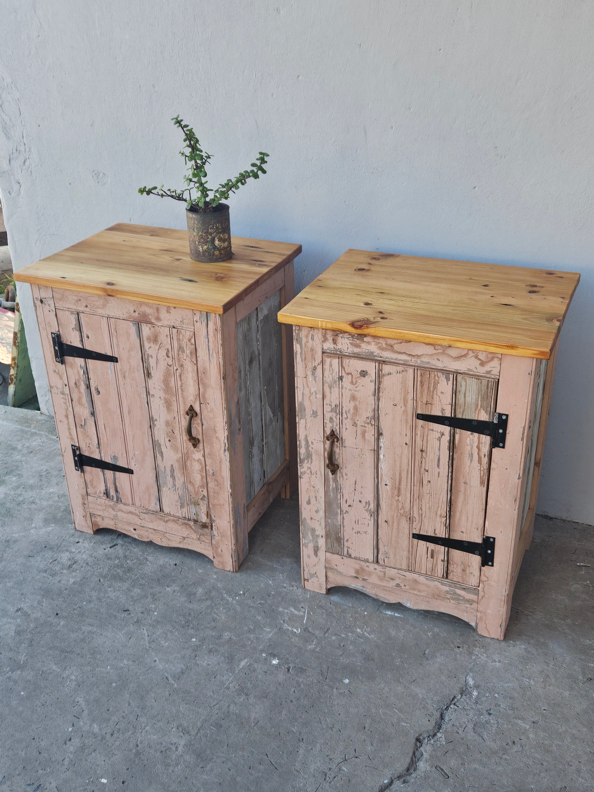 Pair of rustic pink/terracotta bedside pedestals.