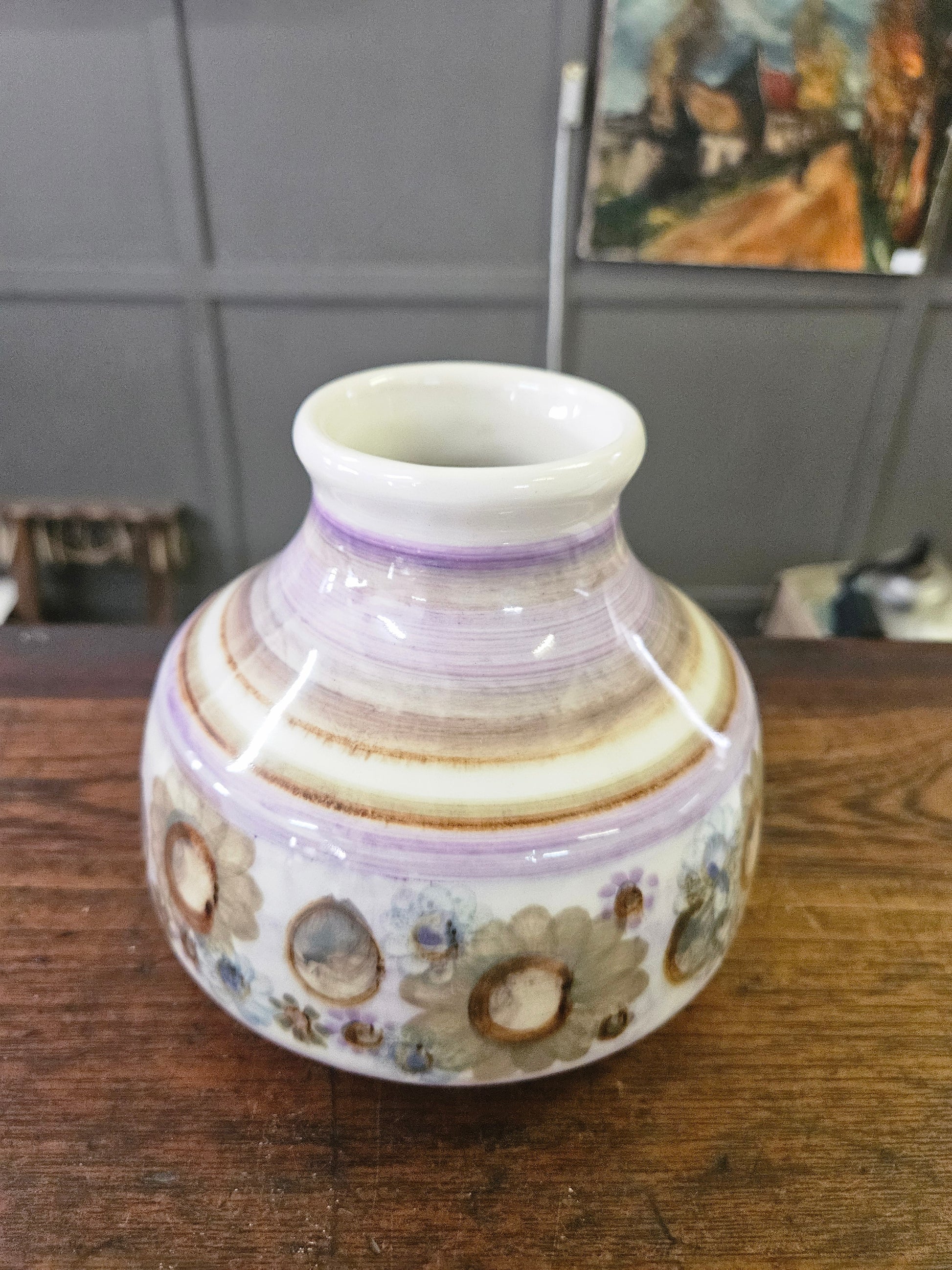 Handpainted pottery vase signed by the artist. Lavender and brown florals.