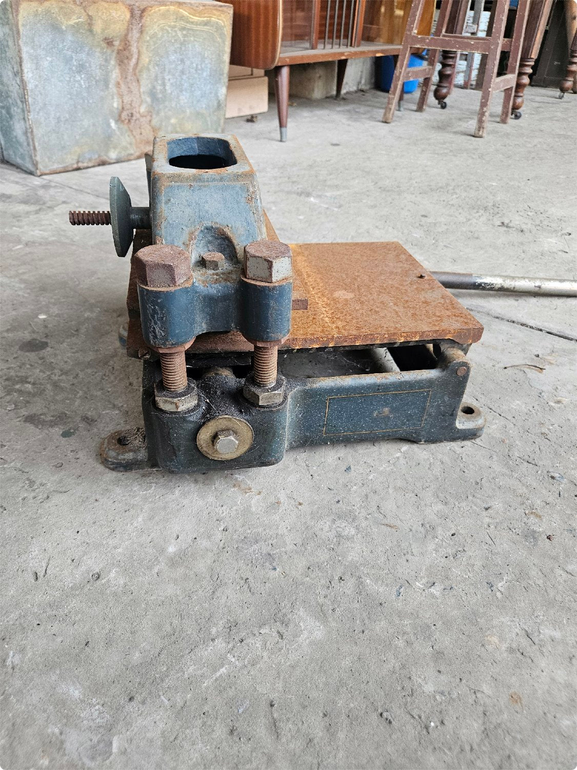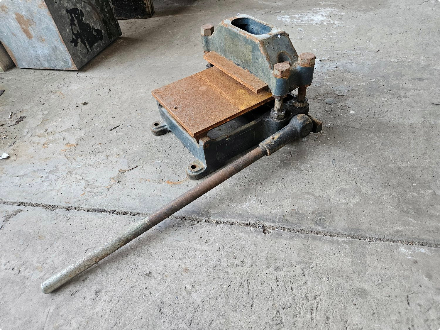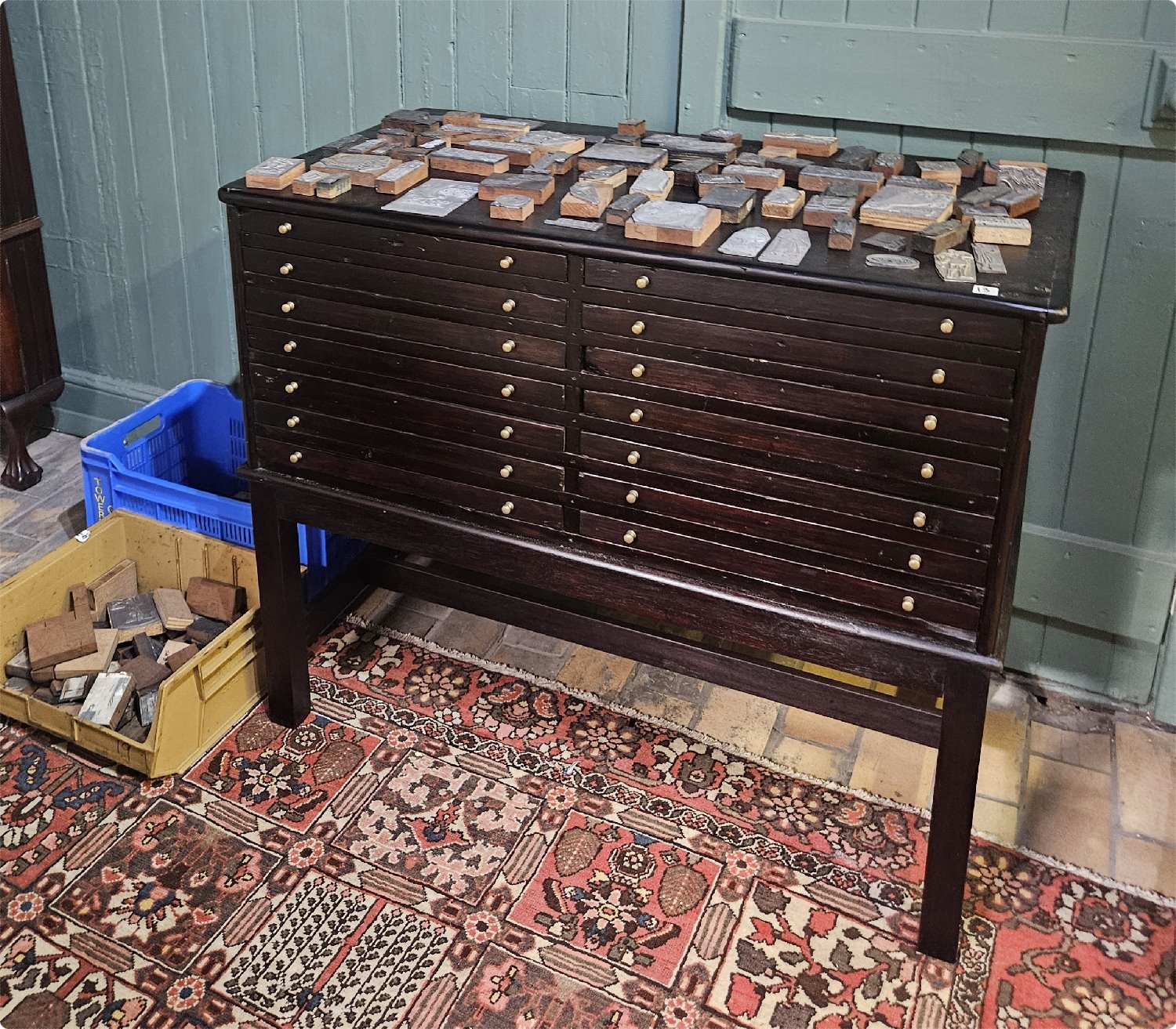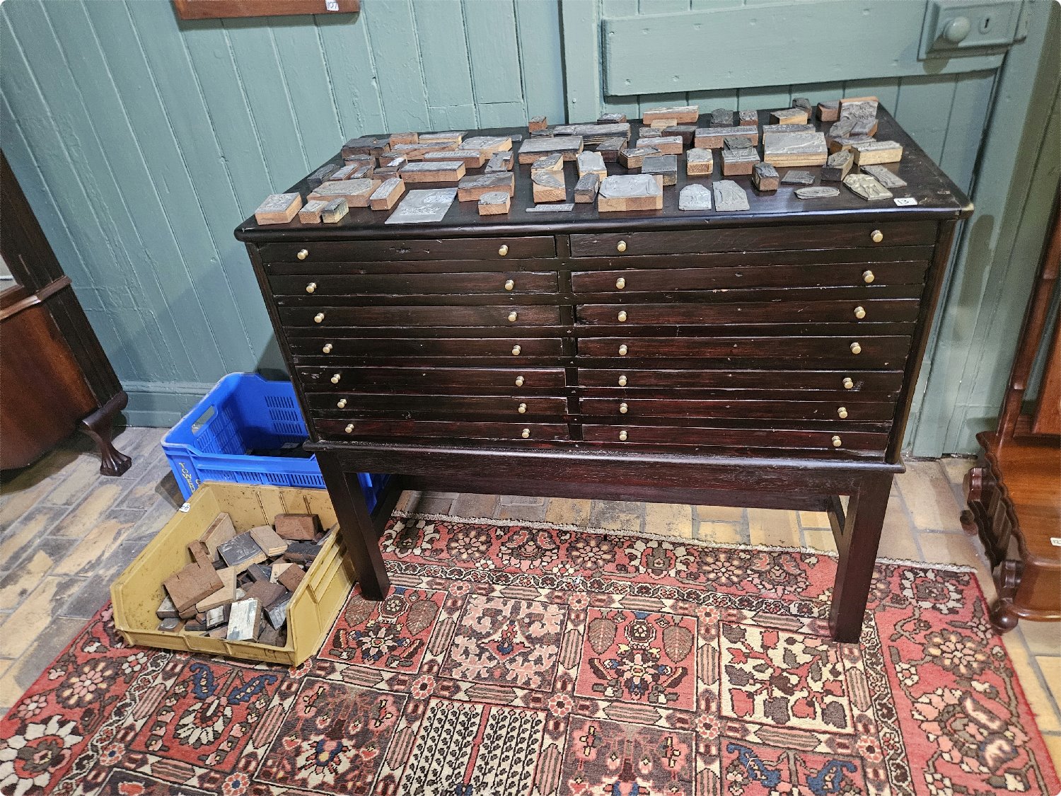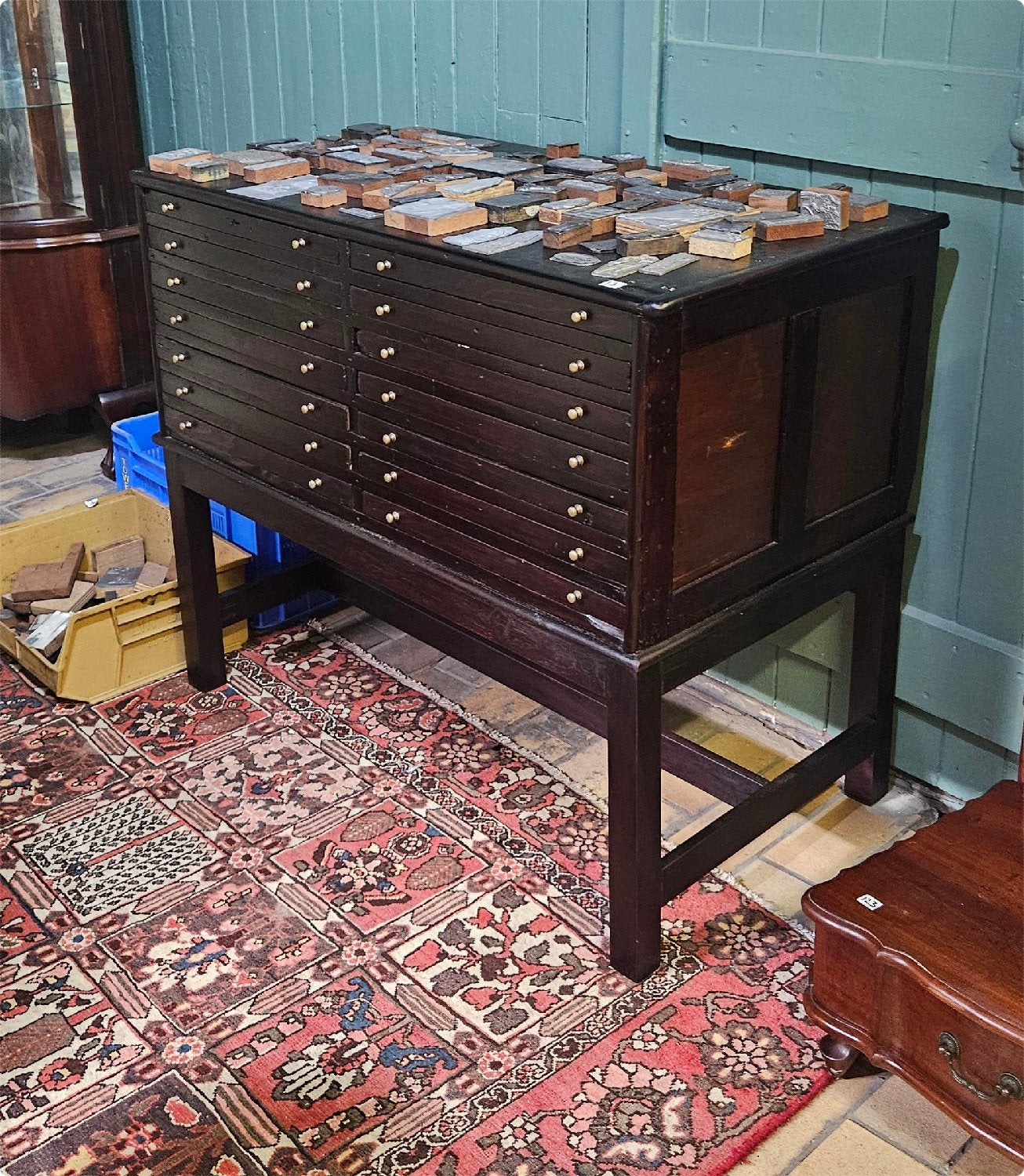Printer's chest with over 200 printing blocks and ticket press machine.