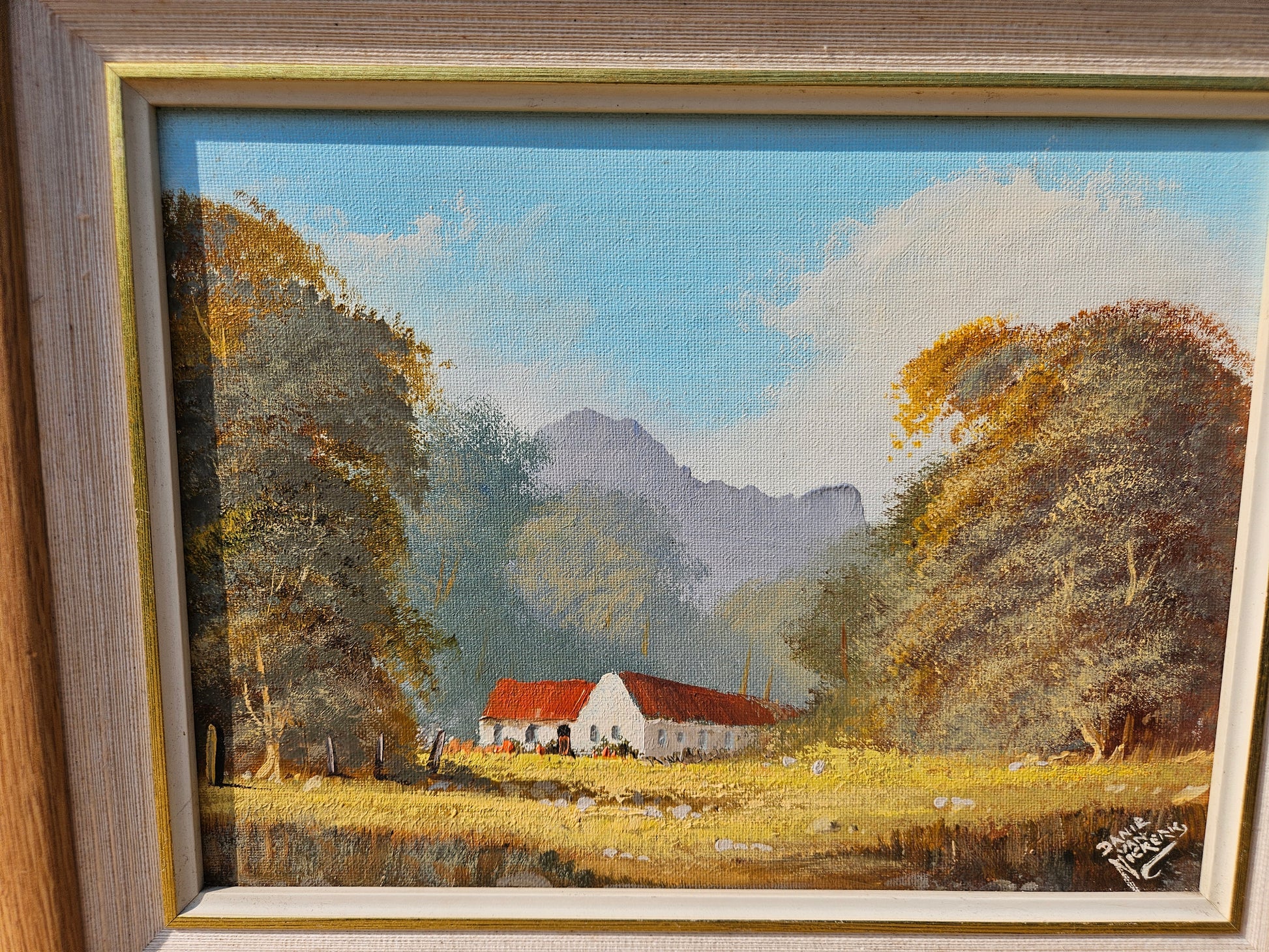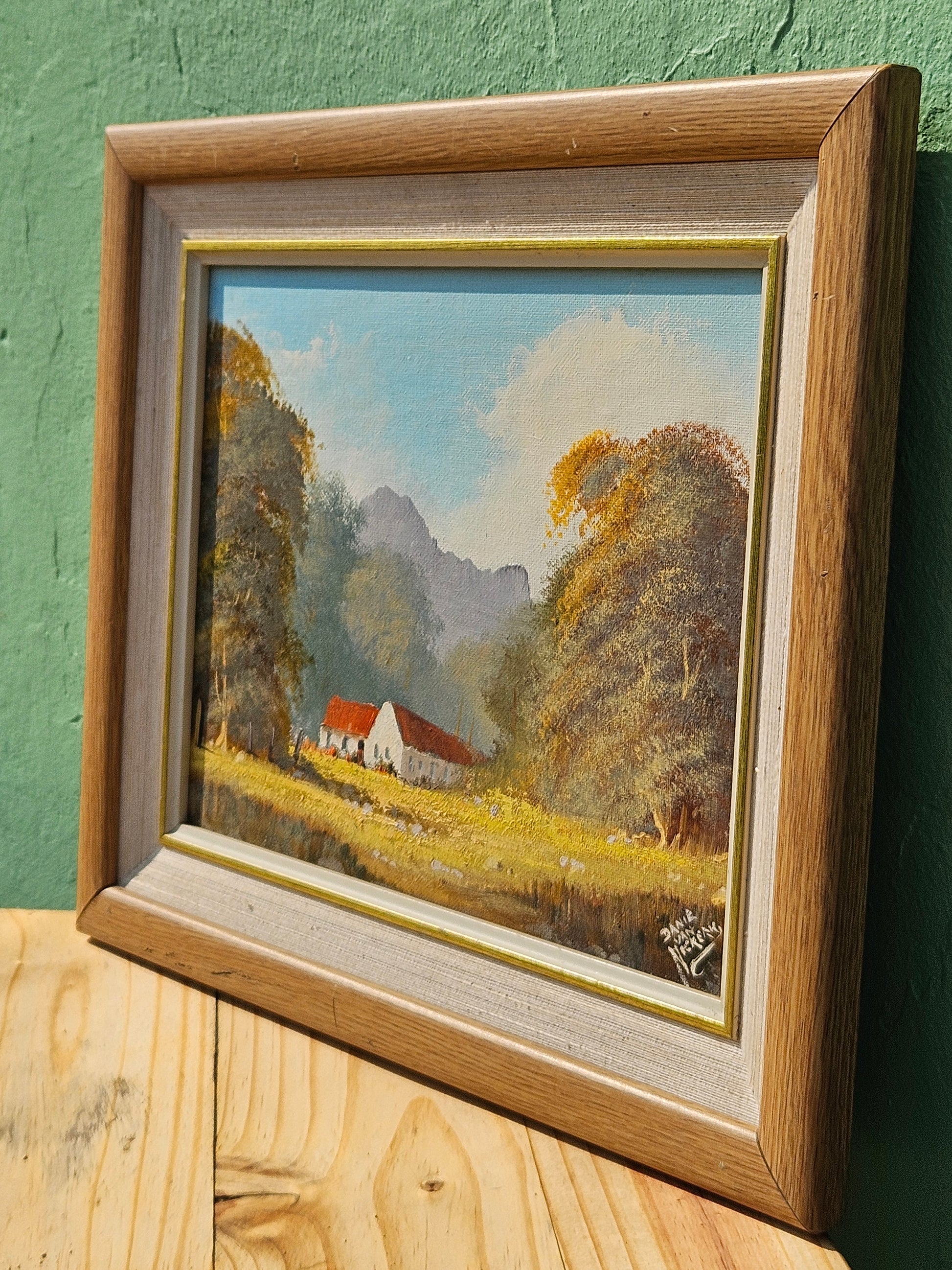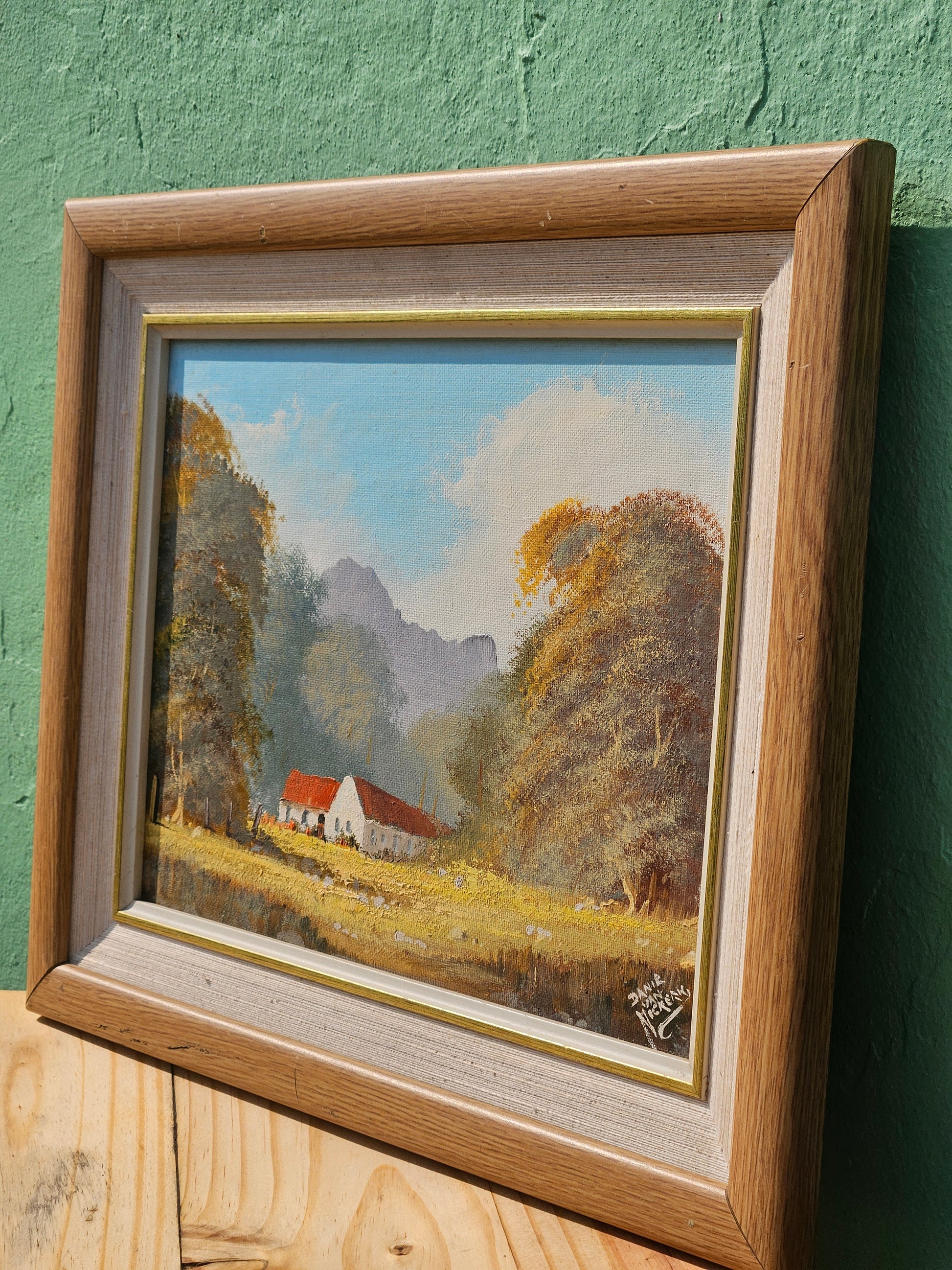 Small original oil painting by Danie Van Niekerk. Depicting a farmhouse with red roof, surrounded by autumn scenery.