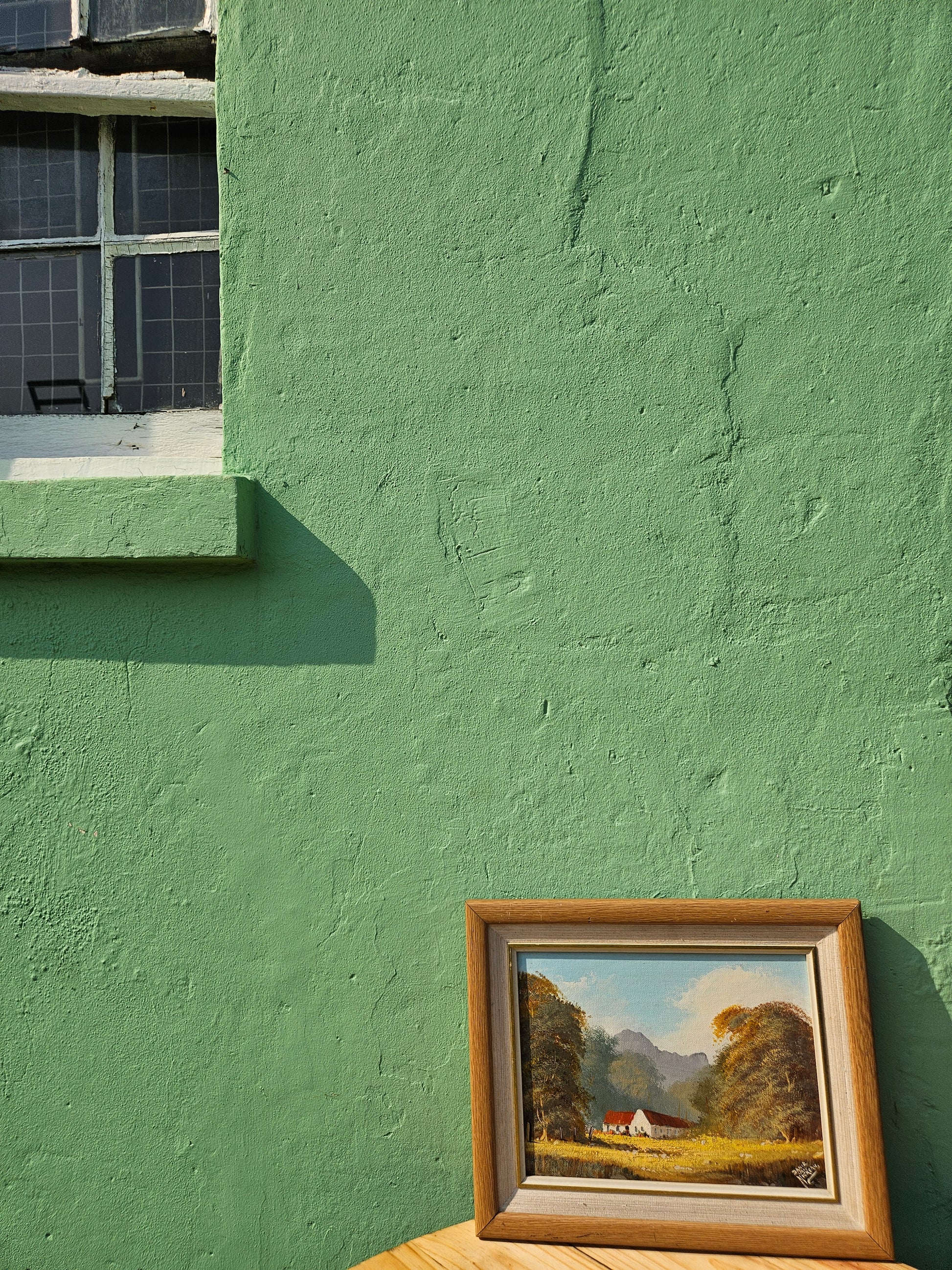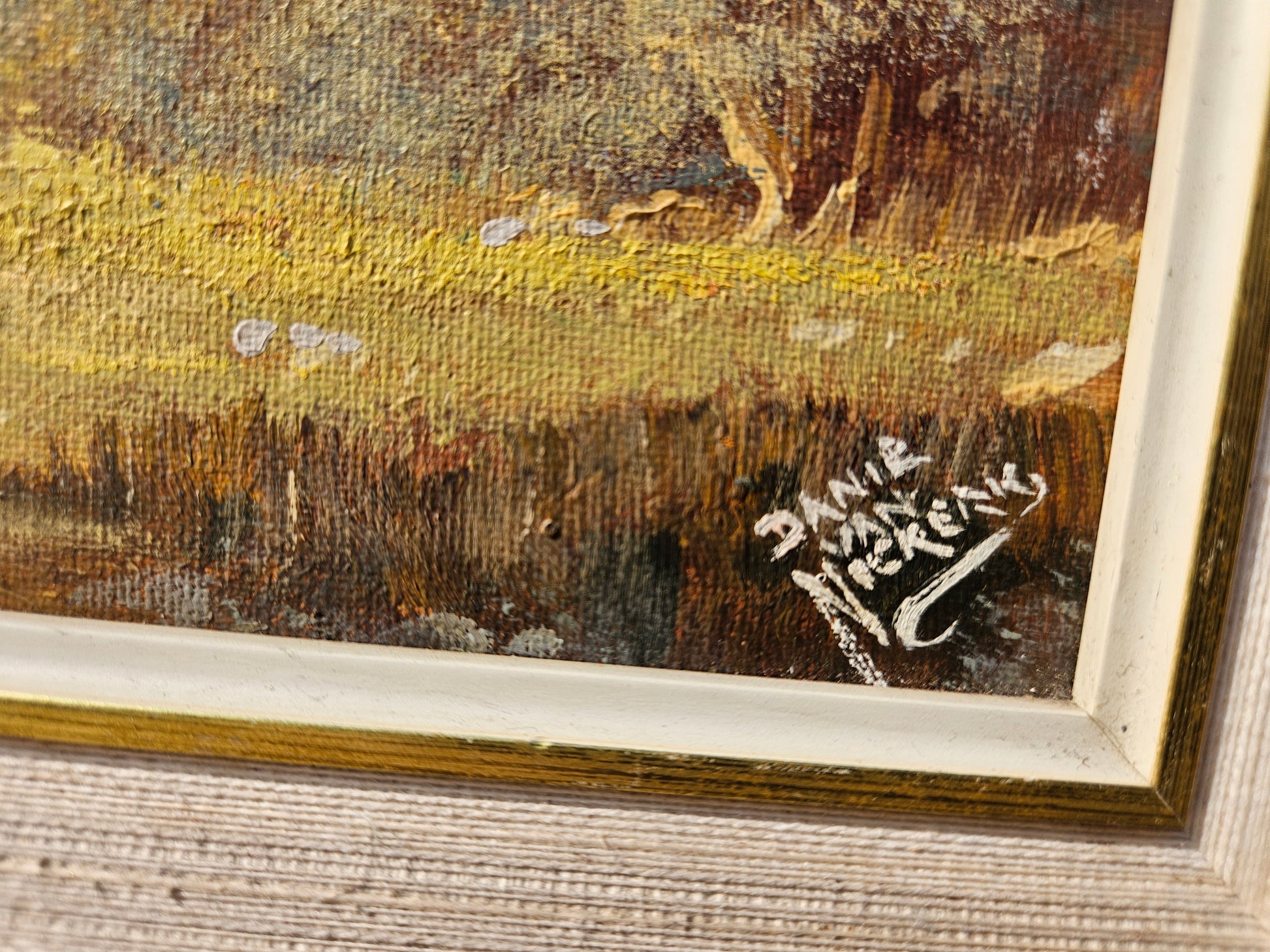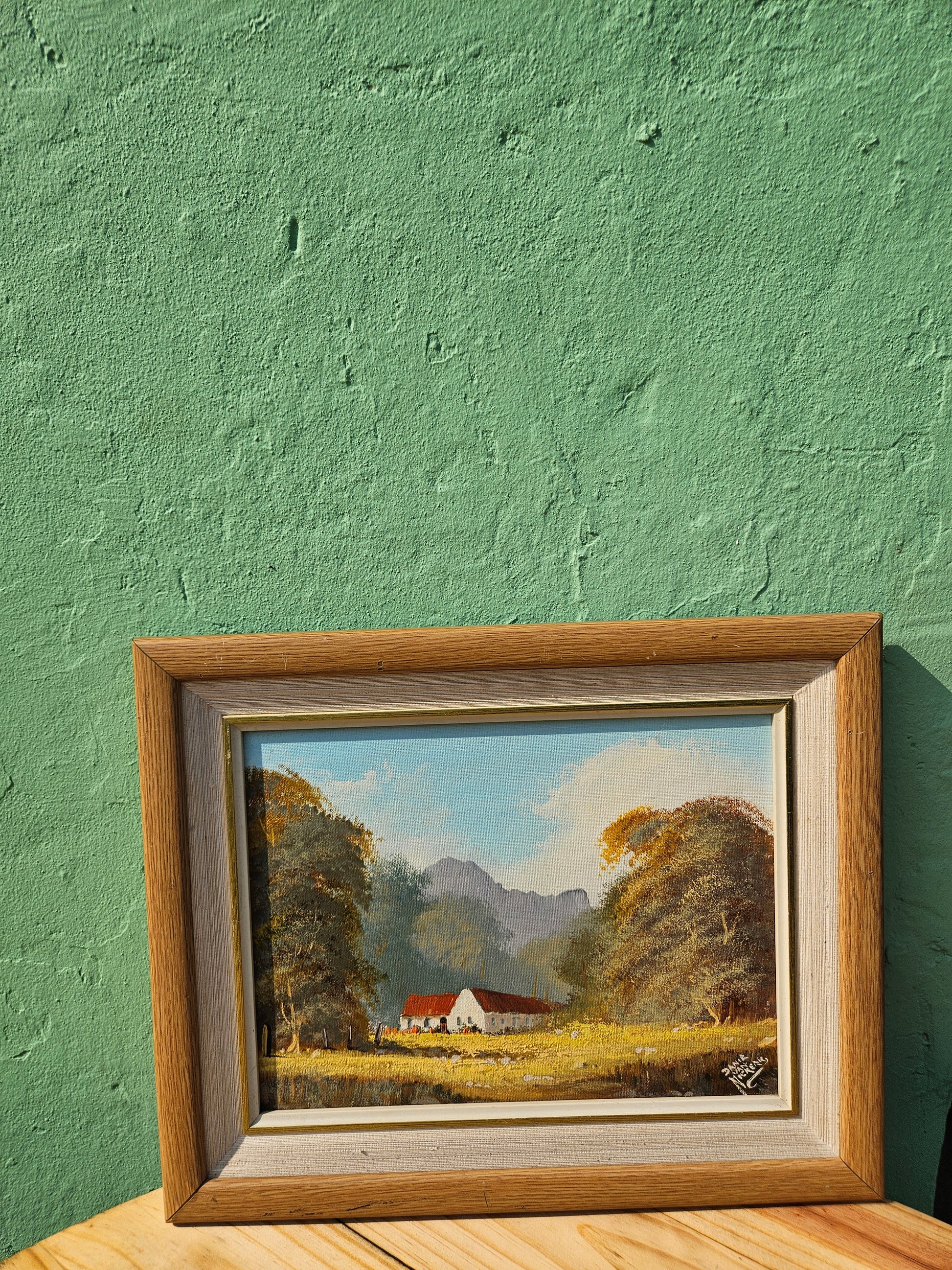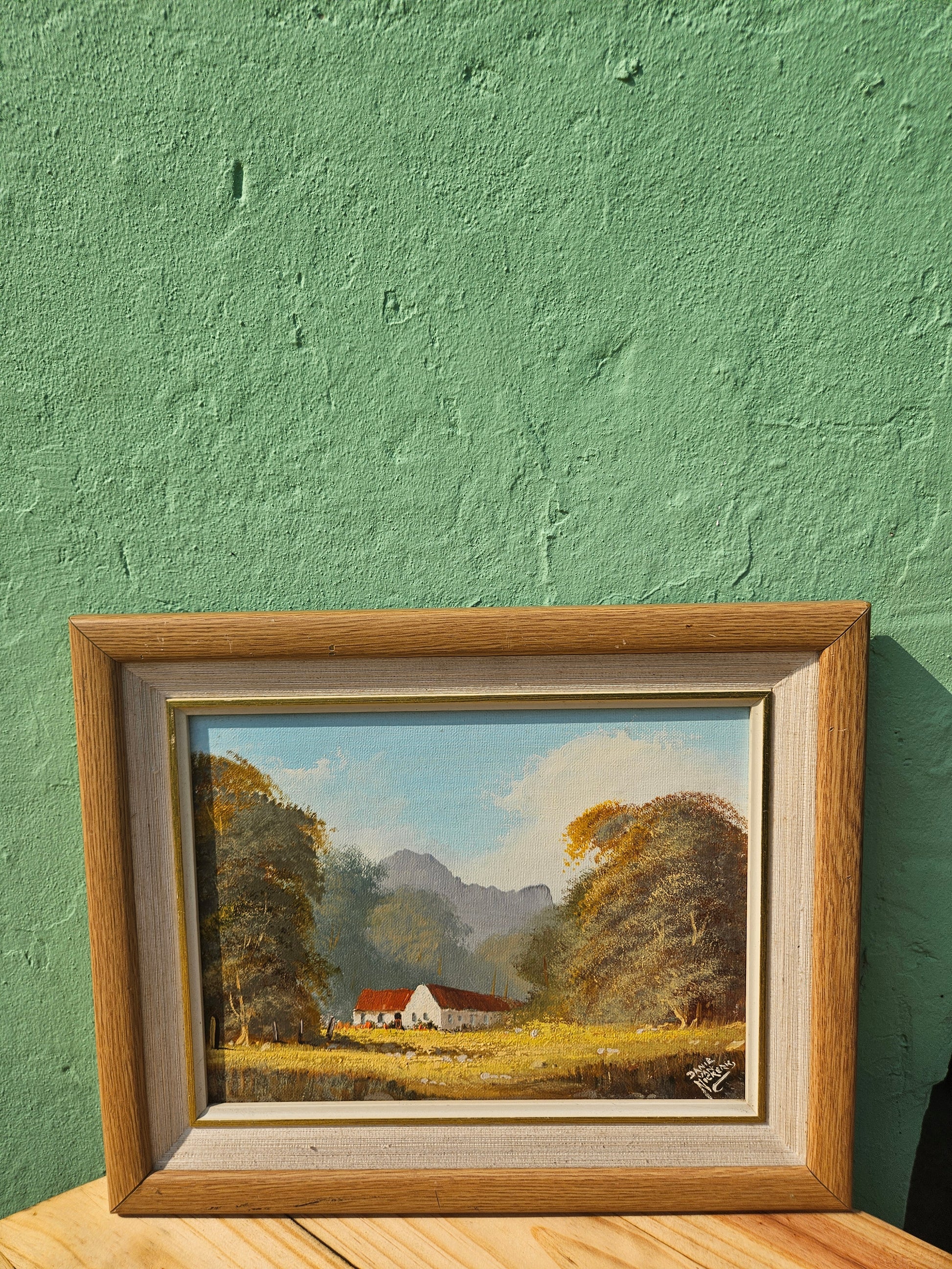 Small original oil painting by Danie Van Niekerk. Depicting a farmhouse with red roof, surrounded by autumn scenery.