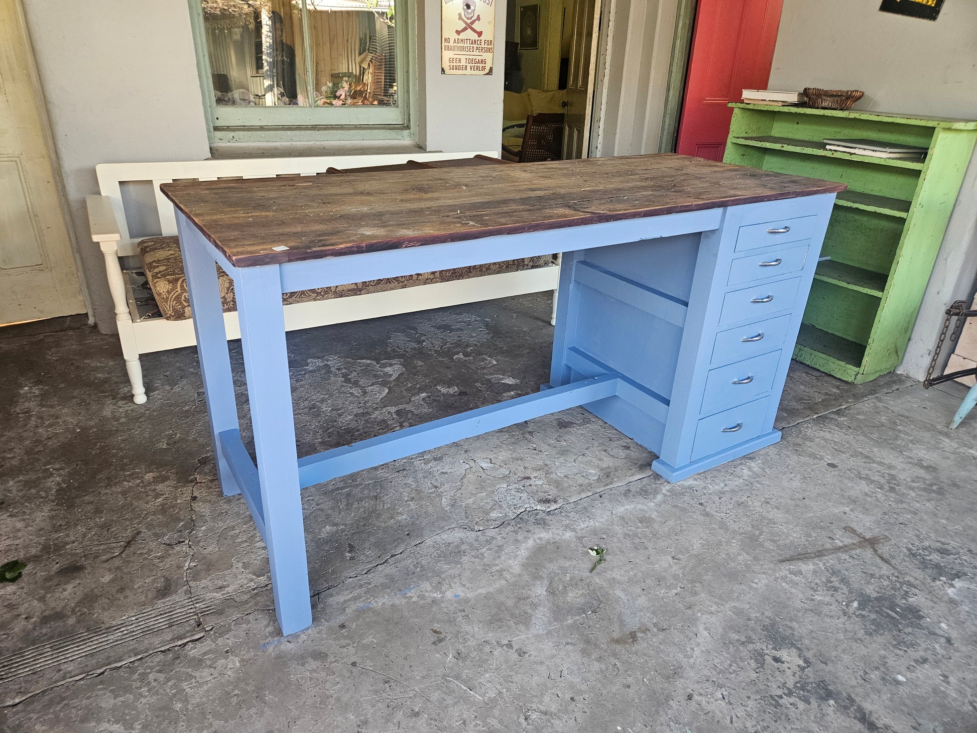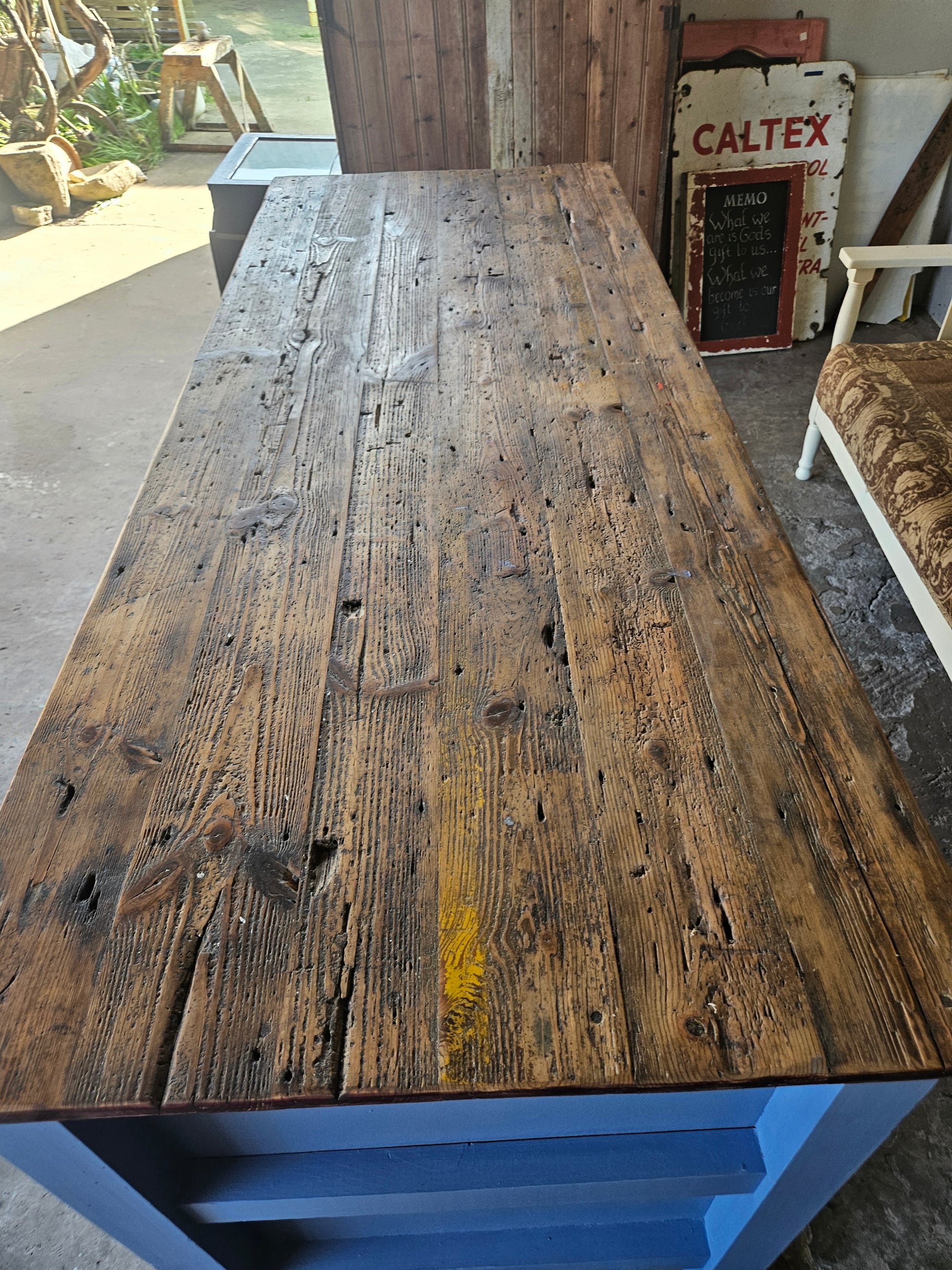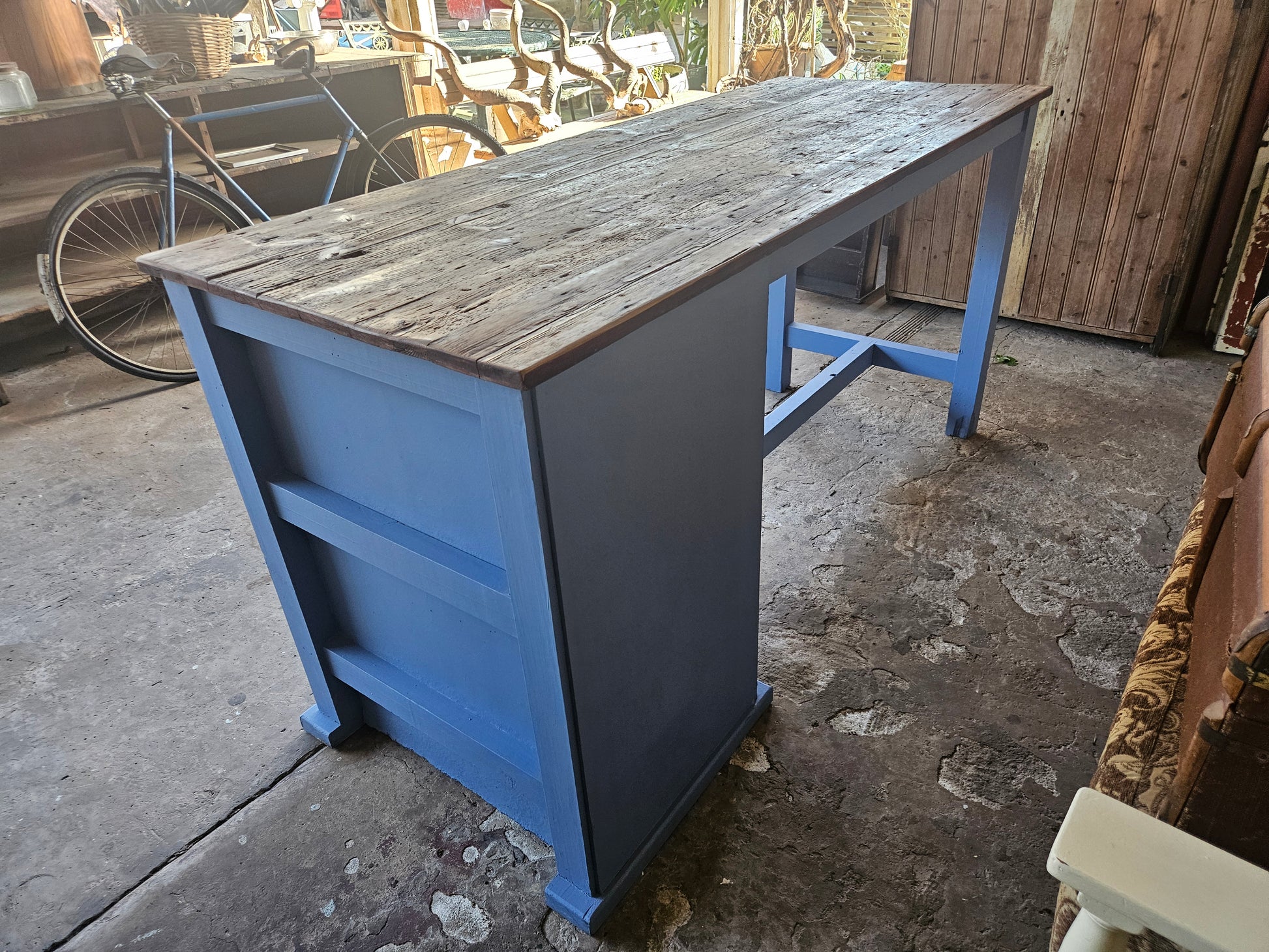 Rustic workbench / kitchen island has been refurbished. All drawers work nicely, newly painted in this cheerful blue. Very old oregan top.