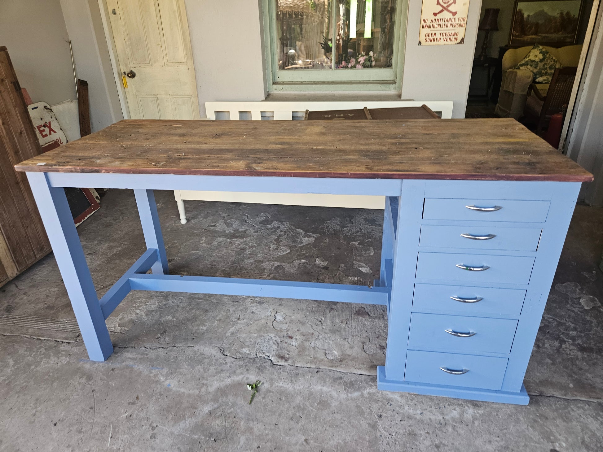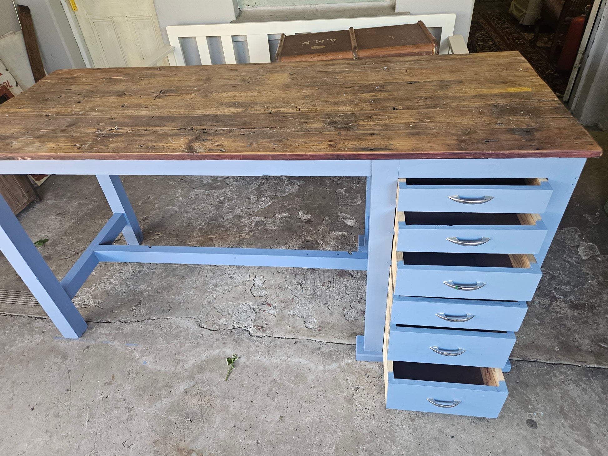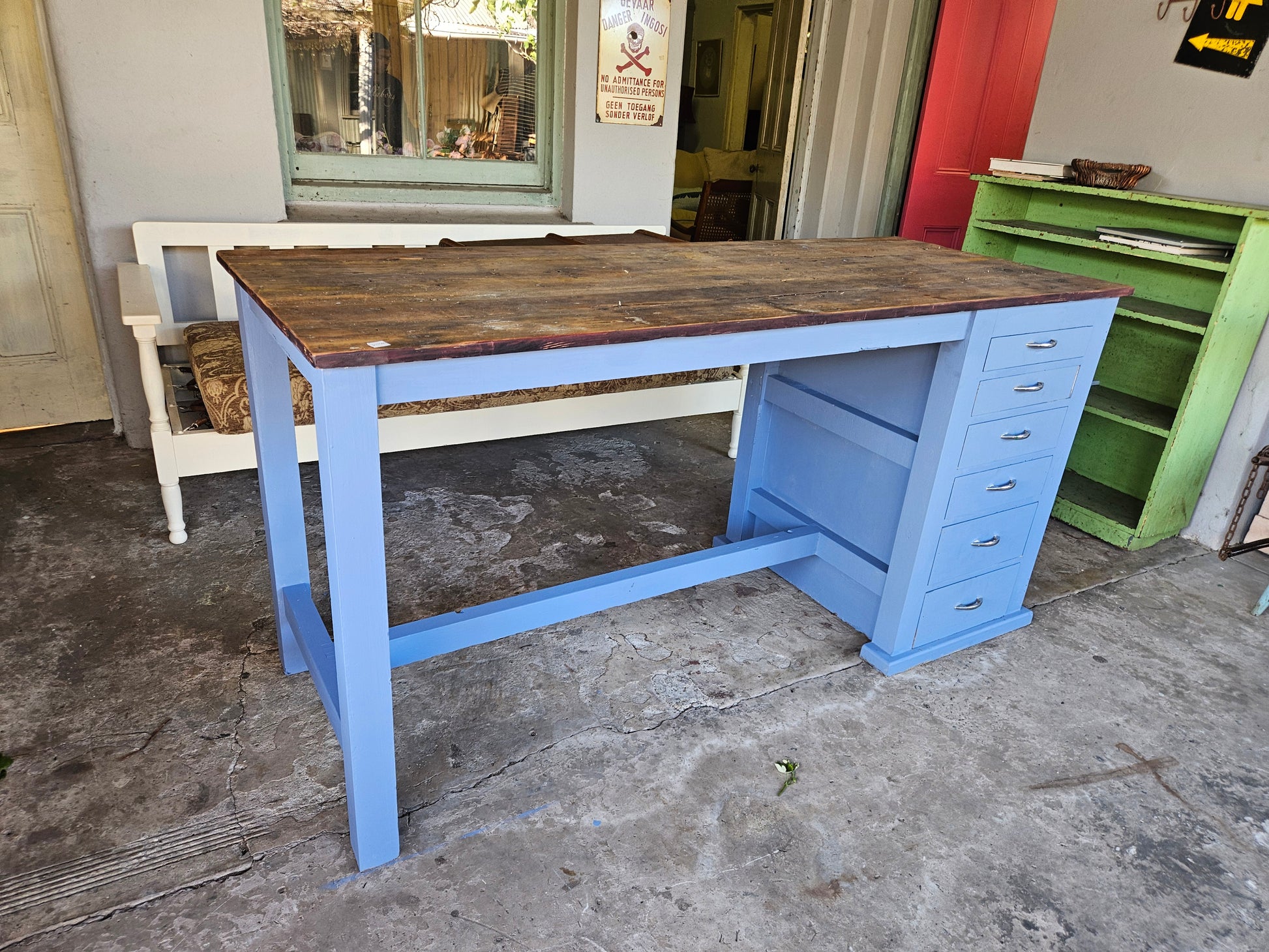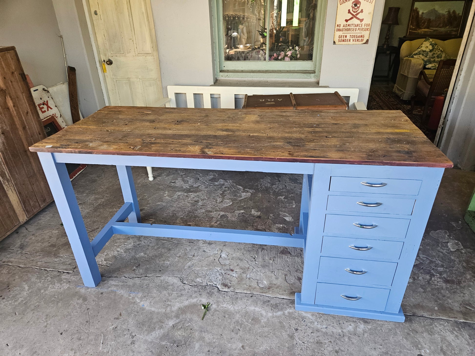 Rustic workbench / kitchen island has been refurbished. All drawers work nicely, newly painted in this cheerful blue. Very old oregan top.