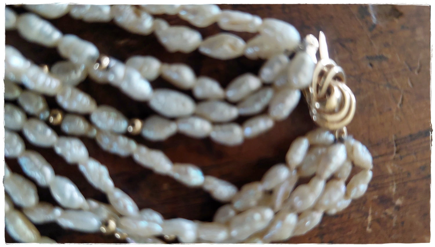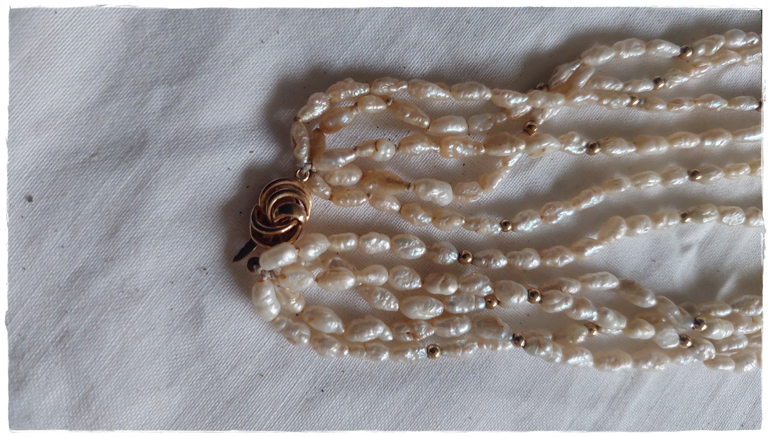 5 strand seed pearl necklace with 14ct gold clasp and gold(?) baubles in between the pearls.
