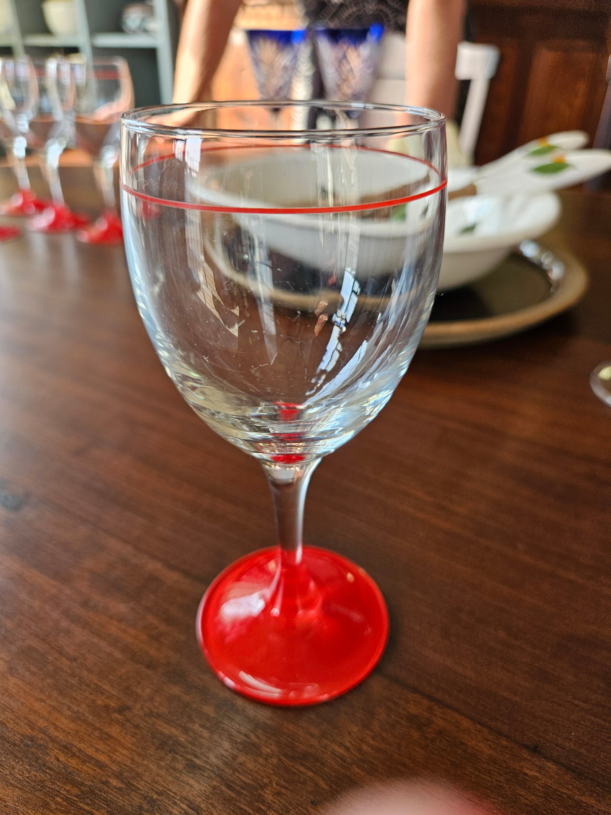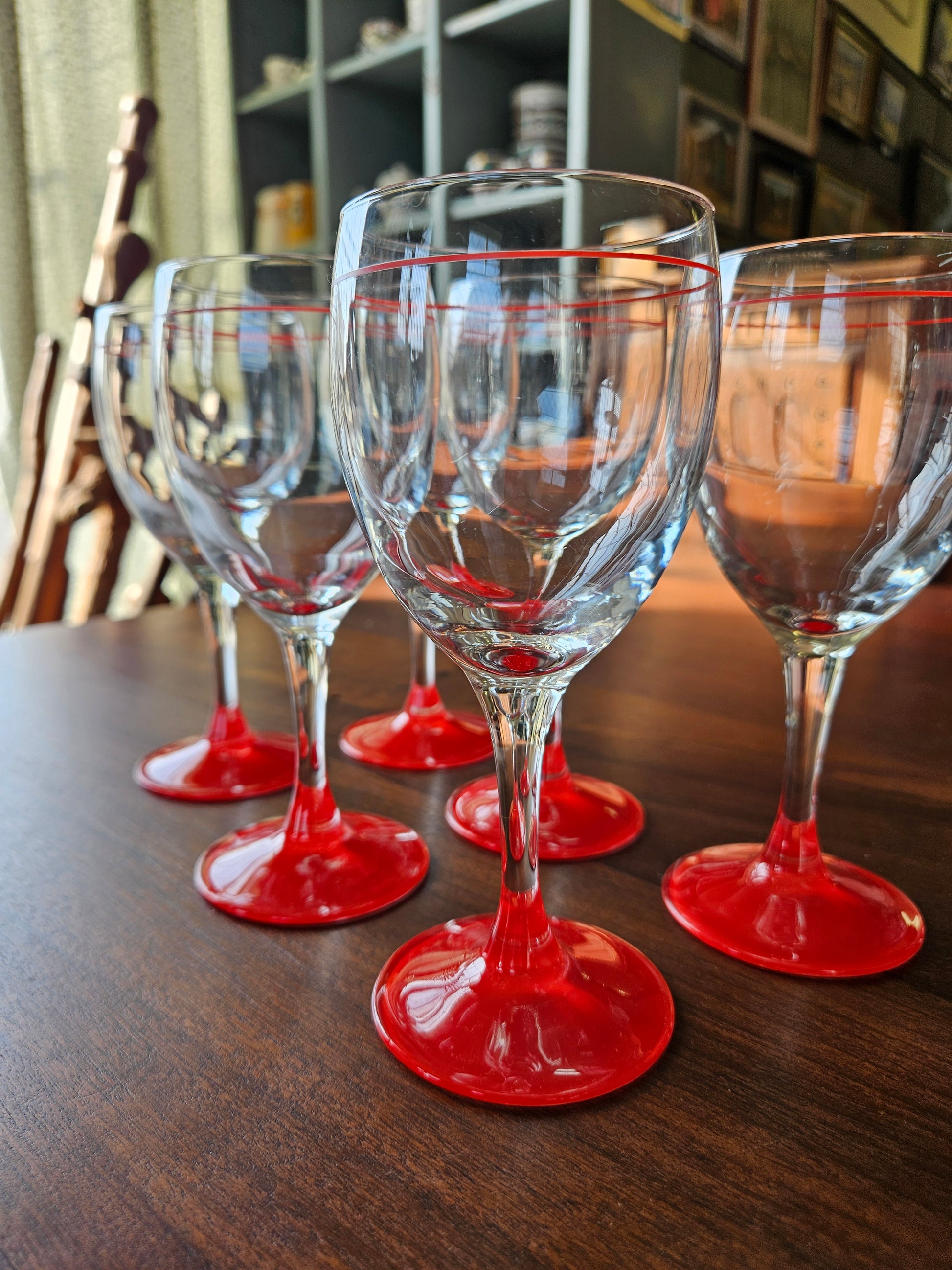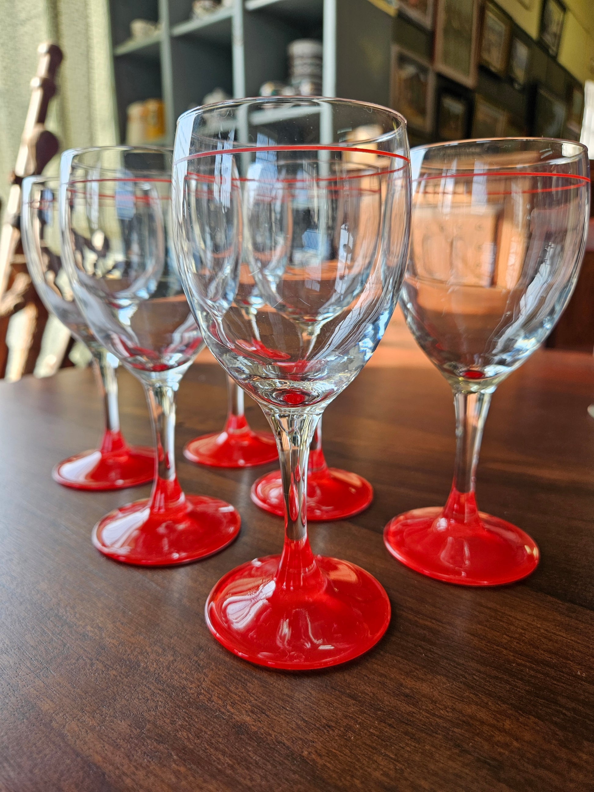 Set of 6 wine glasses with red stripe and red base. Made in France. No chips or cracks.