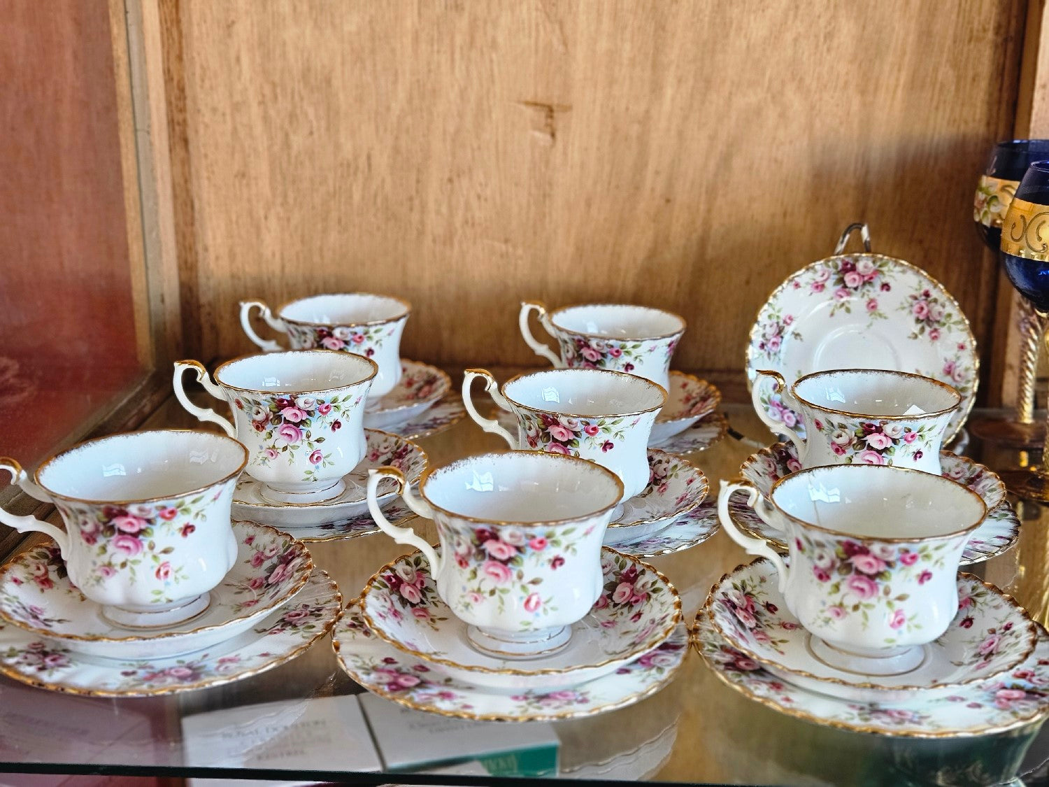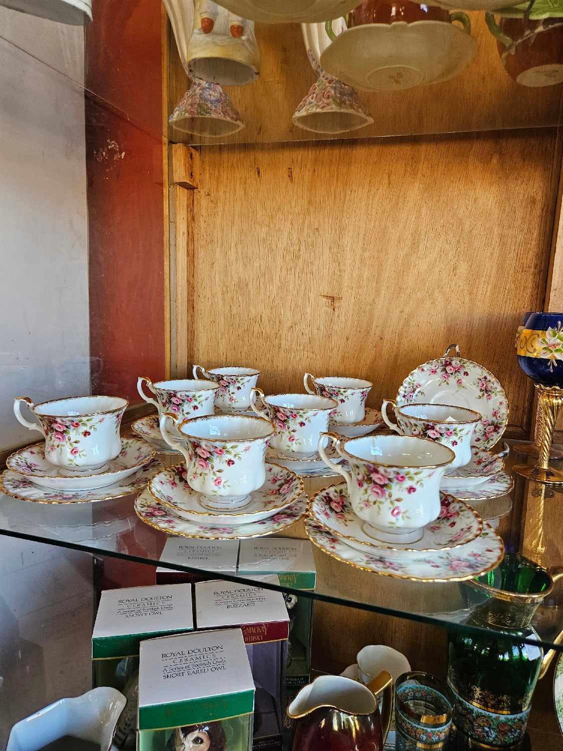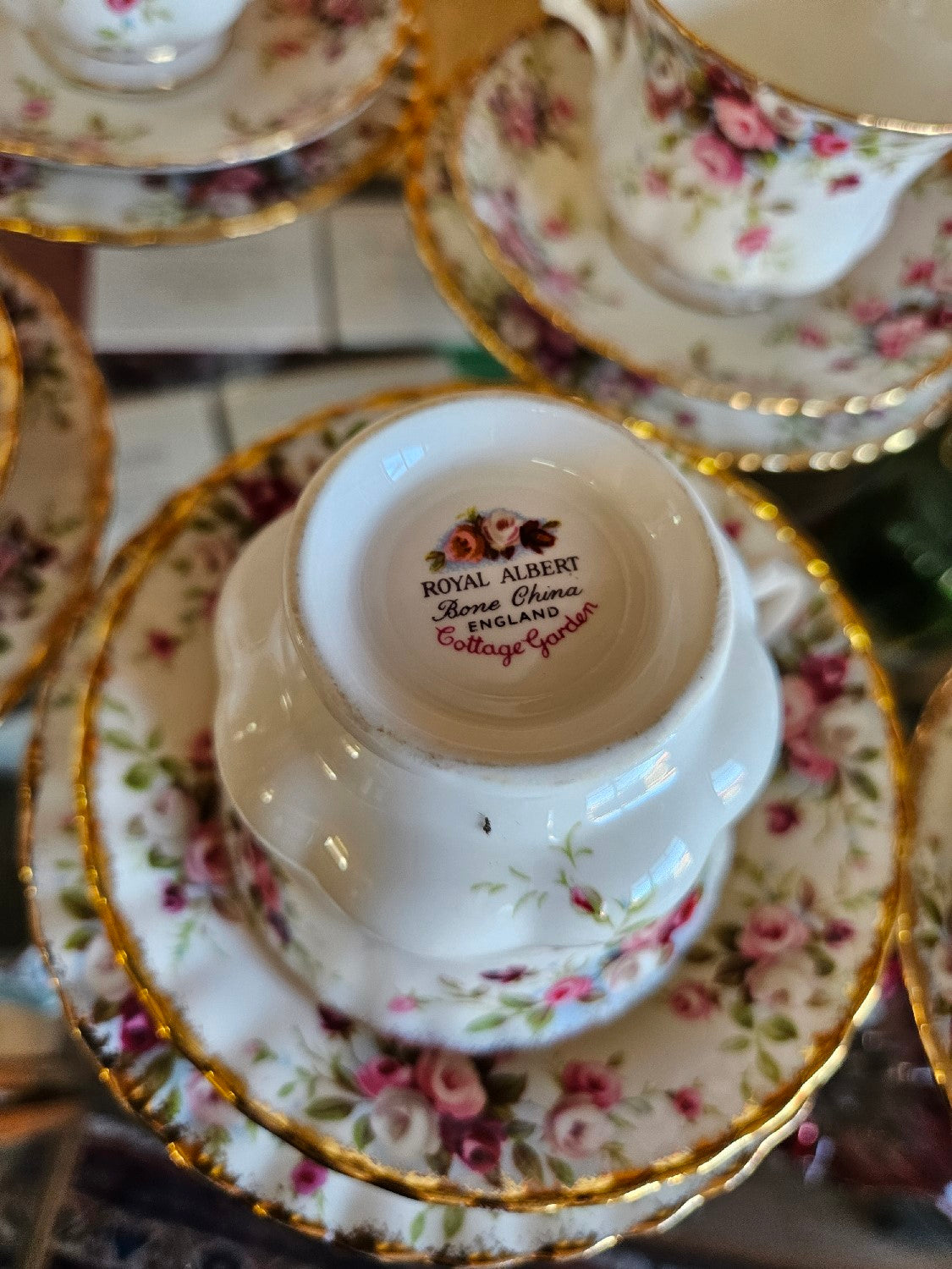 Set of 8 Royal Albert trios (1 cup has a hairline crack). In the pattern "Cottage Garden".