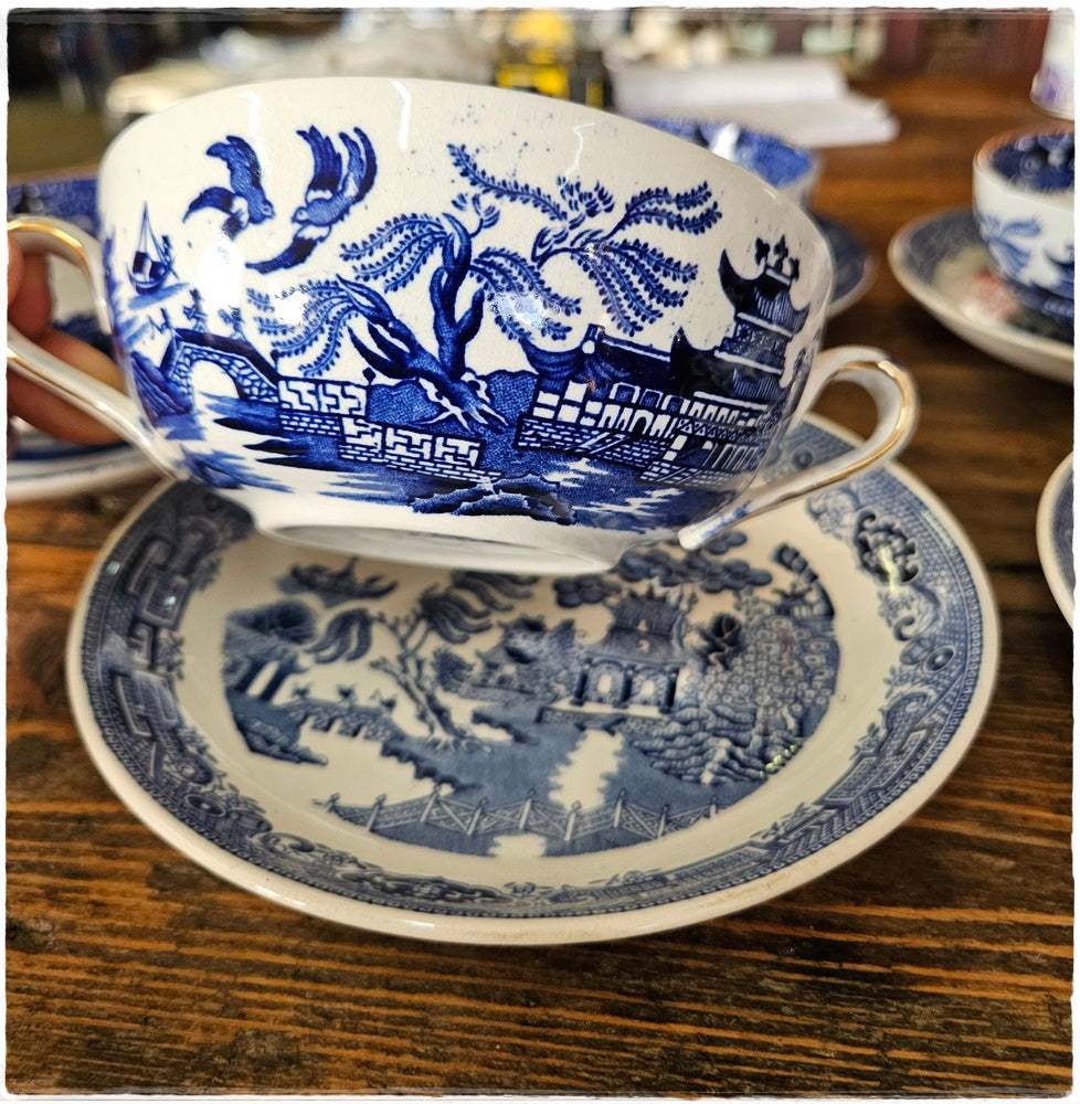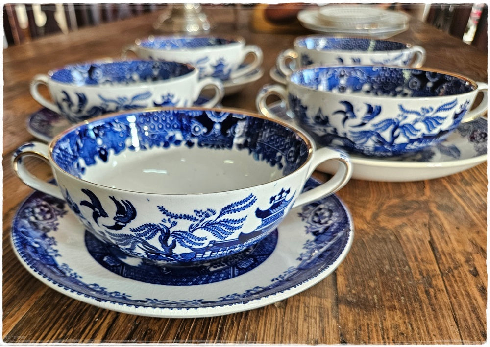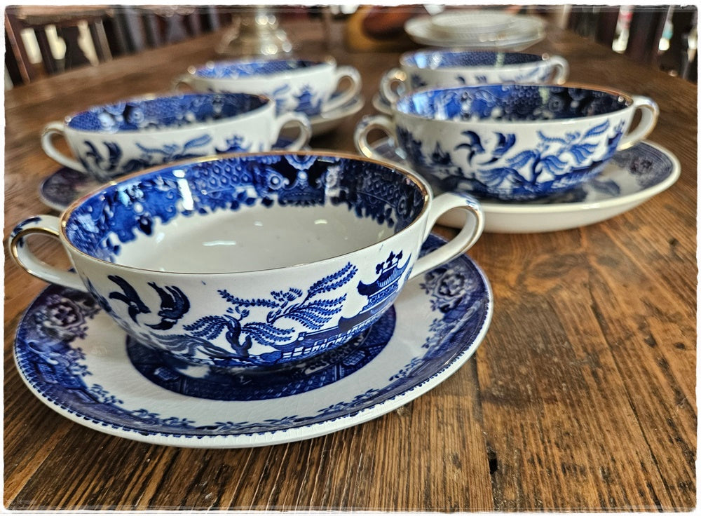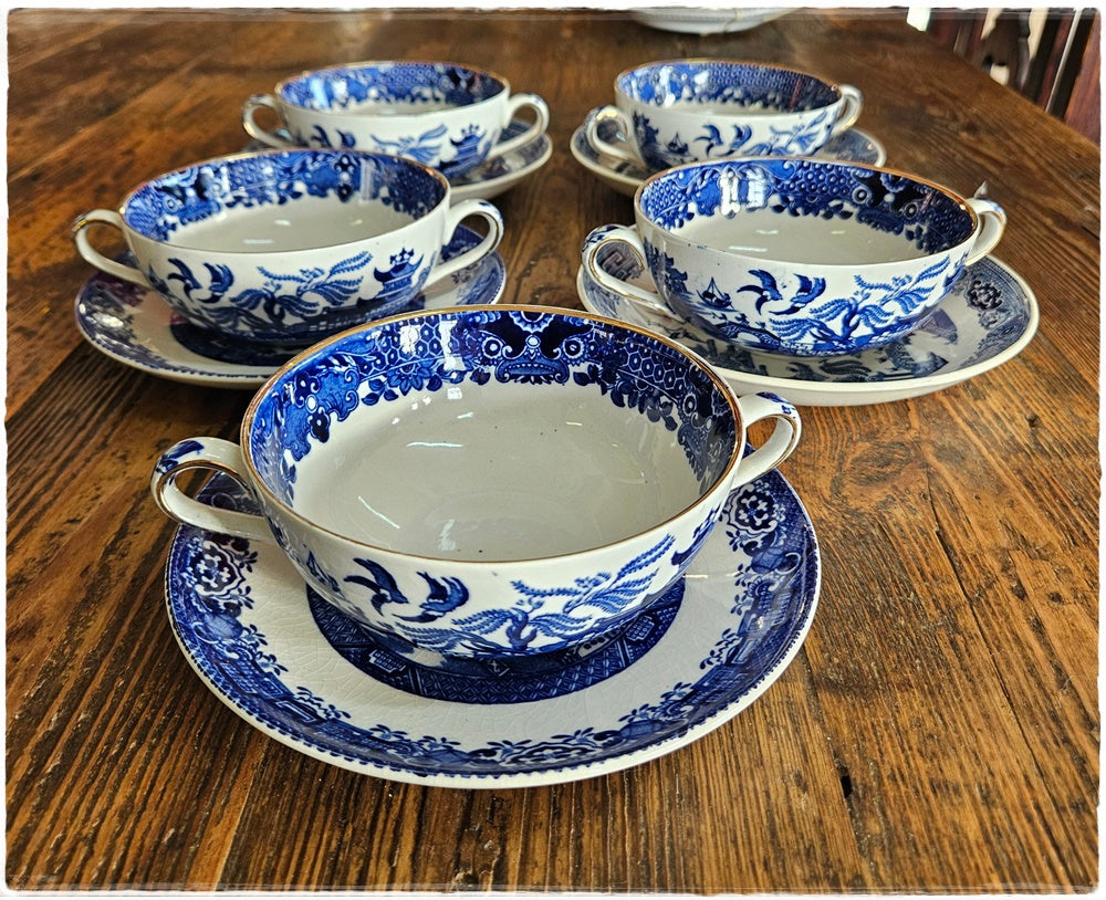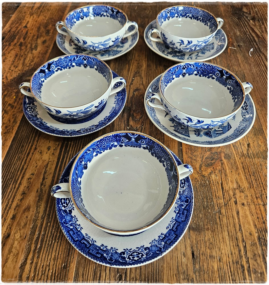 Set of 5x Soup bowls with mismatched saucers. (Soup bowls are Burleigh Ware in Willow pattern, Saucers are different makes). 1 saucer looks damaged, but seems to be a fault under the glaze.