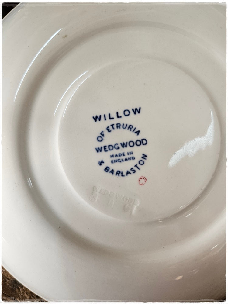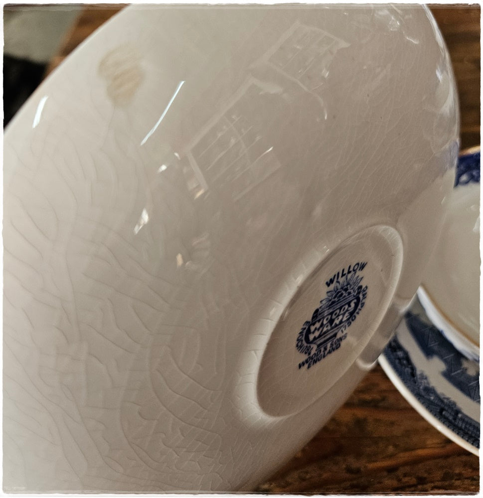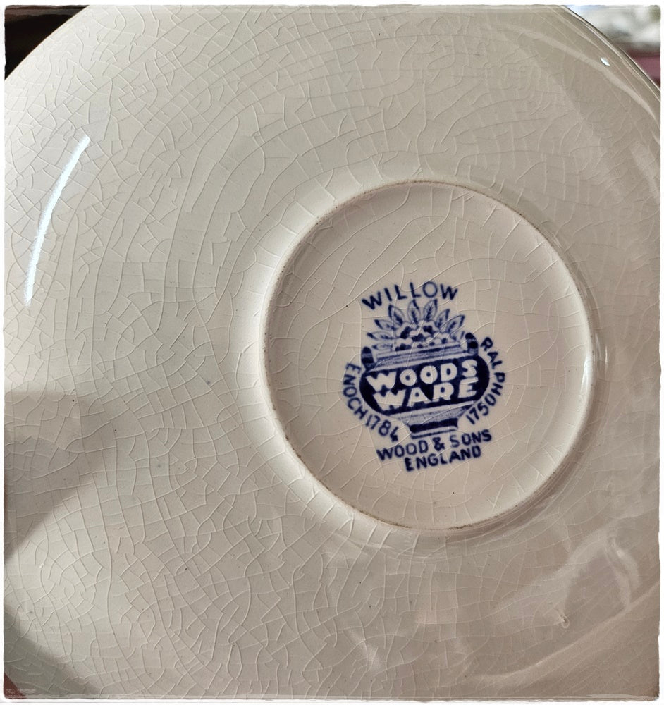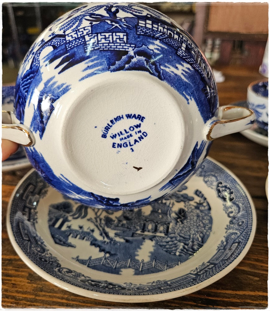 Set of 5x Soup bowls with mismatched saucers. (Soup bowls are Burleigh Ware in Willow pattern, Saucers are different makes). 1 saucer looks damaged, but seems to be a fault under the glaze.