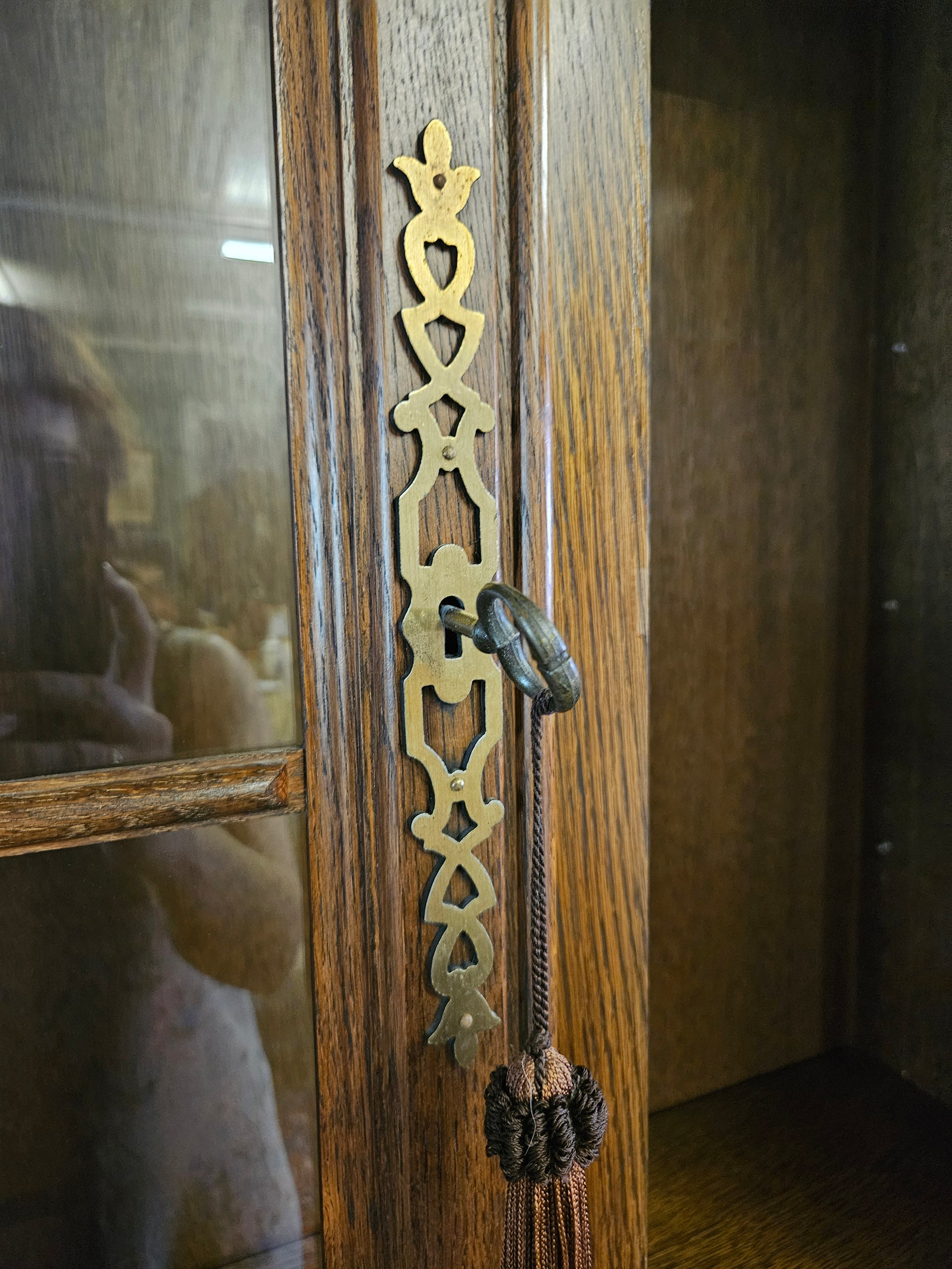 Beautiful solid Oak cabinet in excellent condition. Top and bottom doors lock. Shelves are removable.