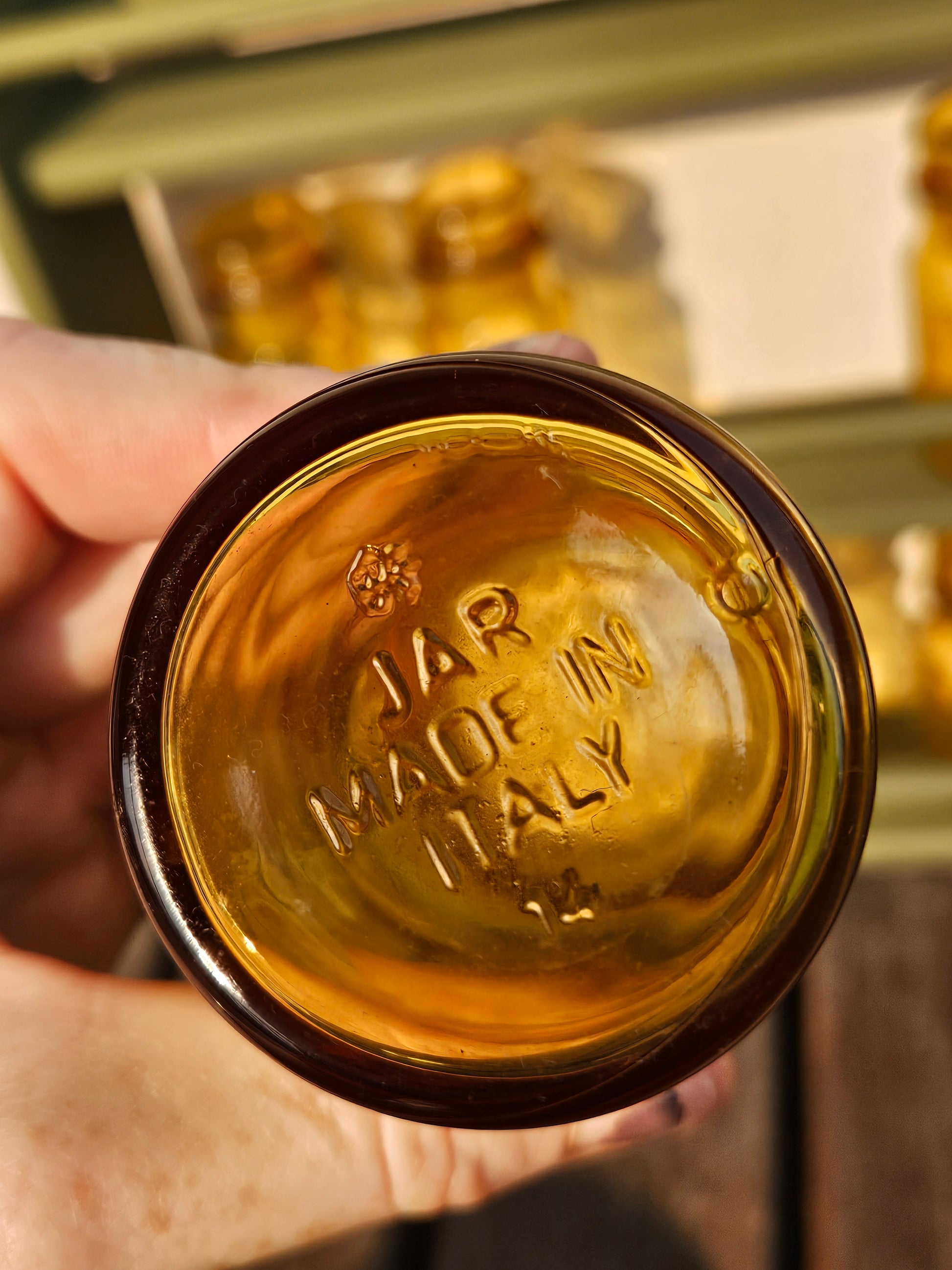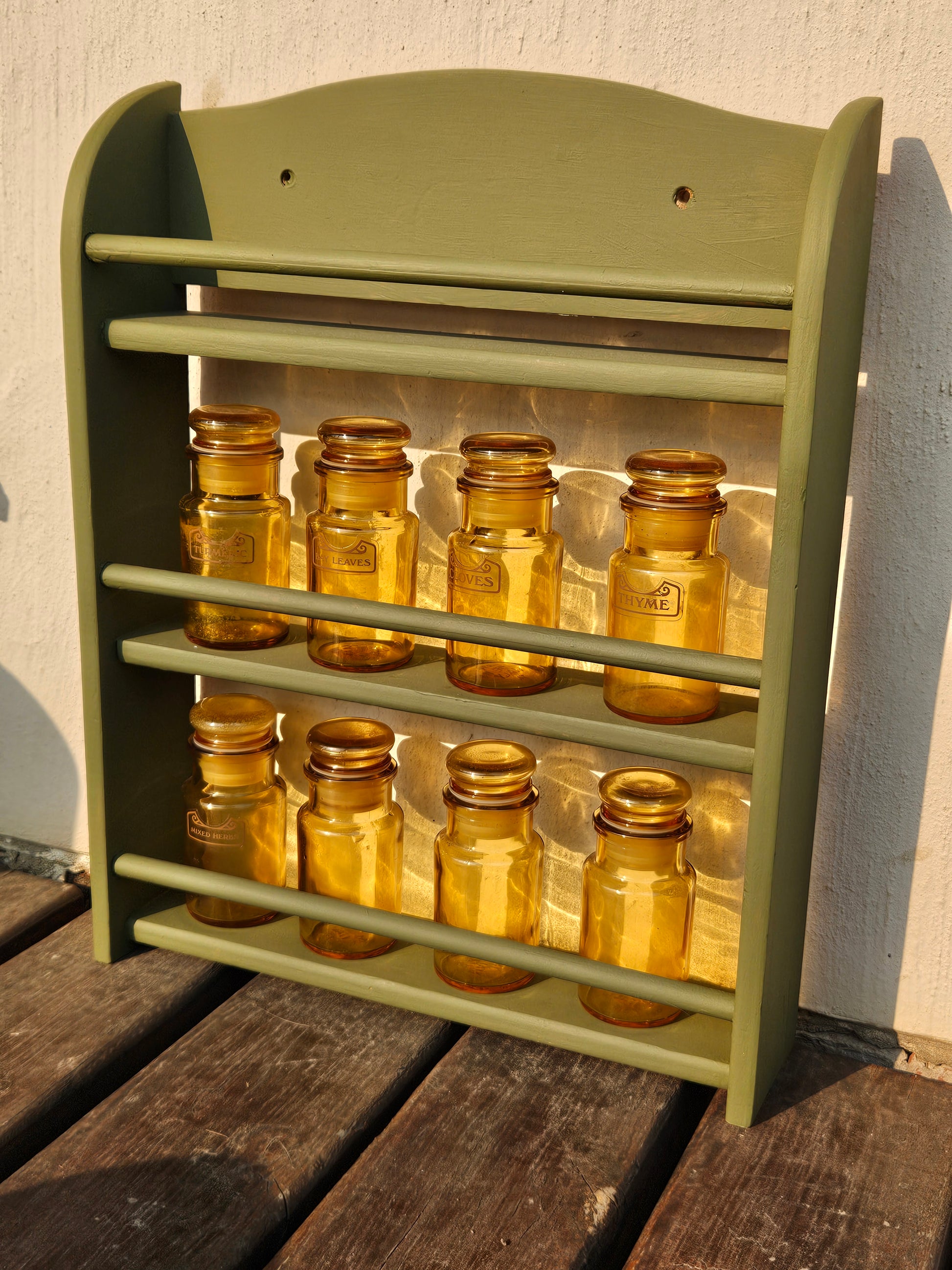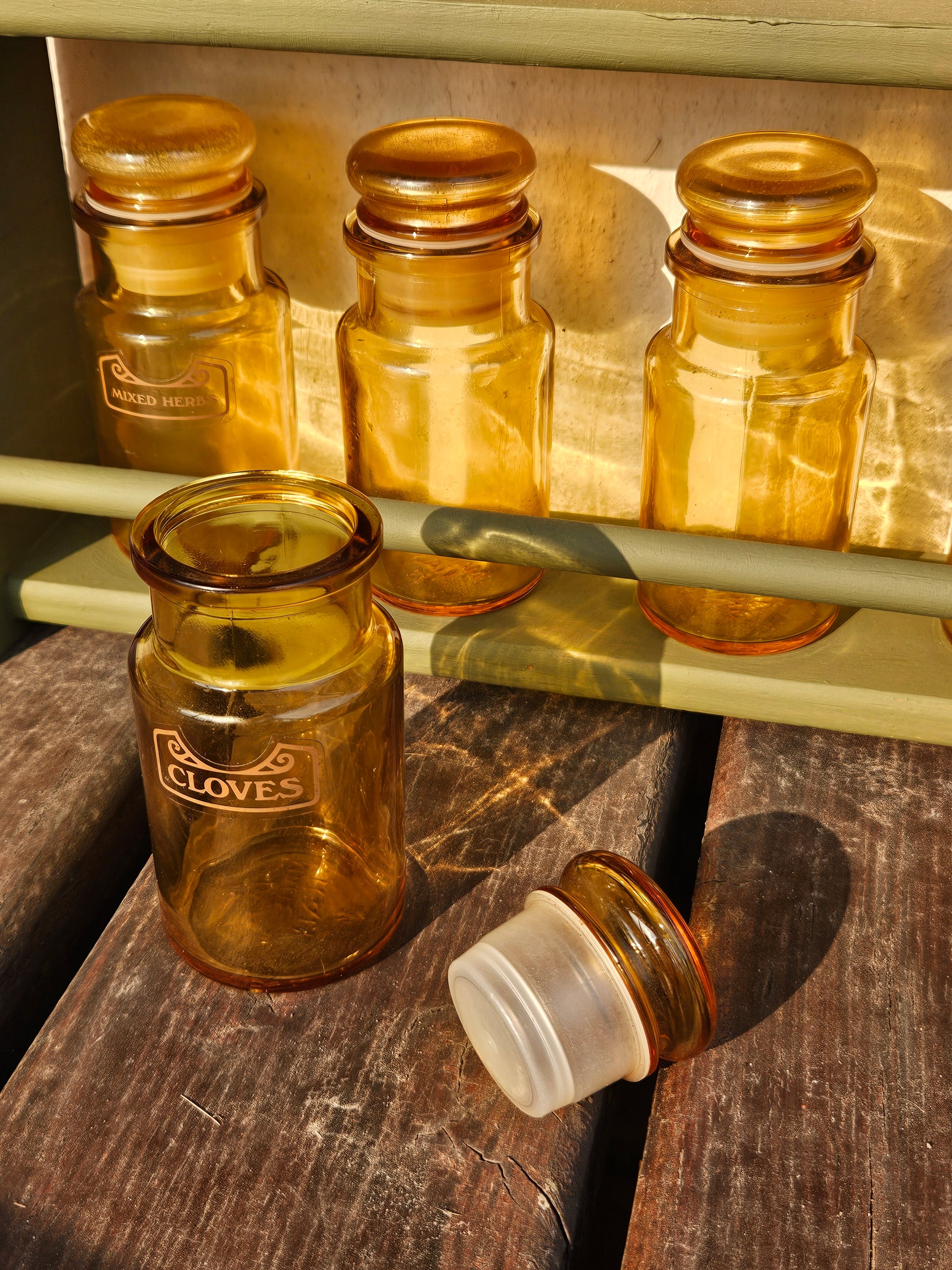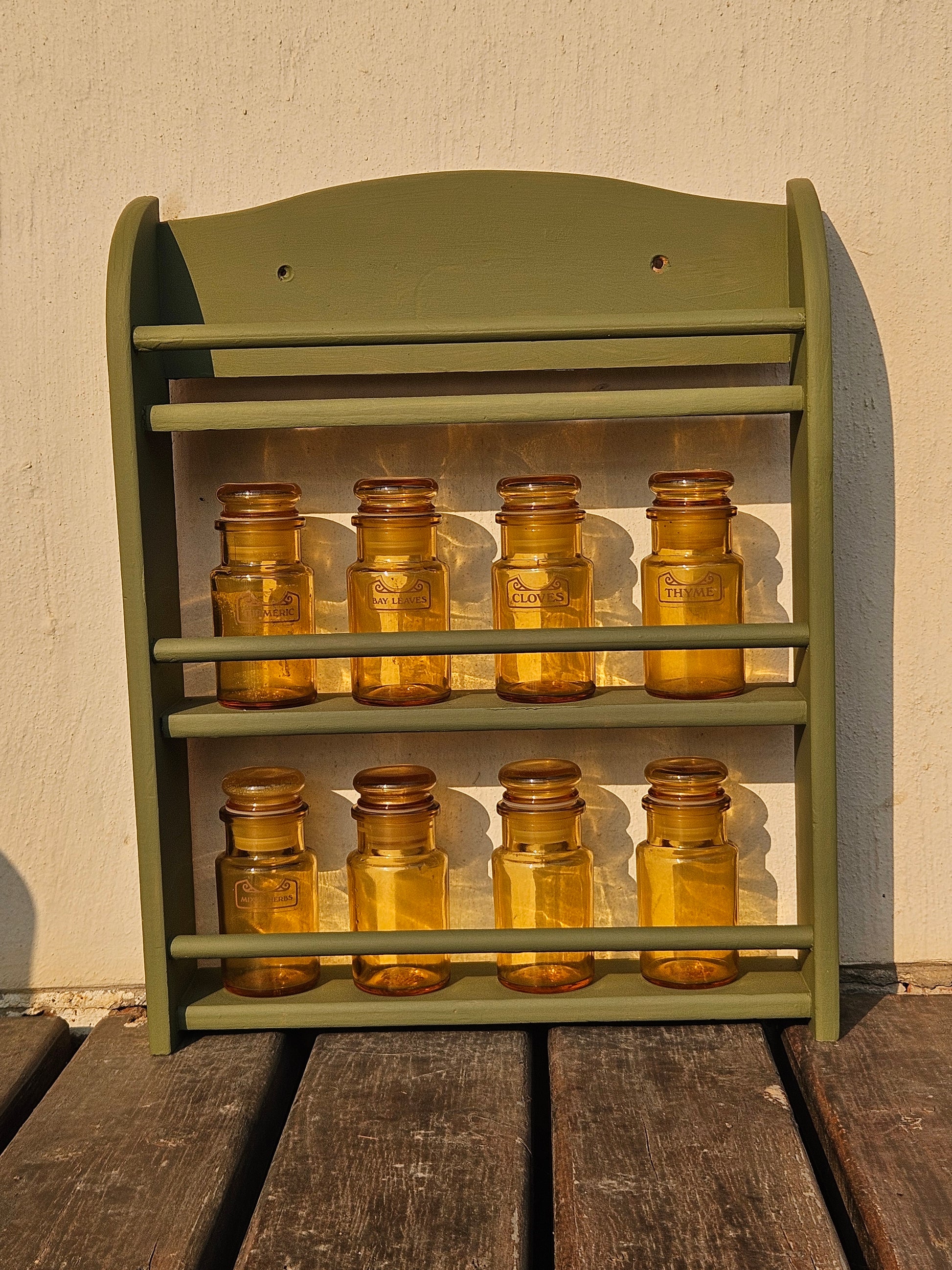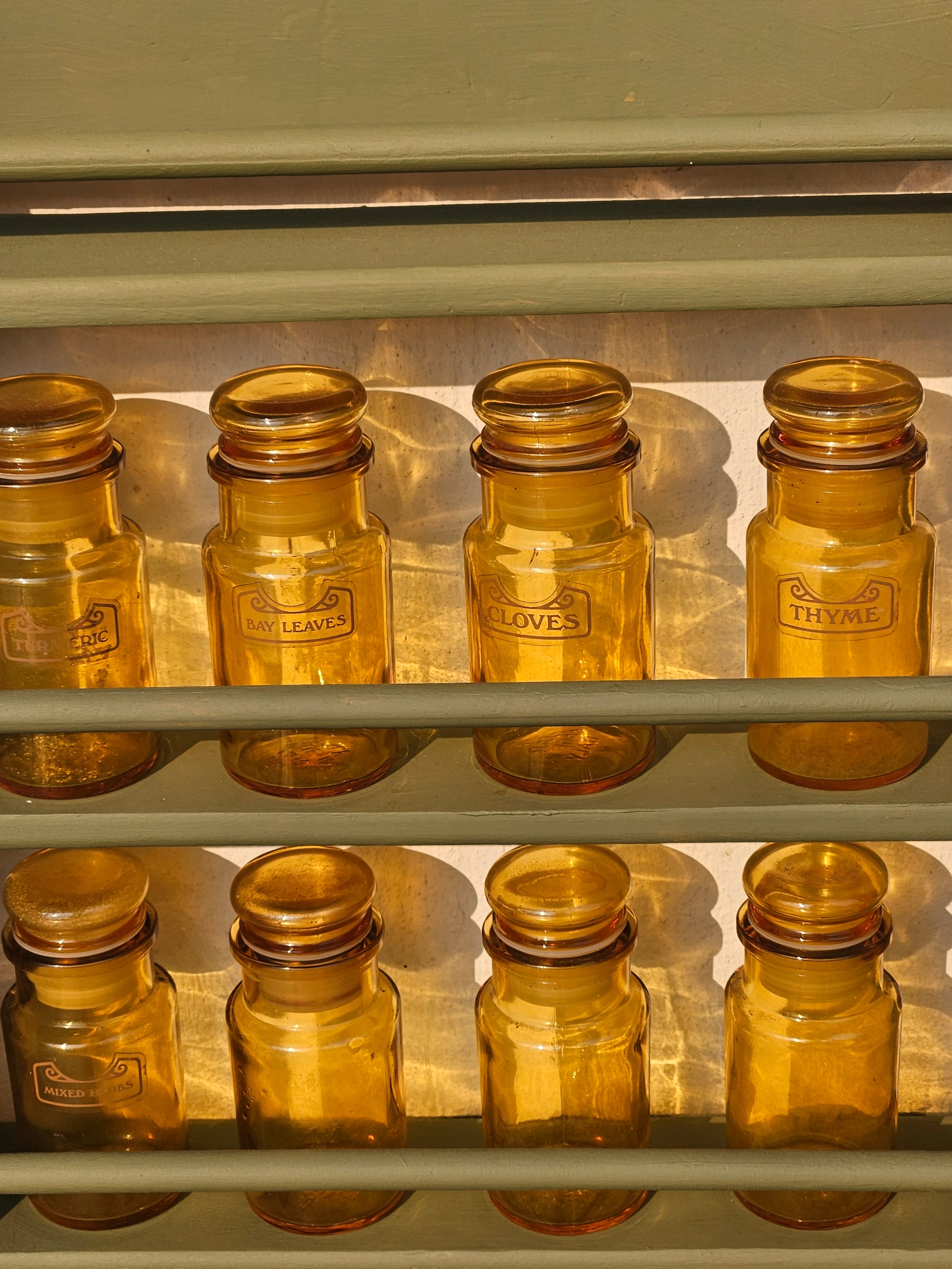 Set of 8 Spice bottles on rack. Bottles are vintage amber glass made in Italy.