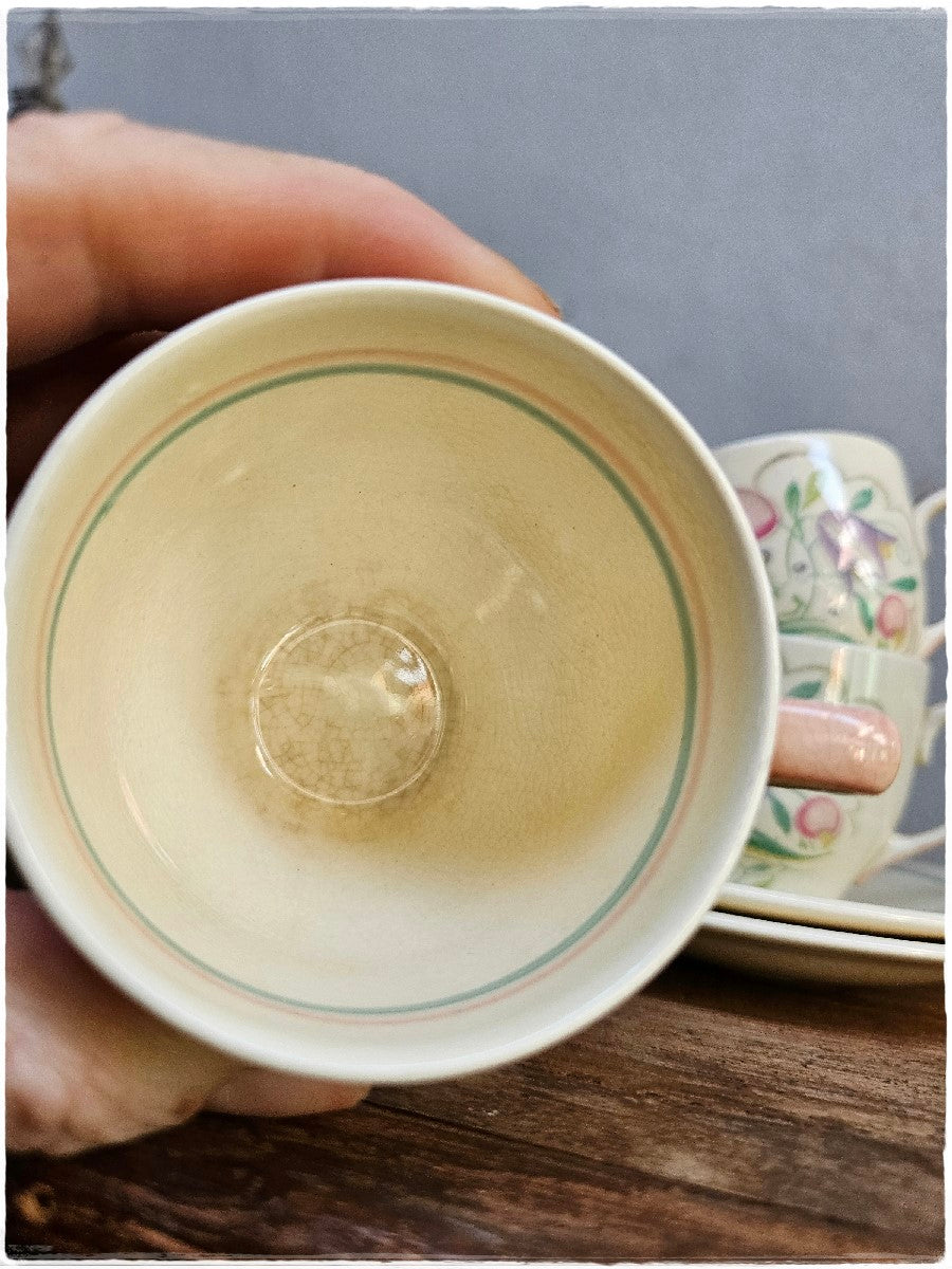 Part of a Suzie Cooper Coffee set, including 4 cups and saucers, coffee pot and sugar bowl. Sadly the coffee pot has a chip to the inside, but otherwise still useable and a beautiful example of this stylish brand. Please see pics for indication of condition.