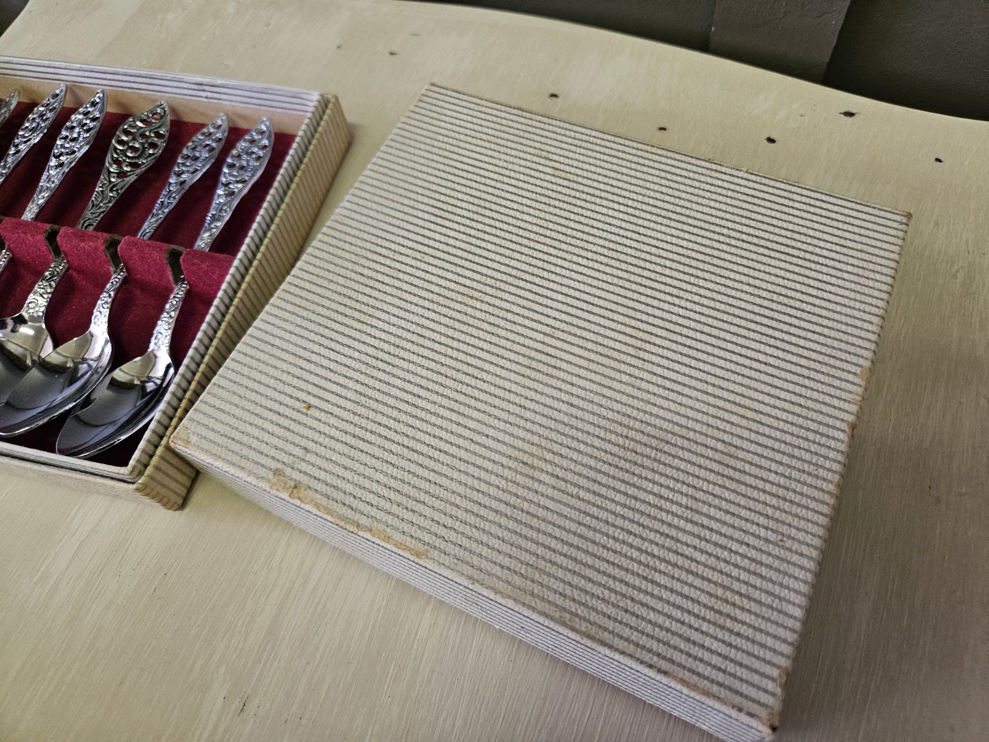 Matching sets of cake forks and teaspoons, 6 of each in original boxes.