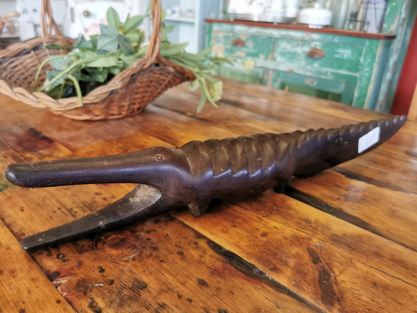 Wooden crocodile figurine. Seems to be carved from one single piece of wood.