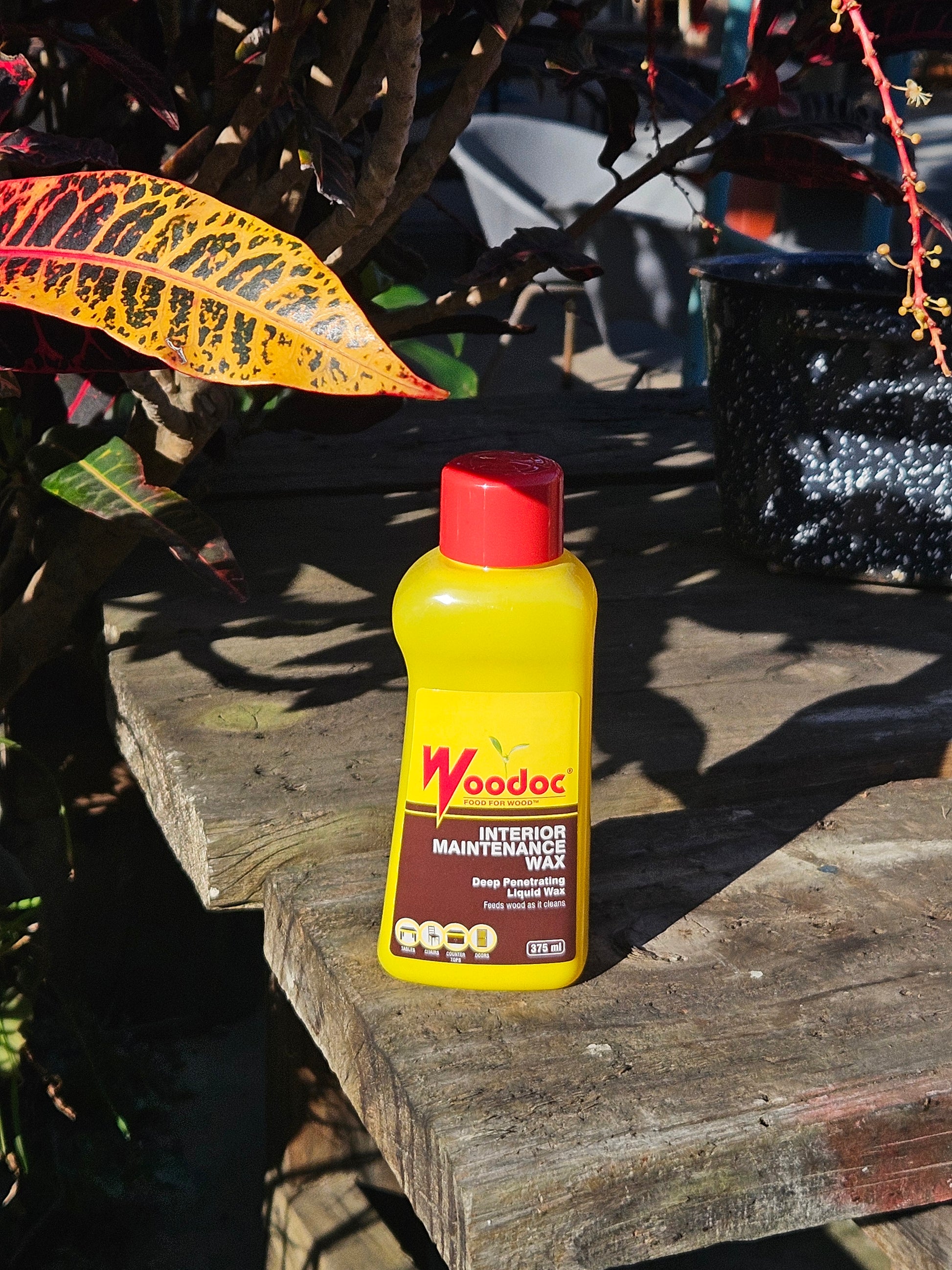 Woodoc interior maintenance wax. Deep penetrating liquid wax for wood. "feeds wood as it cleans". 375ml.